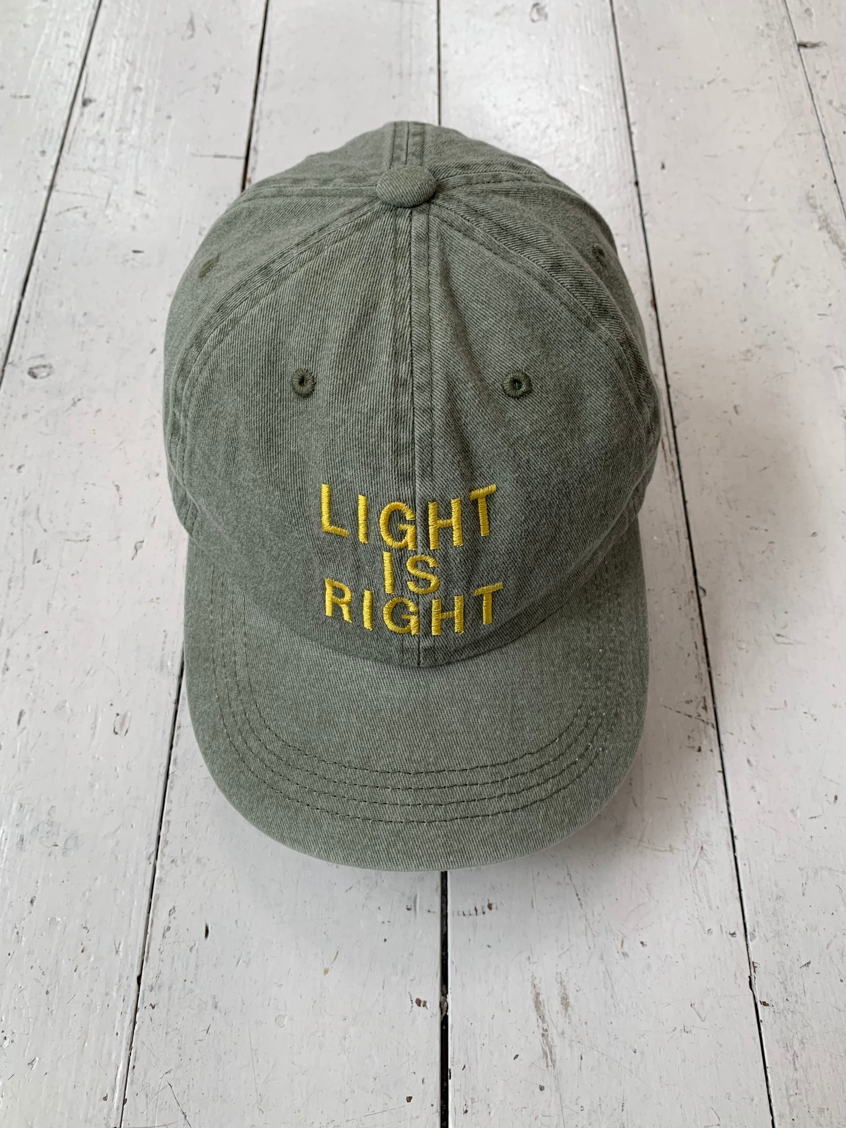 コットンツイル生地を顔料染めし、洗いをかけ風合い良く仕上げたピグメントキャップ。 正面にはブランドコンセプトである「LIGHT IS RIGHT」の刺繍が施されています。
