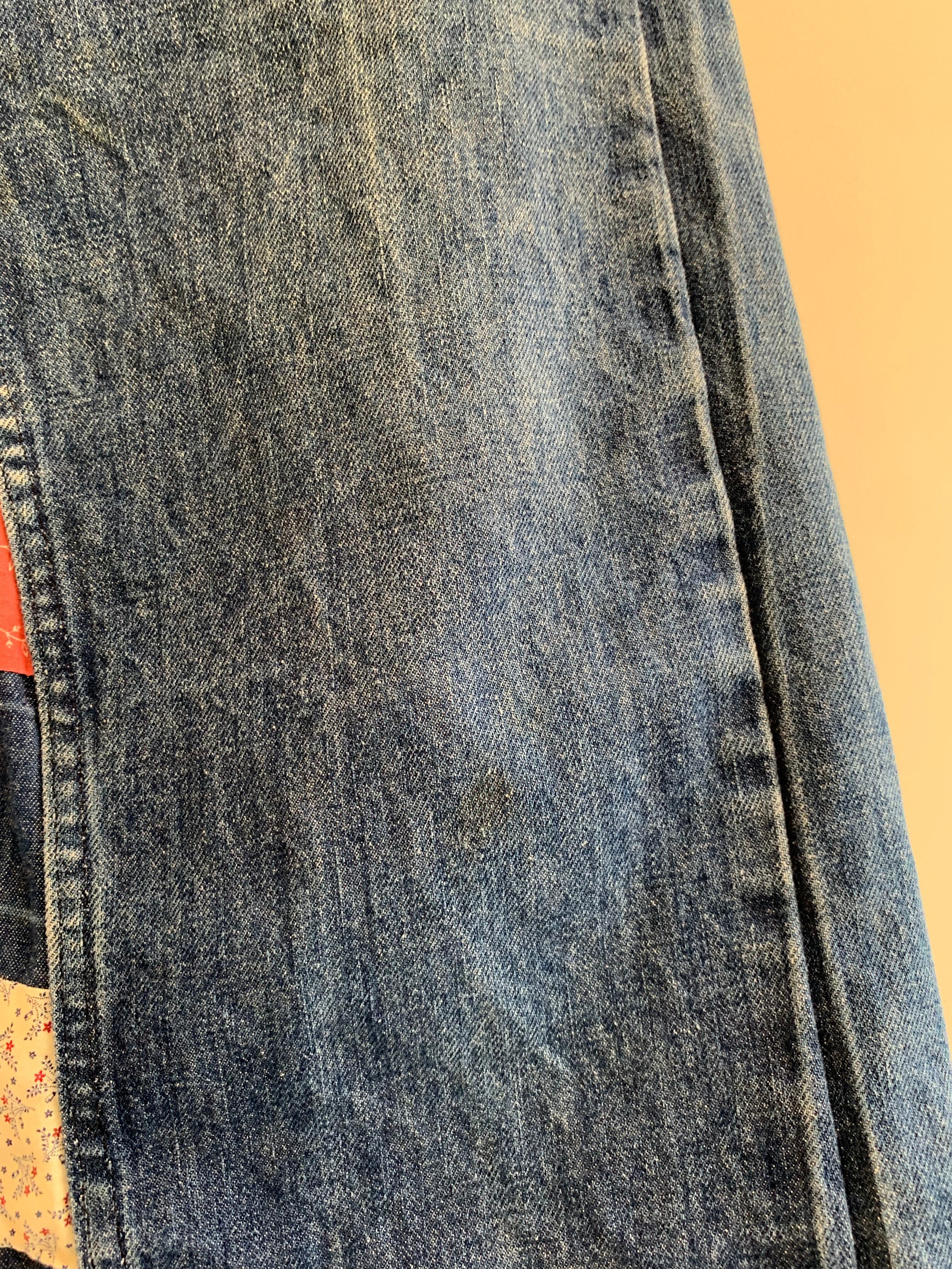 元々のデニムによく合う生地選びと配色で前の持ち主のセンスが光る1着です。