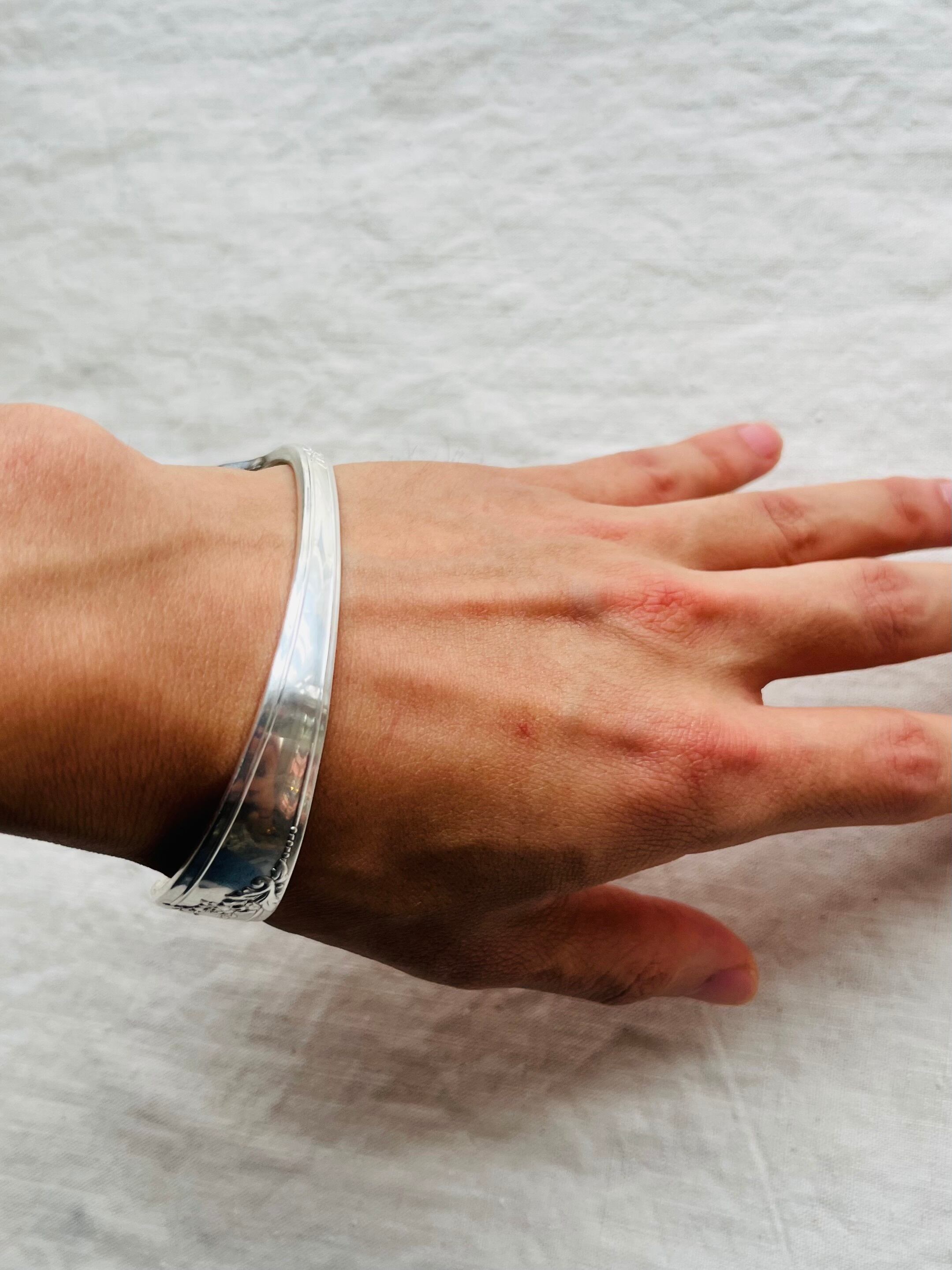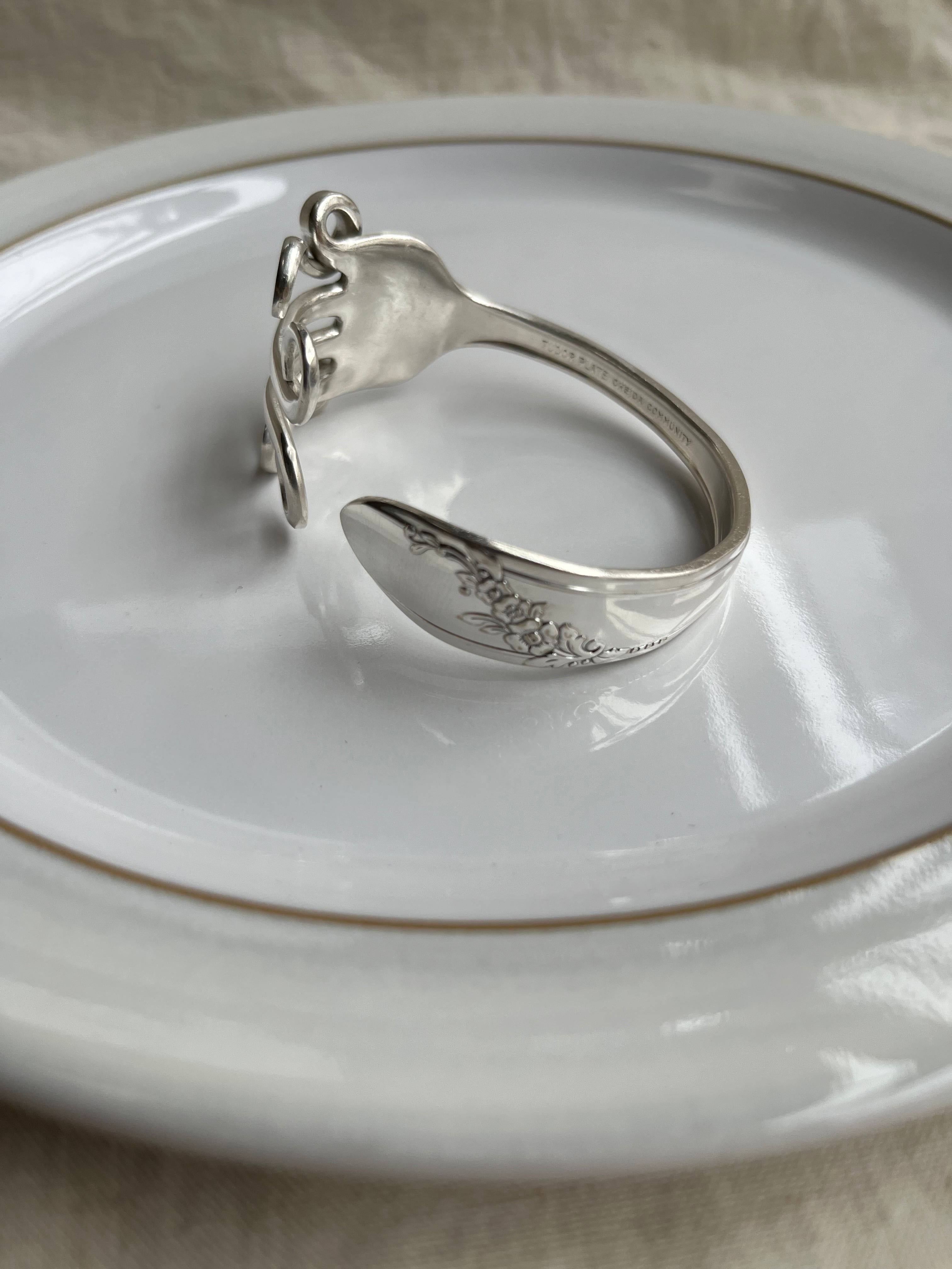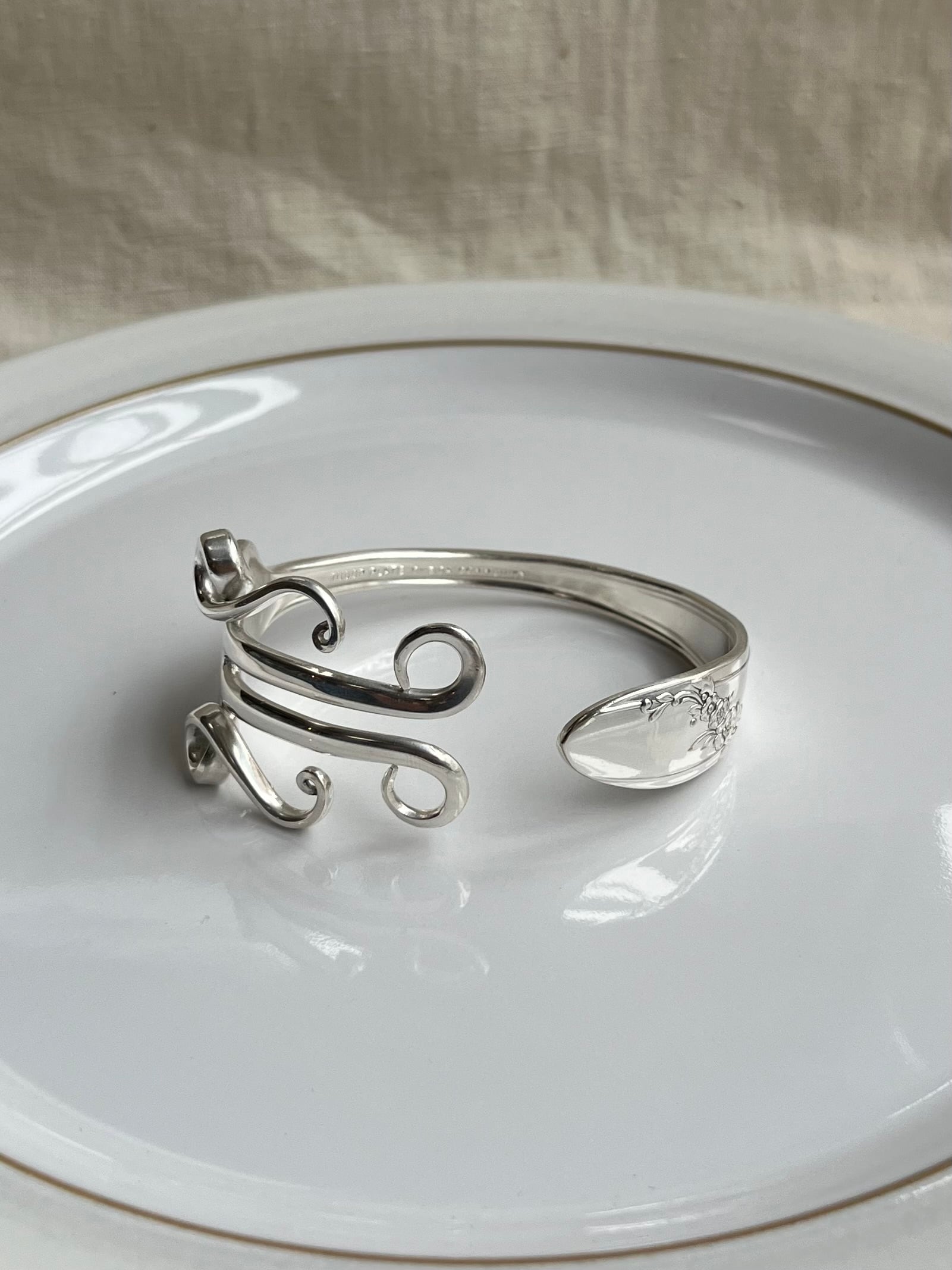 花柄の刻印が入ったフォークを曲げて作られたバングル。フォークの切っ先部分が渦の様に曲げられた特徴的で存在感のある一品。