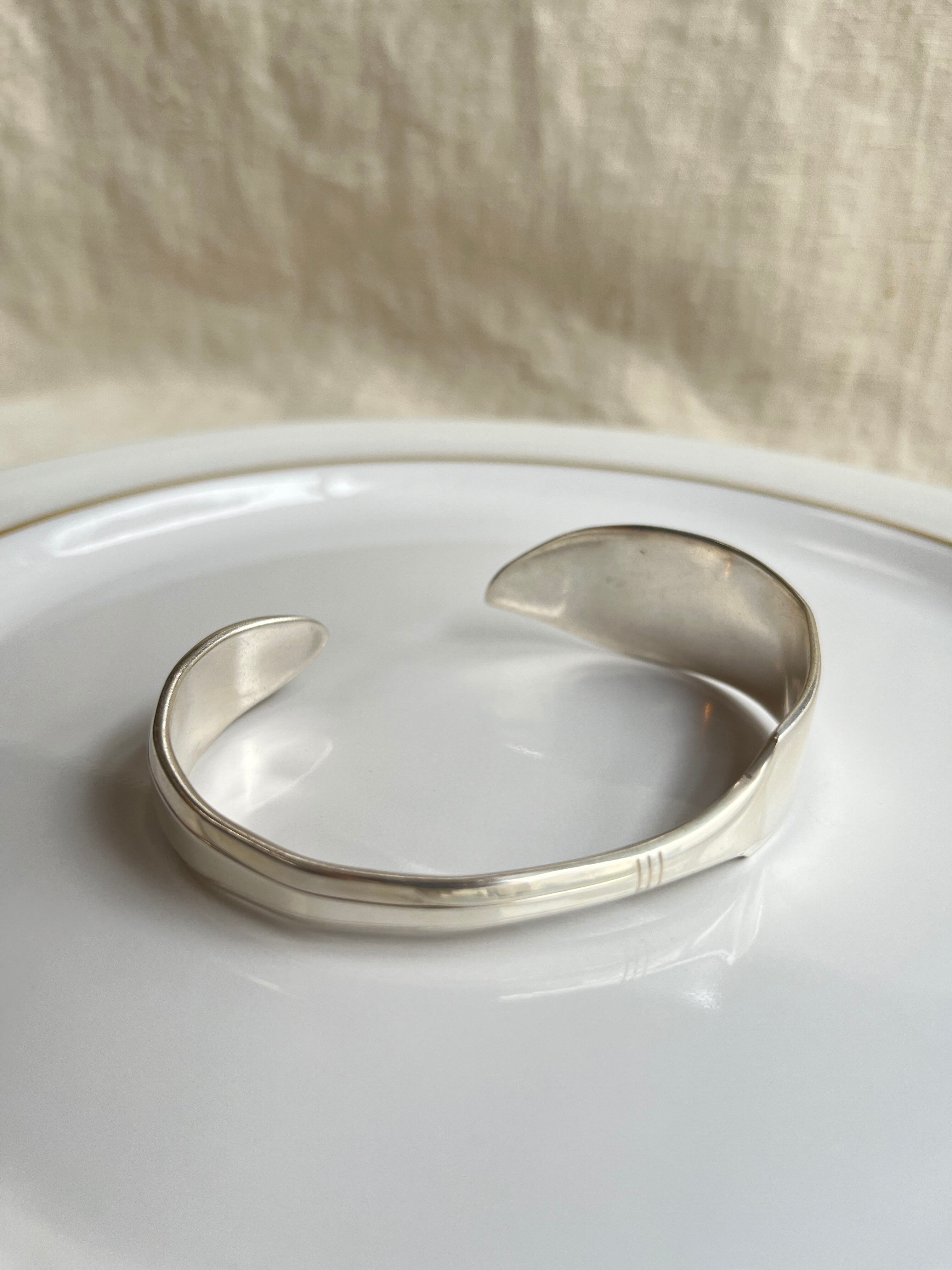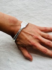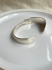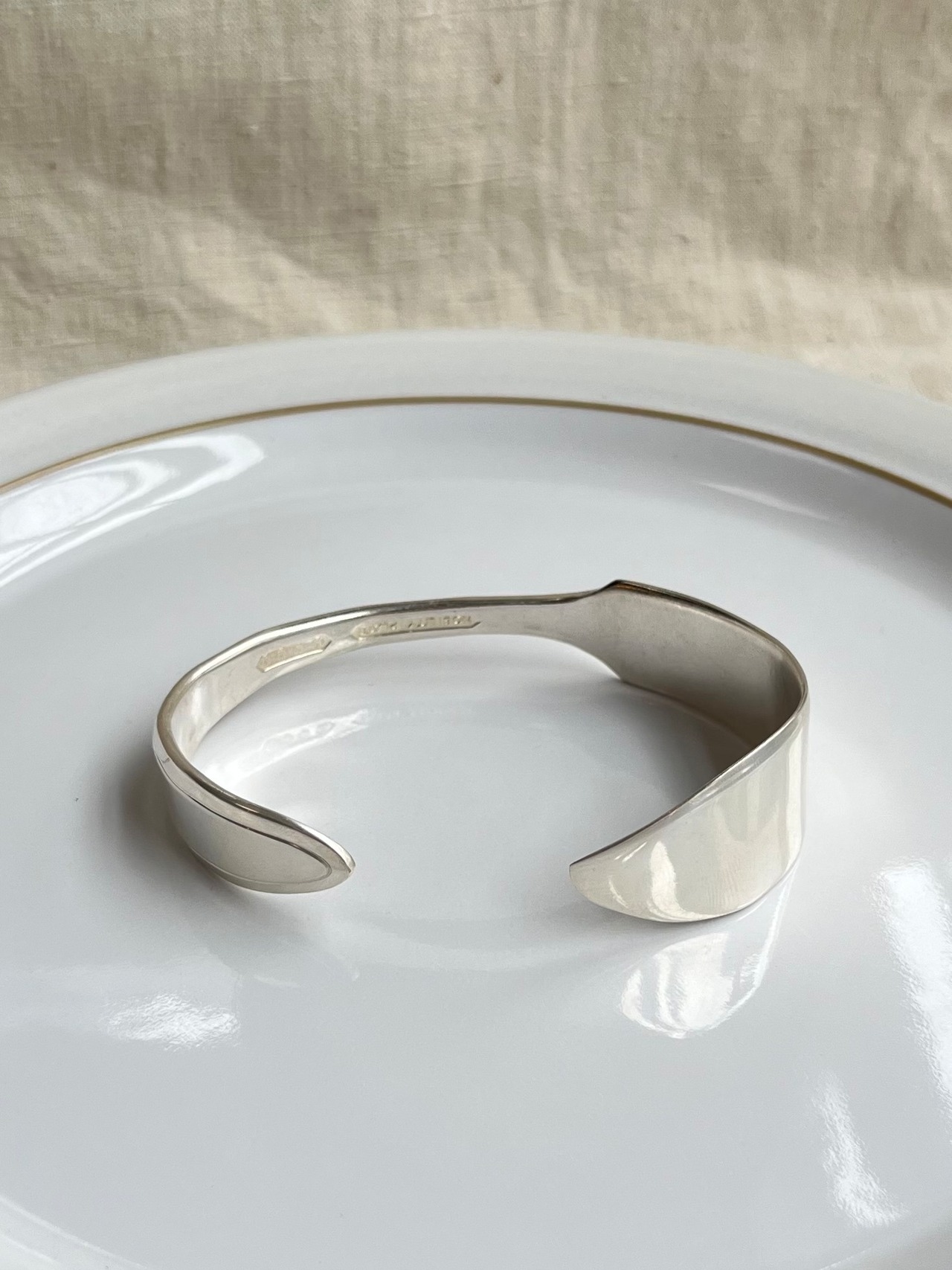 バターナイフを曲げて作られたバングル。同ブランドの中でもシンプルなデザインですが手首に付けてみると幅が広くナイフの不規則な形状が印象的な一品です。