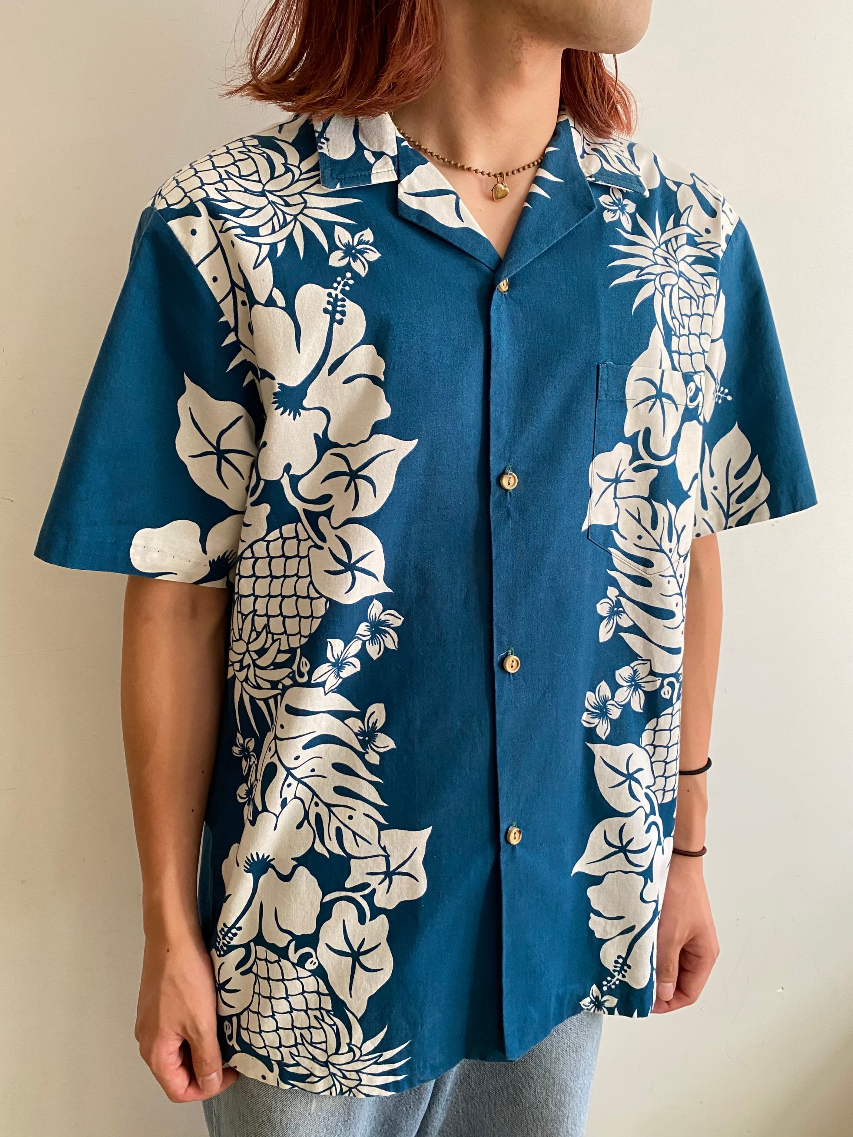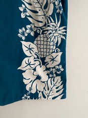 前面には両サイド、背面には中央のプリントがやり過ぎないデザインで、落ち着いた色味の青と相まって大人っぽい印象です。パイナップルとハイビスカスのプリントがとても可愛く、オープンカラーなので爽やかに着用いただけるかと思います◎