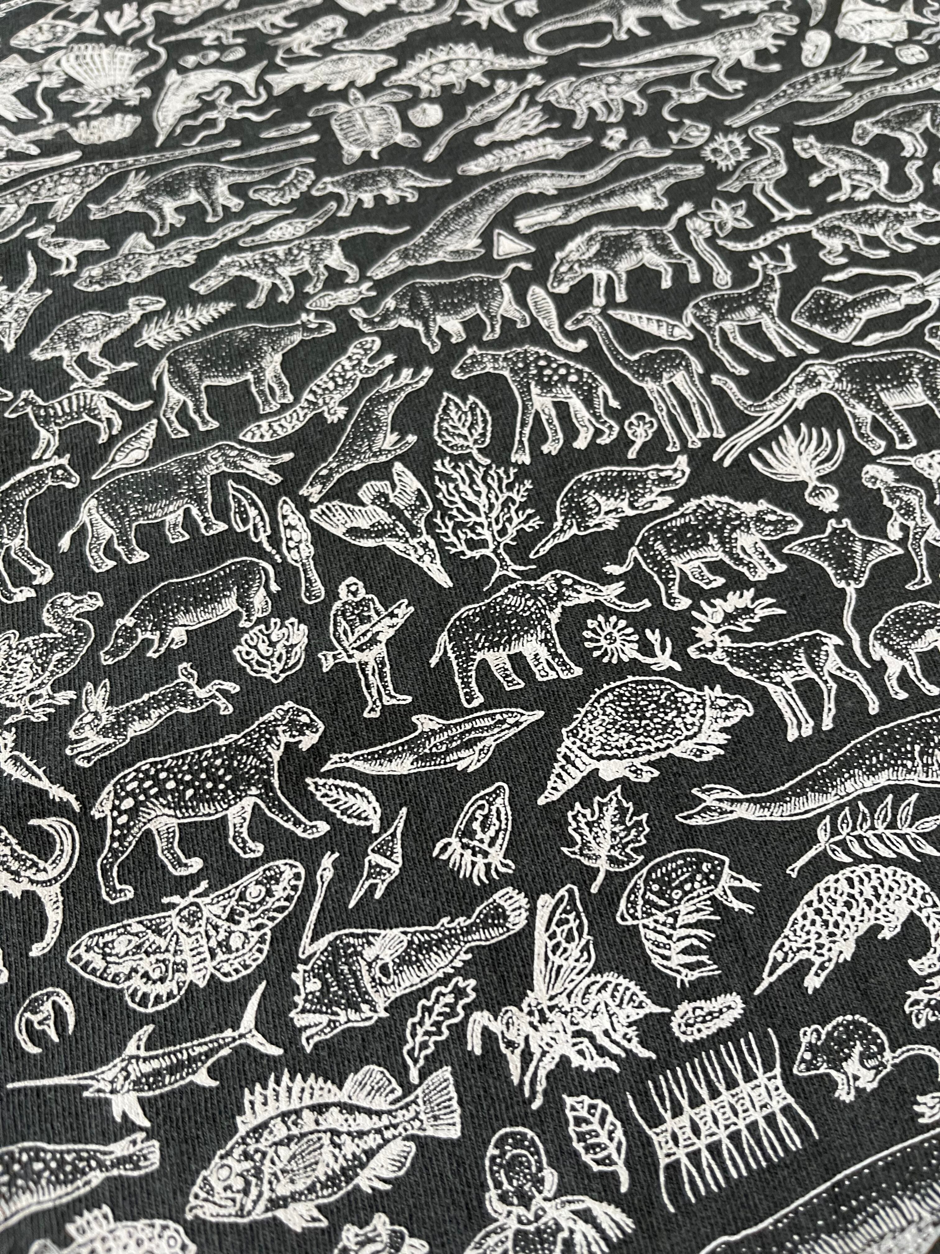 前面左胸に「進化」を意味する"EVOLVE”の文字が入ったグラフィック、背面には細かく描かれた様々な微生物、海洋生物、古生物からスケートボードに乗った人間(笑)、車???、 テレビ!!?までユーモラスな要素もあるグラフィックが大きくプリントされてます。Tシャツにはピグメント加工が施されており古着ライクなフェード感がまた雰囲気の良い一着です。