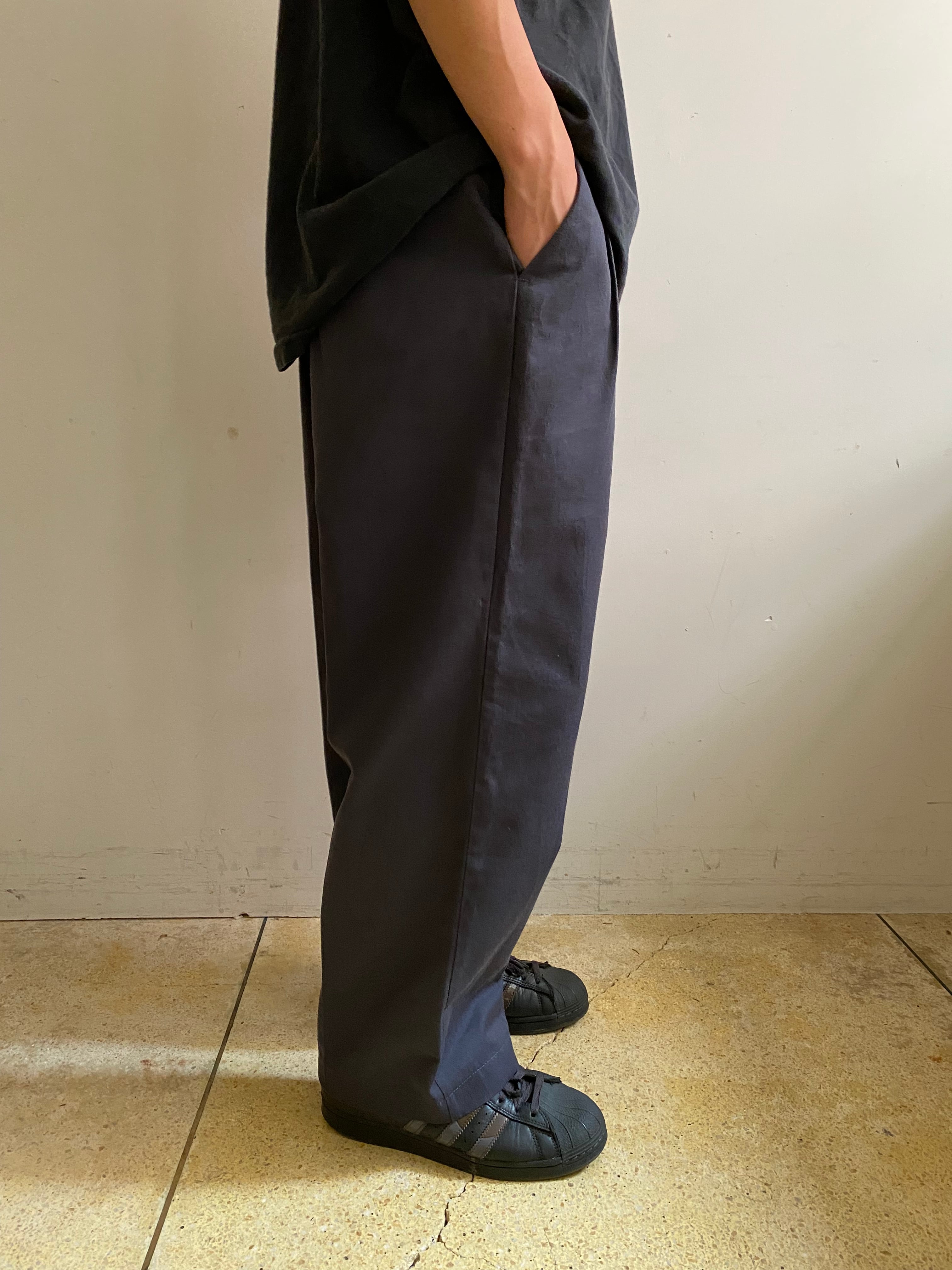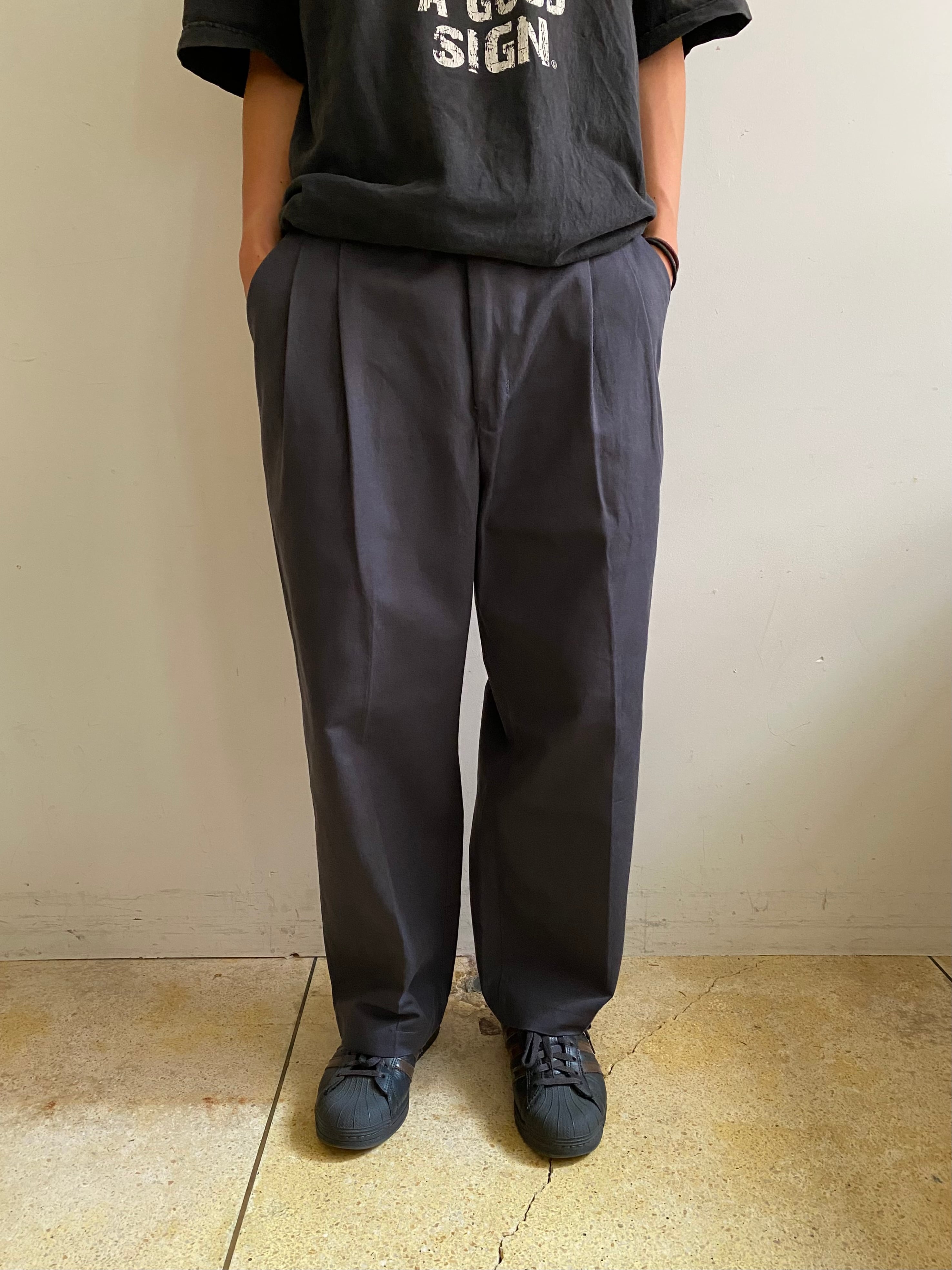 2TUCK入ったワークパンツなので無骨ながら、どこか綺麗な印象も見受けられる一本。太いストレートシルエットで様々なスタイリングに合わせやすいと思います◎