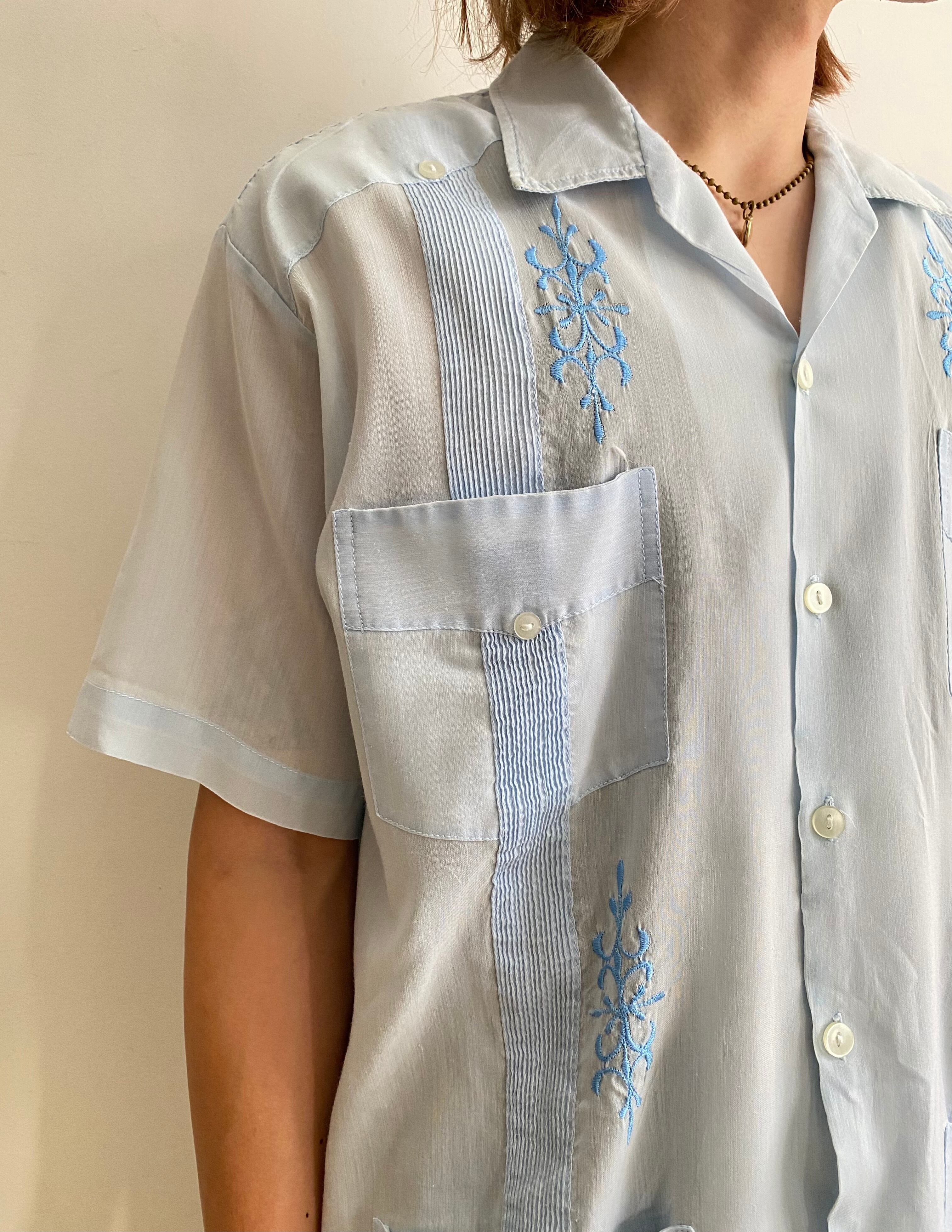 爽やかなサックスブルーで夏らしい70sキューバシャツ。幅広い方に着用いただけるサイズ感なので、まだまだ暑いこれからにいかがでしょうか!