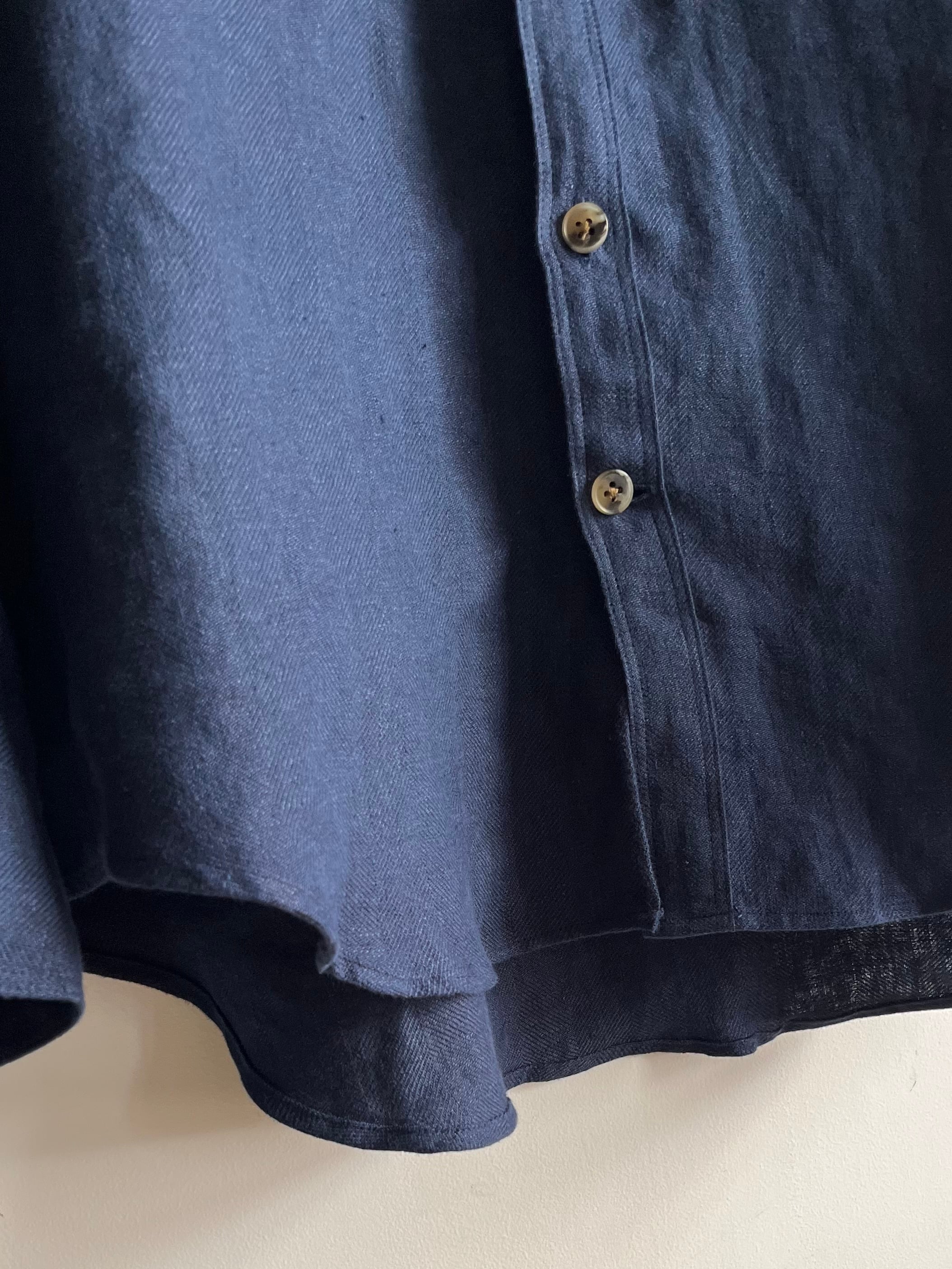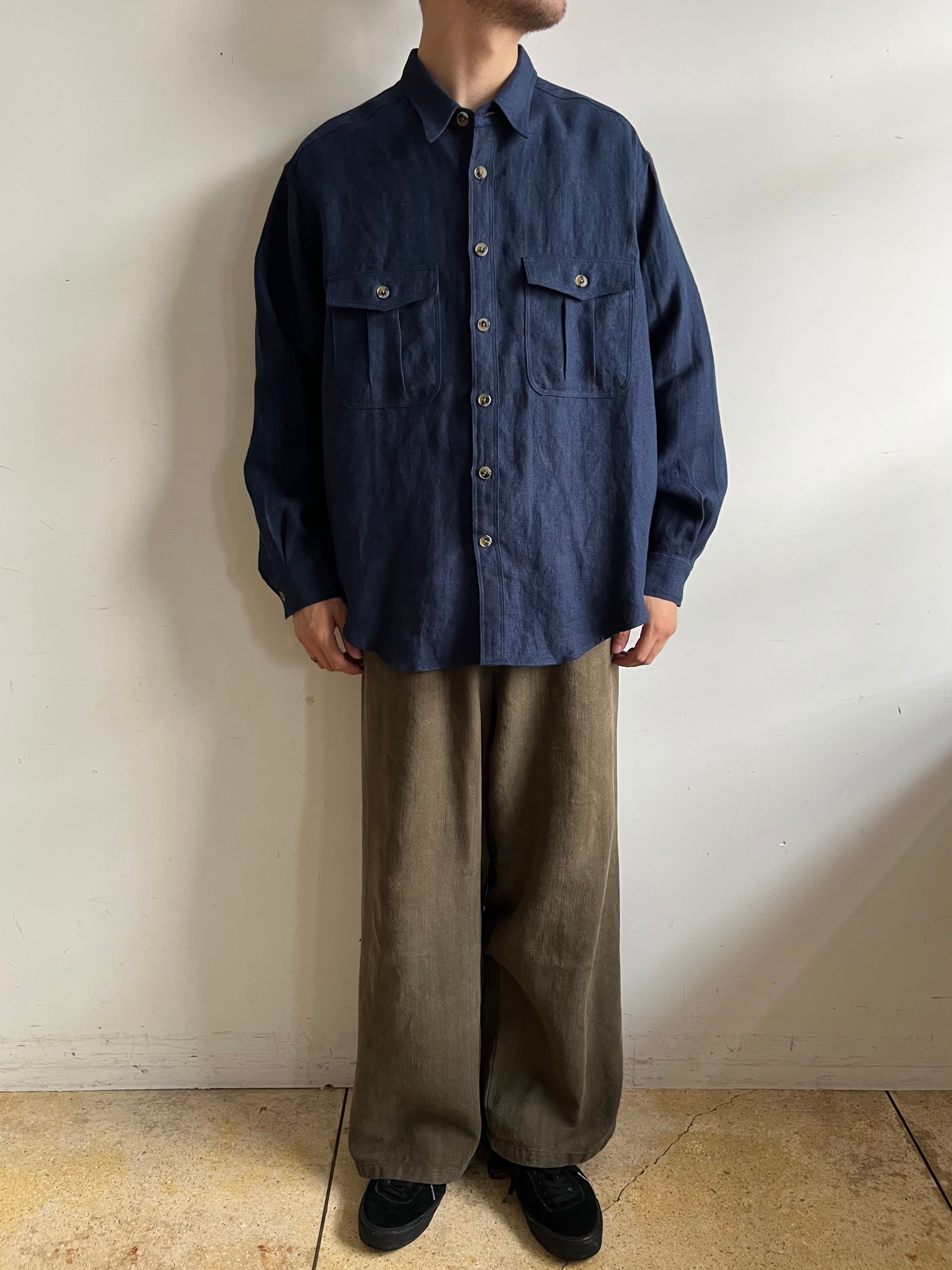 しっかりとした厚みのある麻100%へリンボーン生地を使用、とろみがありしなやかな生地感に程よいゆとりのあるシルエット、両胸にはフラップ付きのポケット。