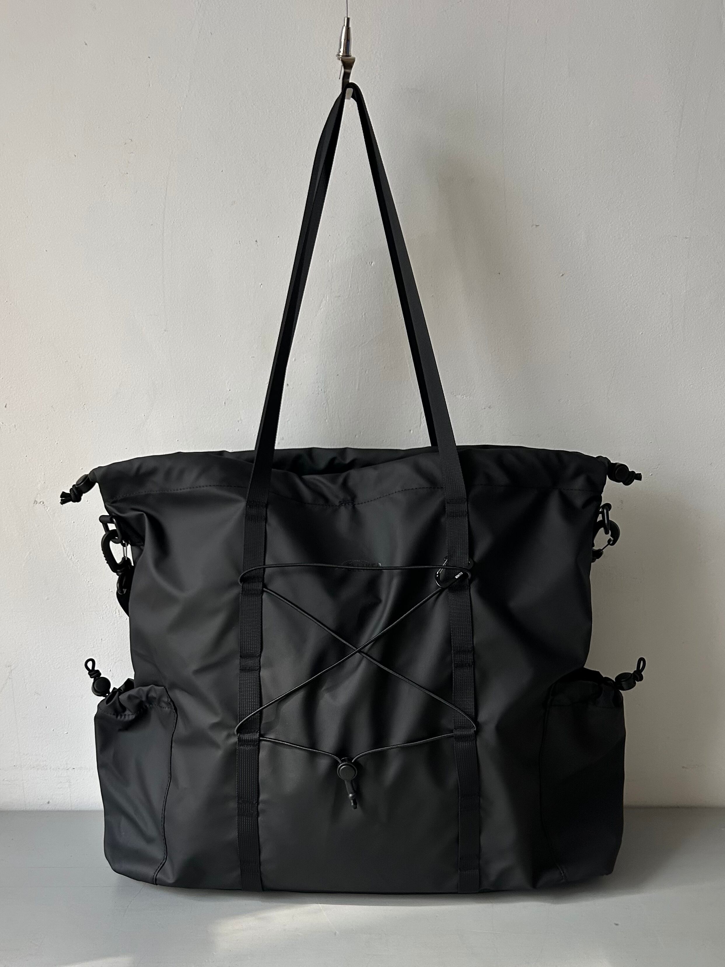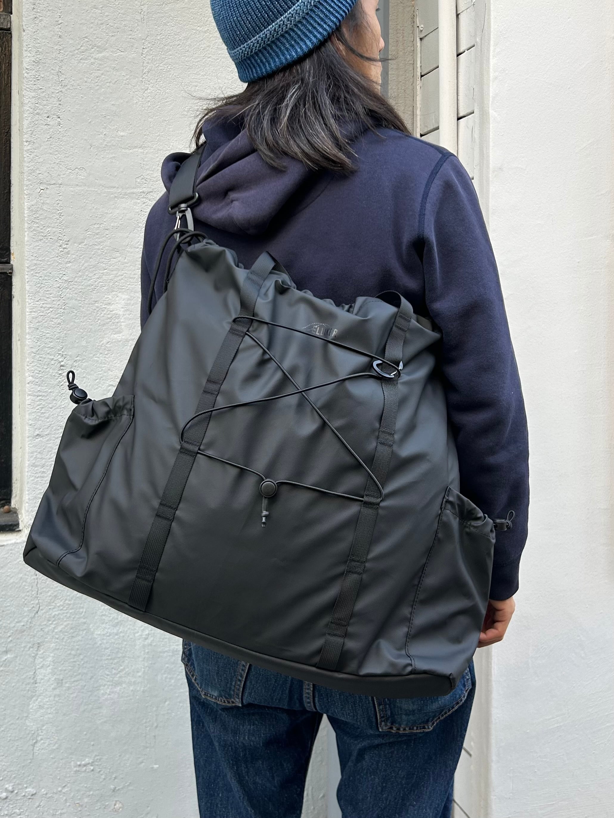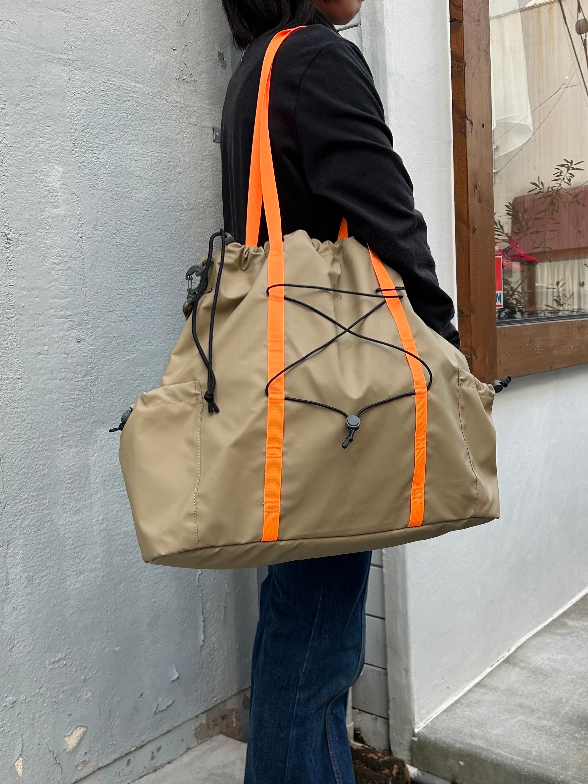 100%リサイクルポリエステルに防水PUコーティングが施された素材は軽量かつ耐久性に優れ、環境にも配慮されています。