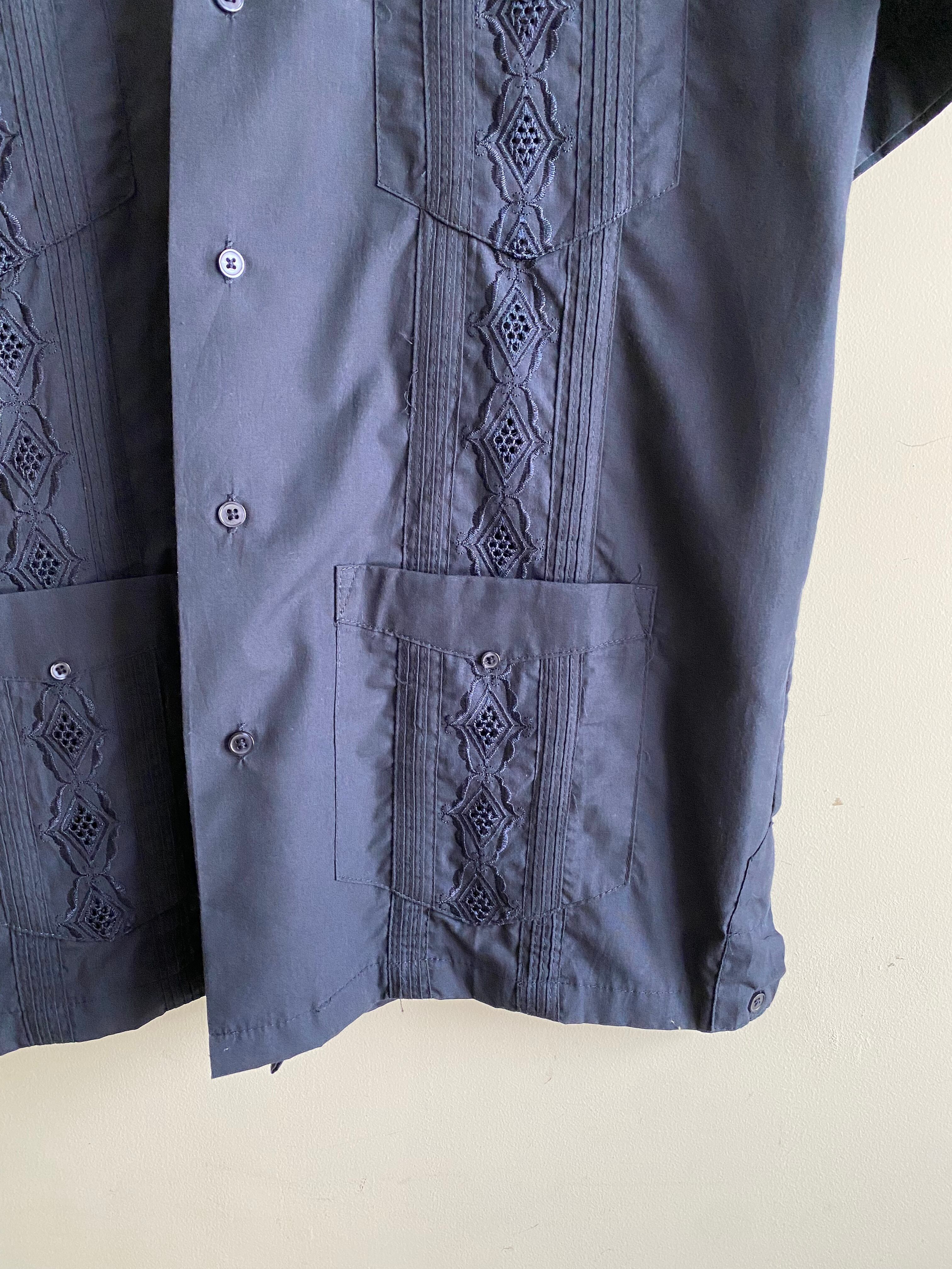 落ち着いた色味で大人っぽい印象のキューバシャツ。同色の刺繍がさりげなく洗練された印象◎