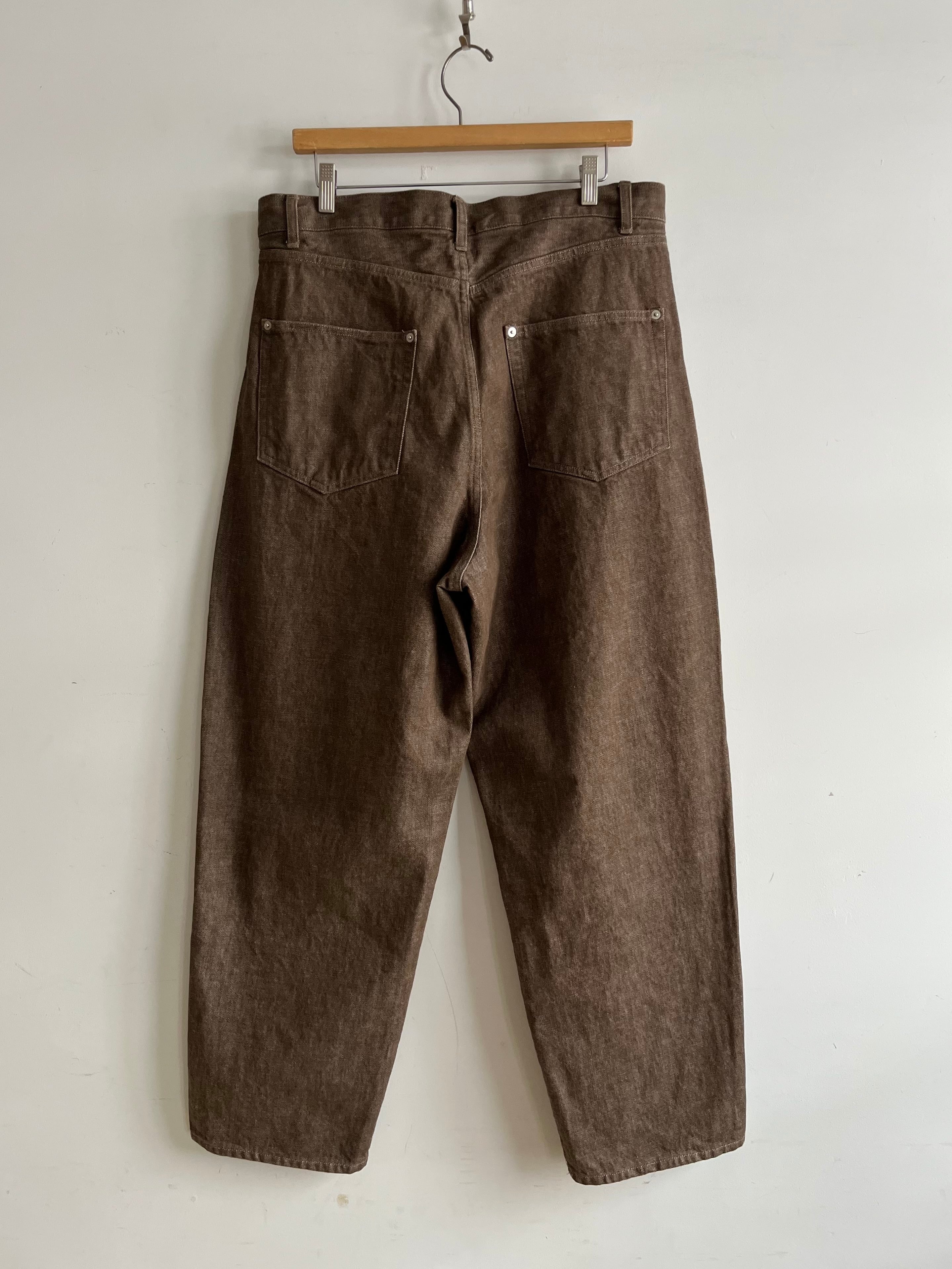 タテ糸が茶、ヨコ糸は生成りの糸を使用した珍しいブラウンカラーのデニム。江戸時代より綿、麻生地産業の歴史がある広島県福山市にて見つかった生機生地を使用。製品洗い、乾燥済みなため13オンスのしっかりとした厚みでありながら柔らかな肌触りです。