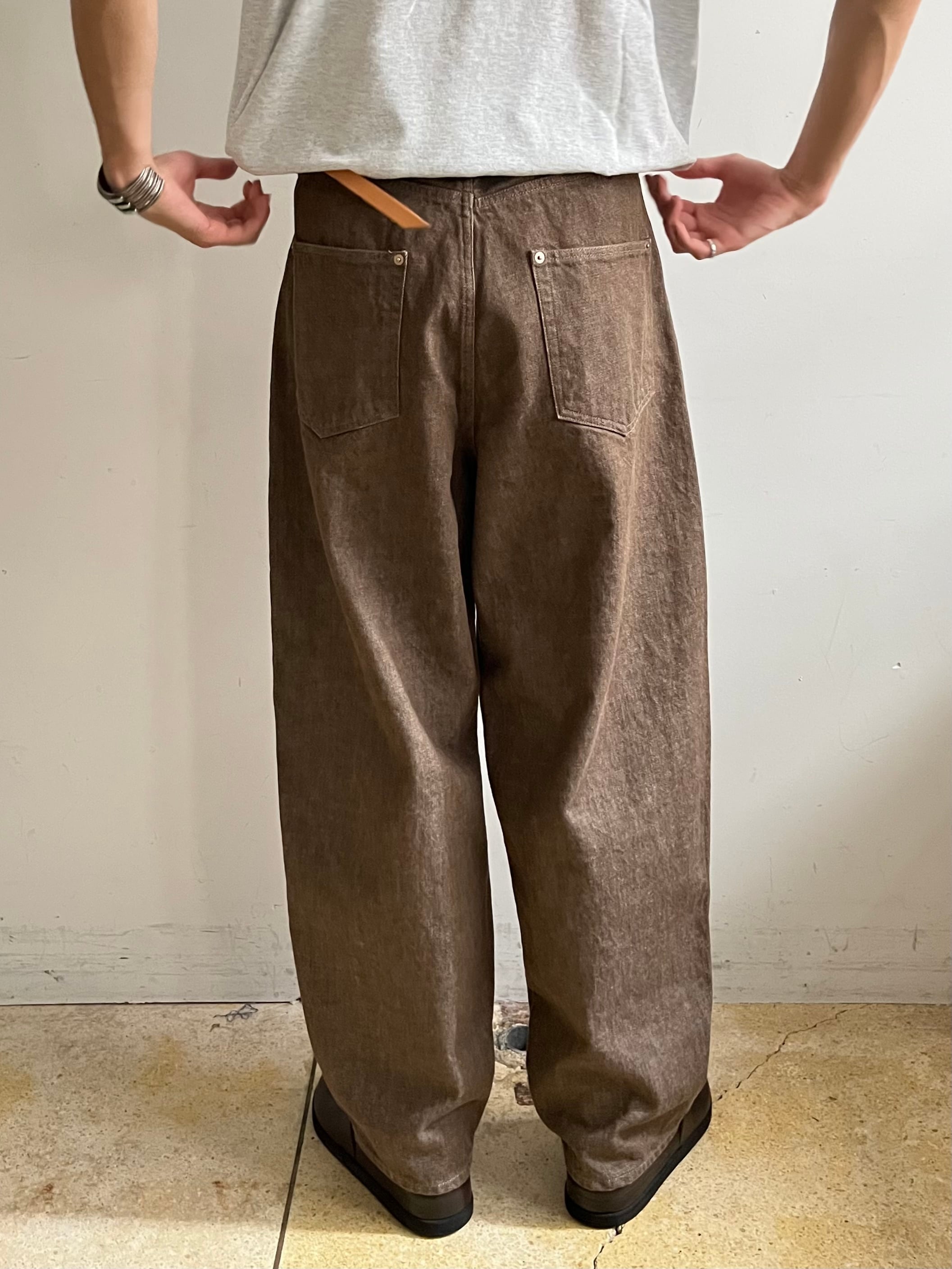 ゆったりとしたパターンワークで作られており、1(S)サイズでウエスト約33インチほど、ブランド曰く大き目のデニムをベルトで絞って穿く設計との事、ひざ下から裾にかけてやや細くなっておりでウエストを絞って穿くことでひざ下あたりからふくらみがあるバレルデニム感のあるシルエットです。
