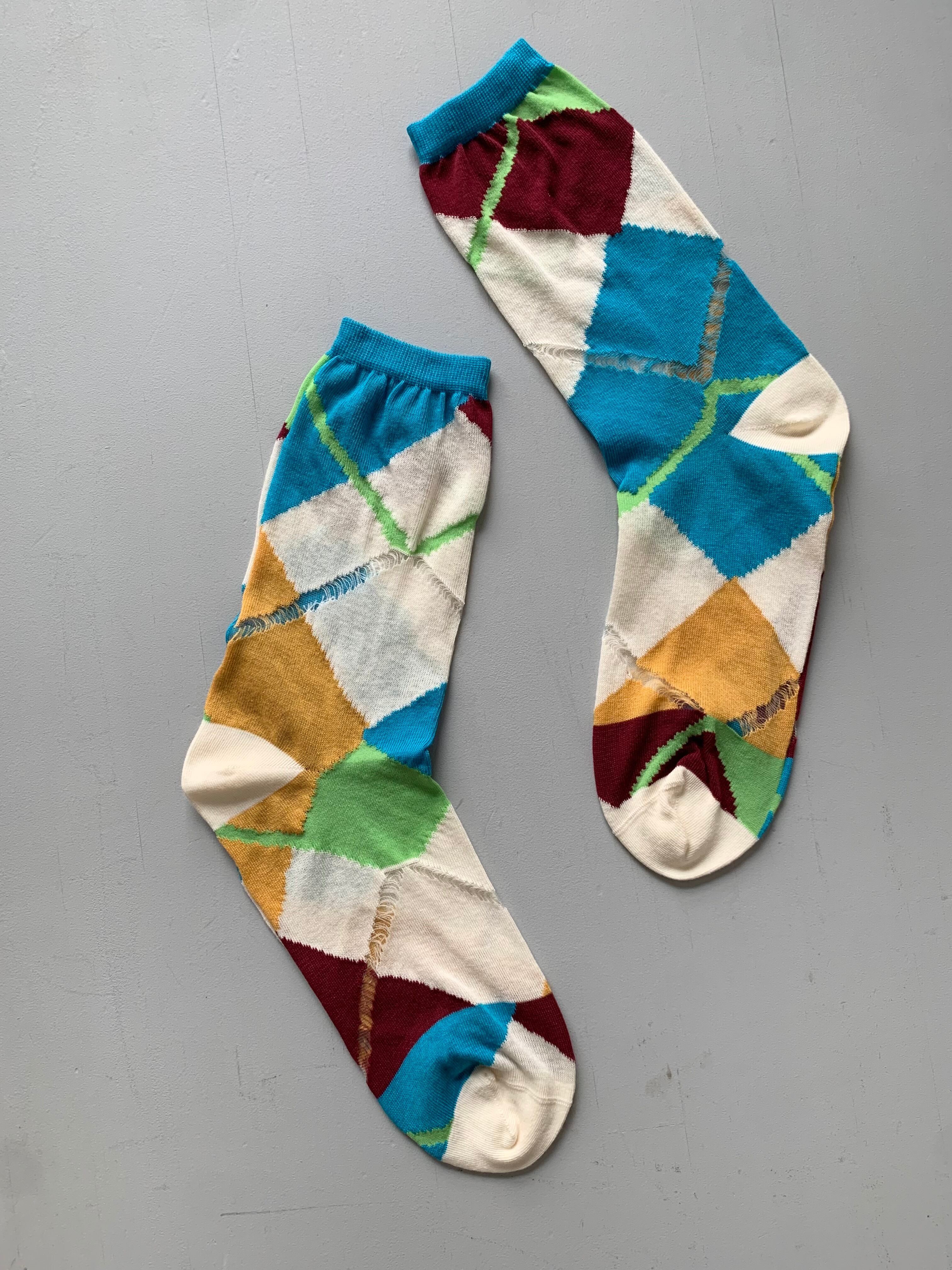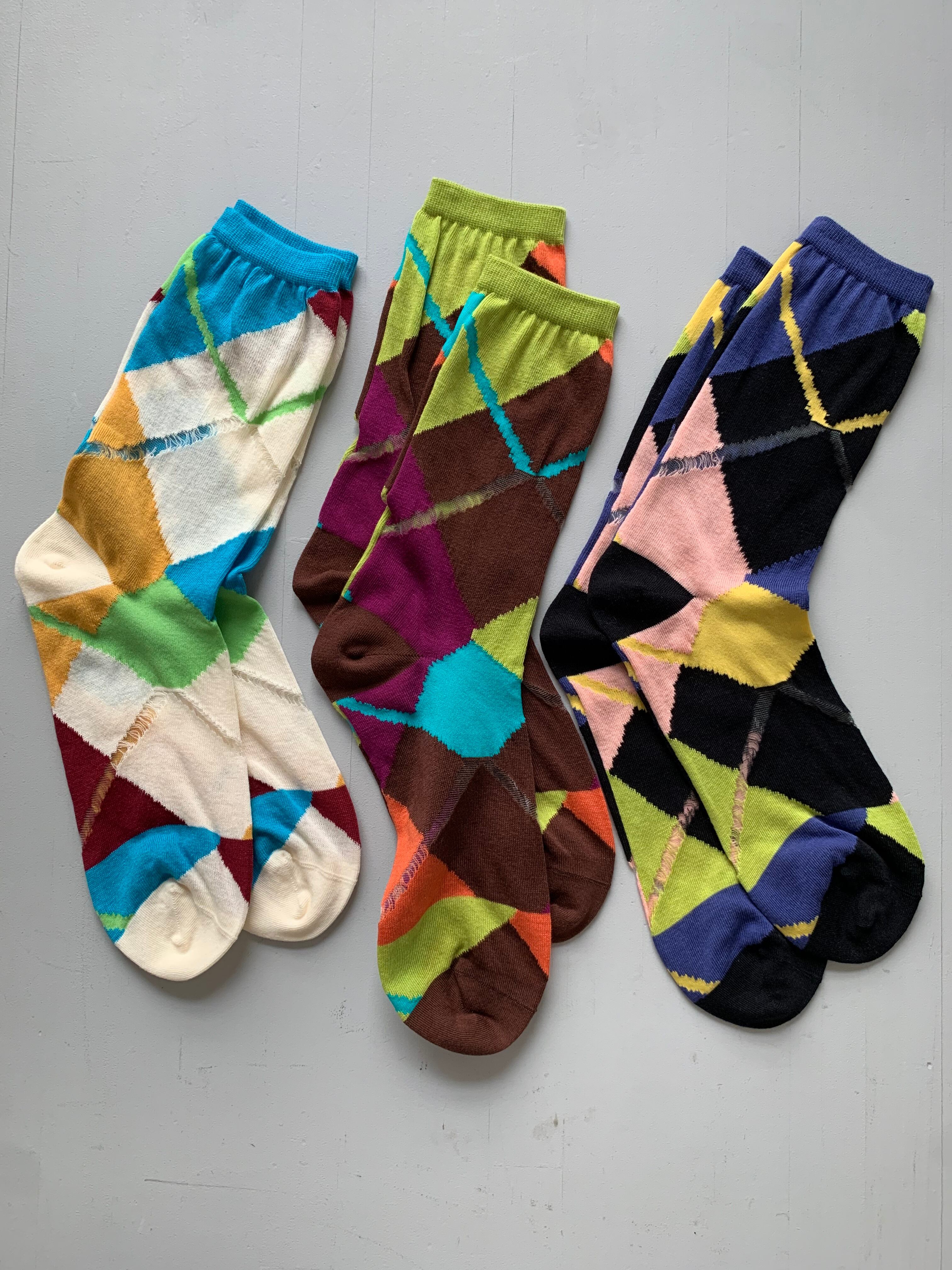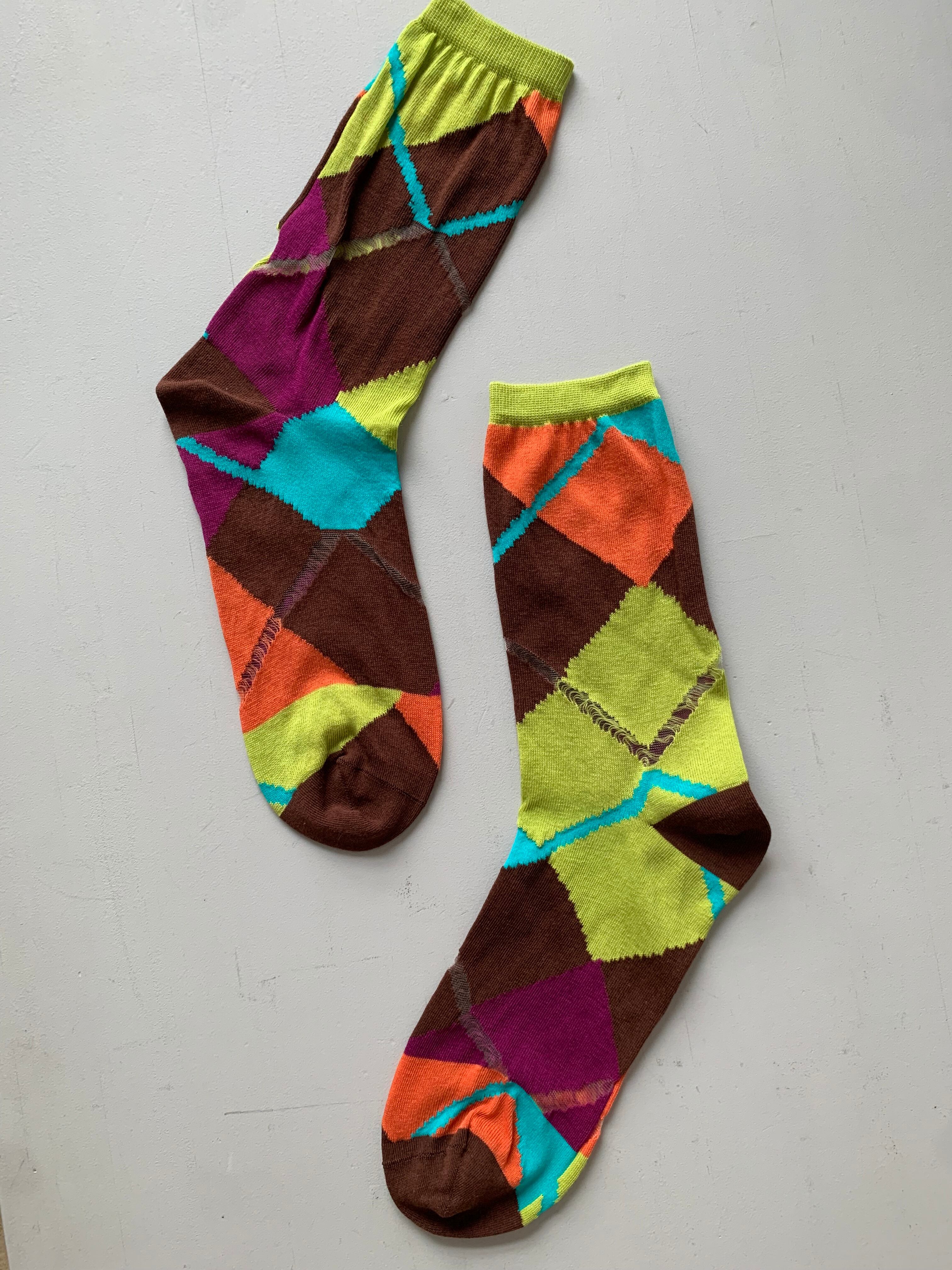 テグスで部分的に透けさせたマルチカラーのアーガイルソックス。