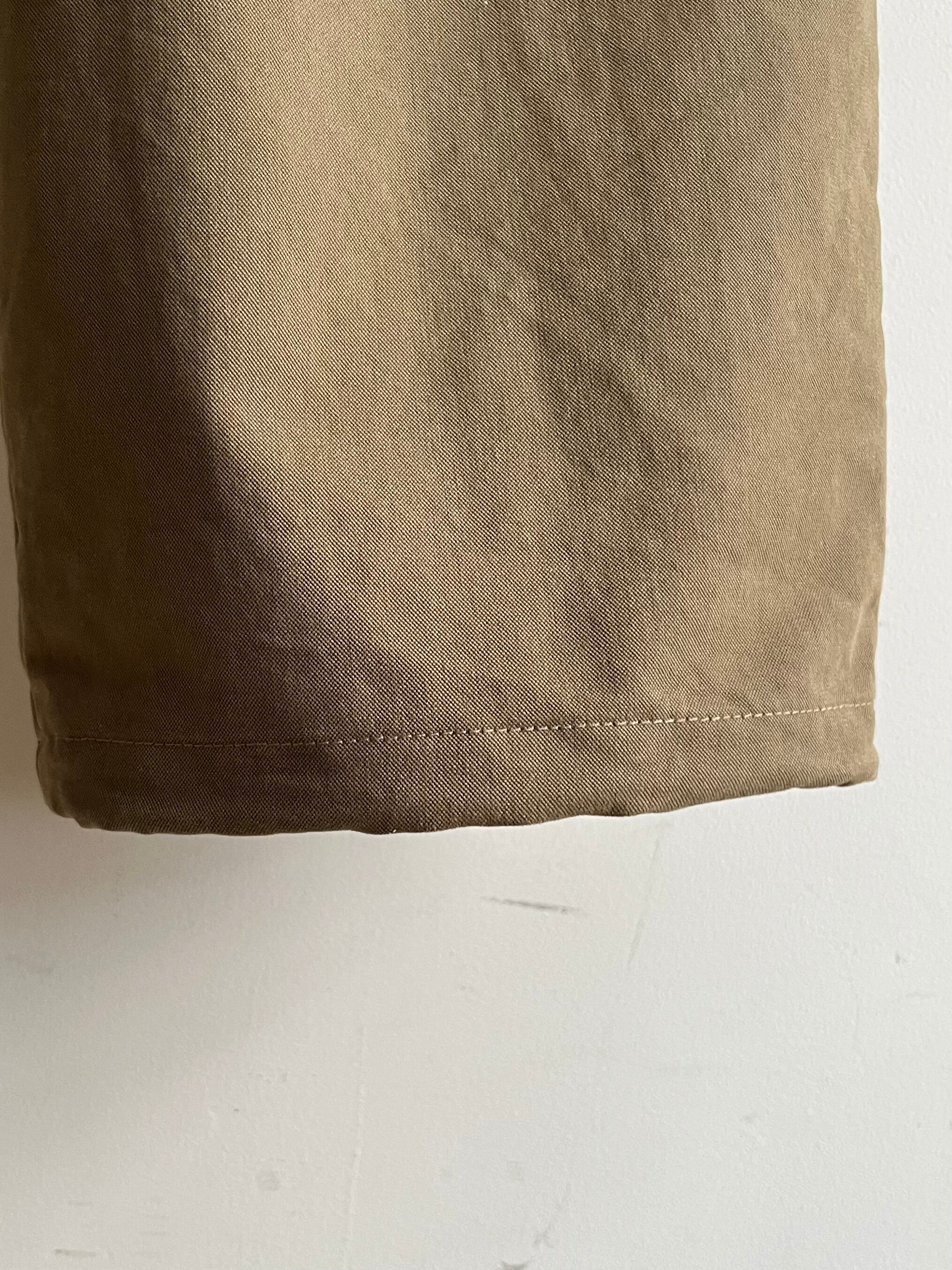 高品質なナイロン生地等で有名なリモンタ社製のコットンポリエステル素材、渋さのあるライトブラウンカラーの平織り生地を使用。ハリがあり細かい毛羽のあるピーチタッチな生地感、ベルベットの様なマットな光沢感があり高級感も感じます。