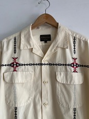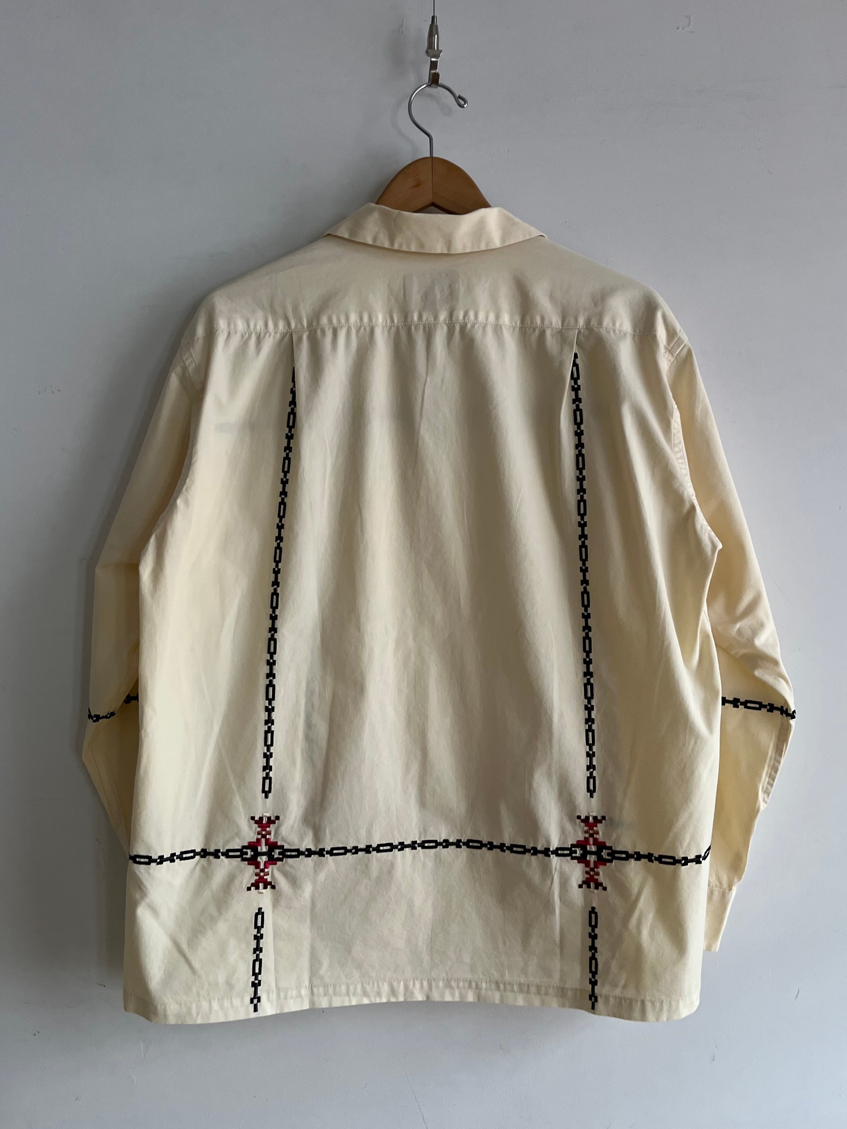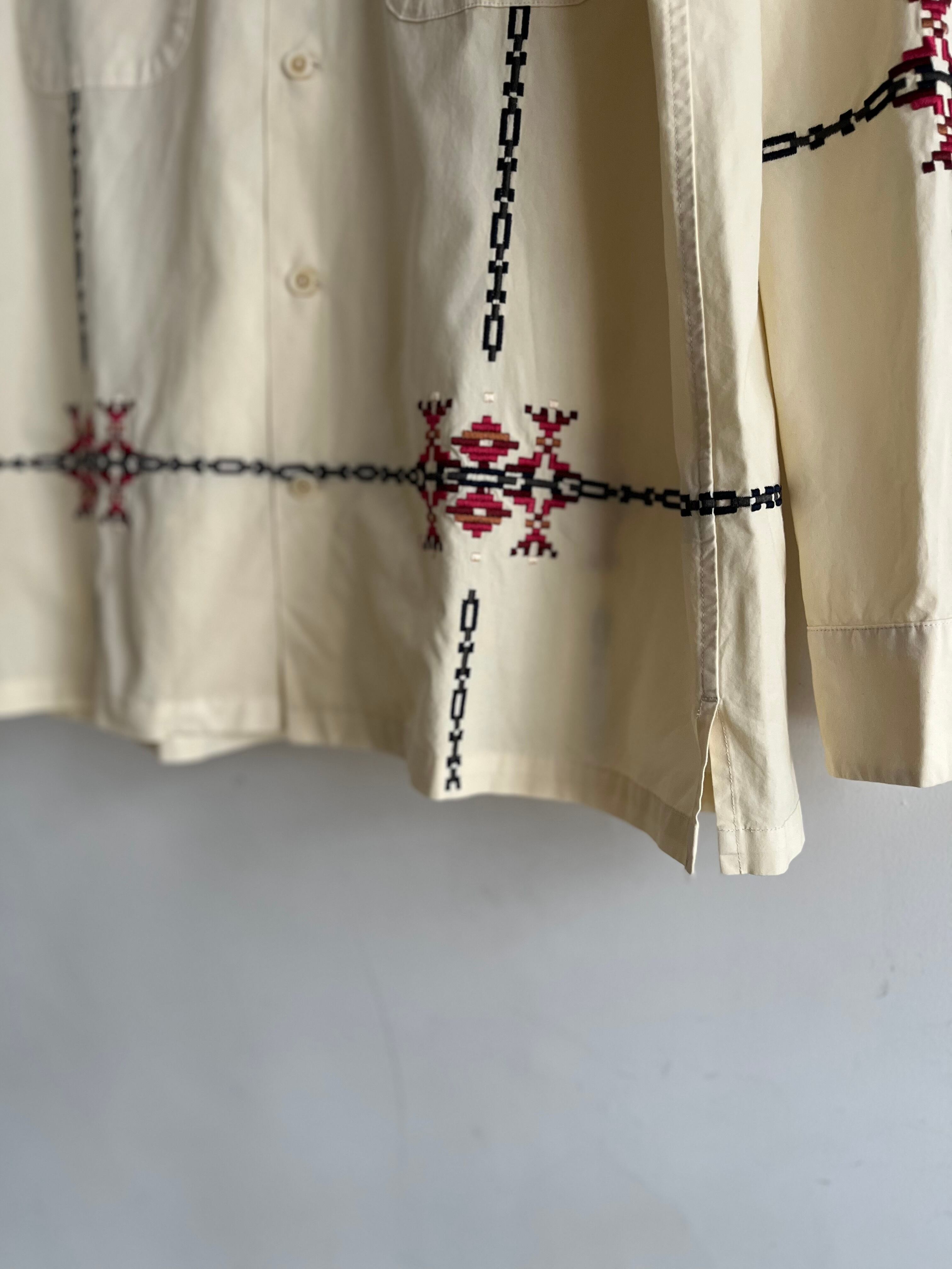 ネイティブアメリカン調の刺繍が印象的なオープンカラー長袖シャツ。刺繍の配色や大きさ、配置のバランスが良く雰囲気の良い一着。素材はハリ感のやや薄手の綿生地を使用ていて軽い着心地、丸みのあるフラップ付きポケット等高級感もありながら、オープンカラーに裾はボックスカットでカジュアルな装いとより相性が良さそうです。