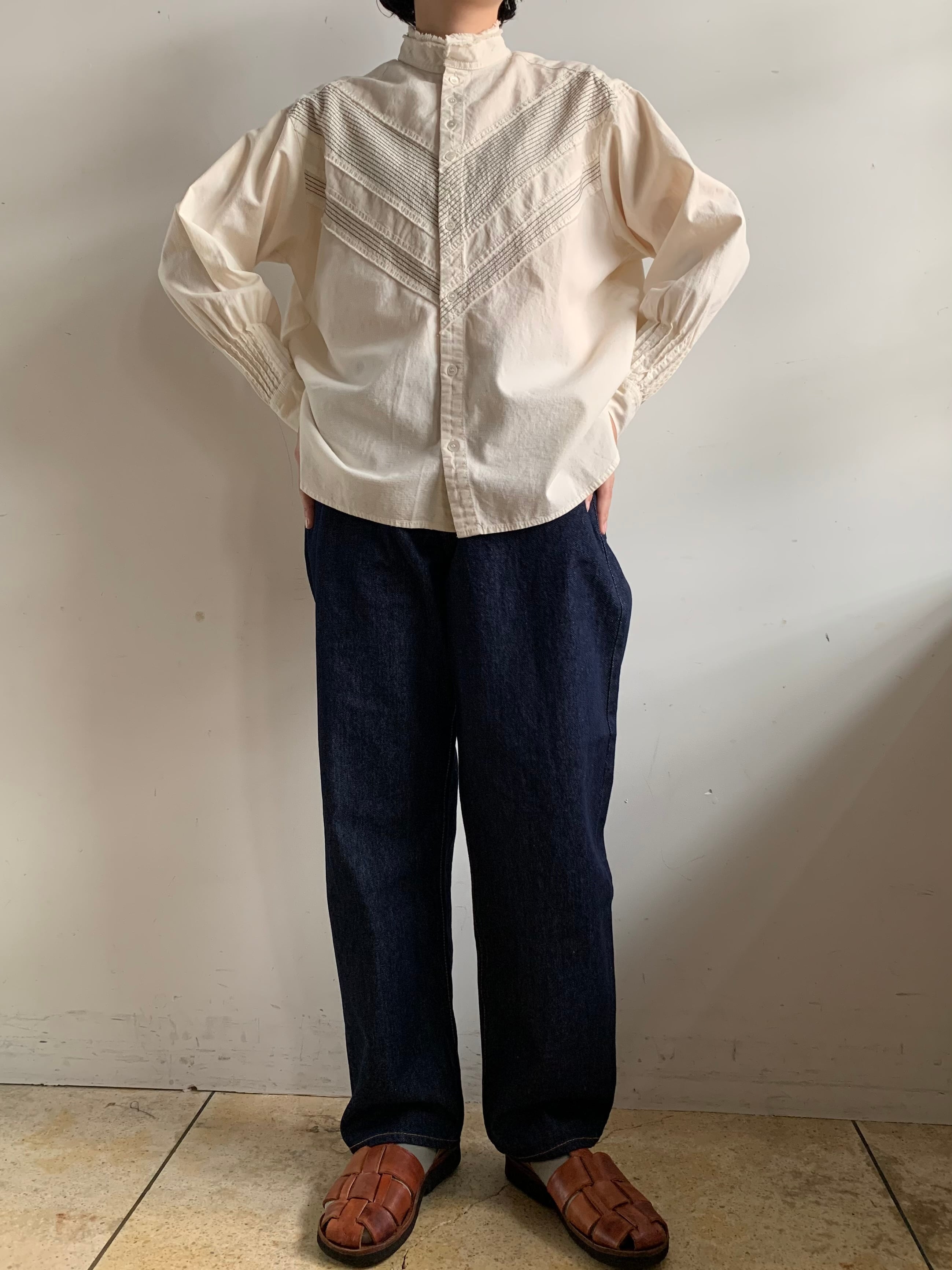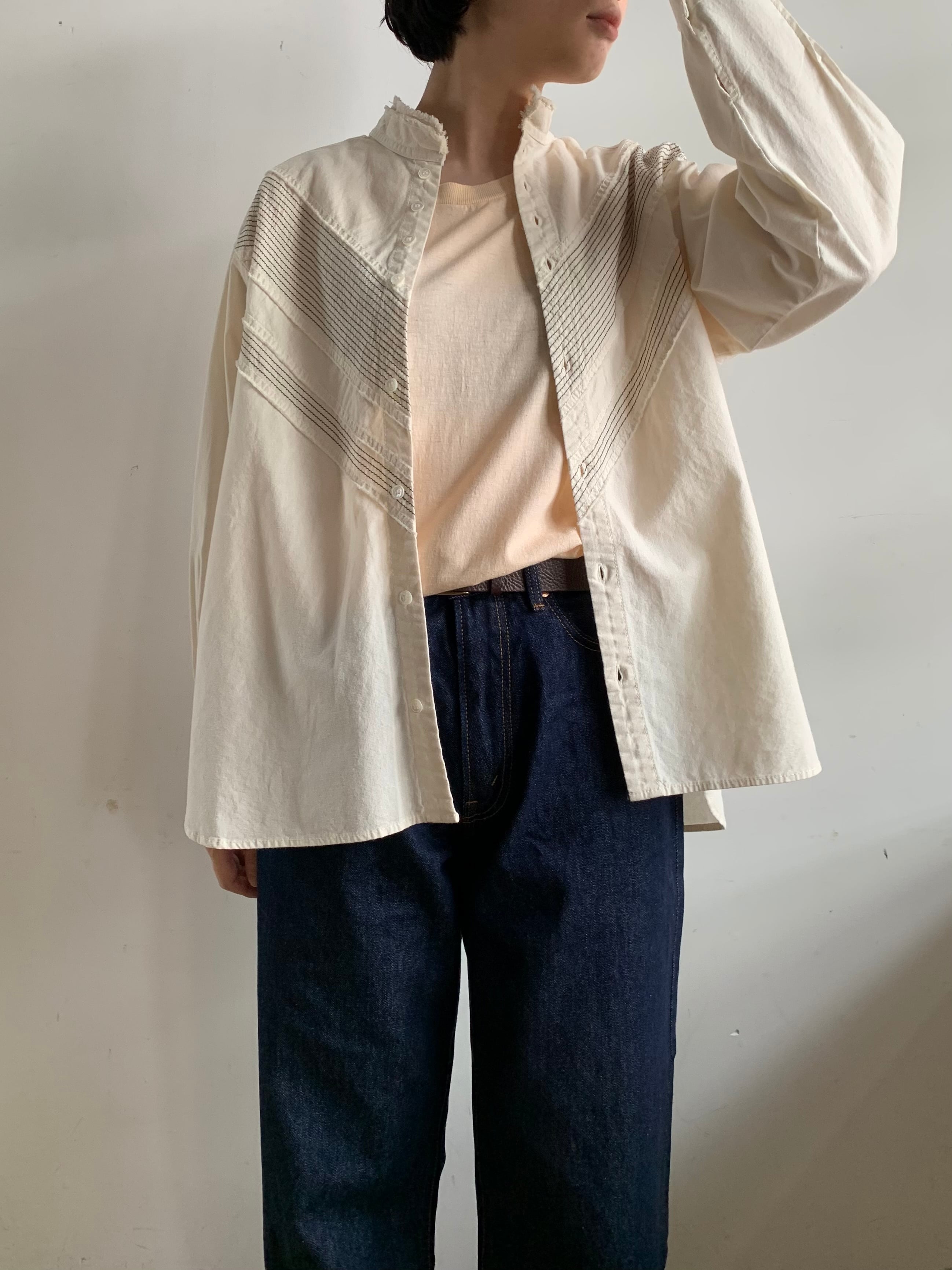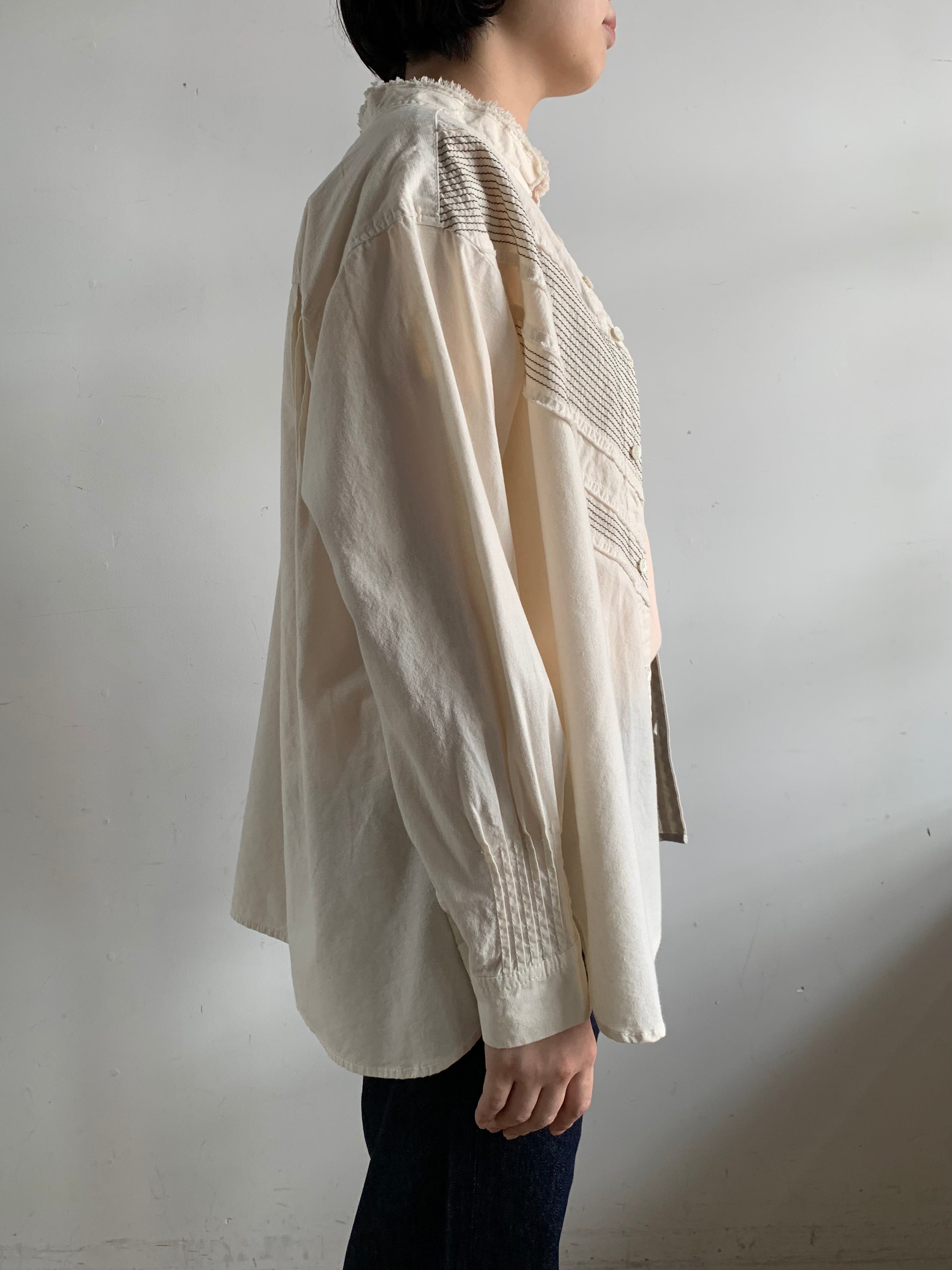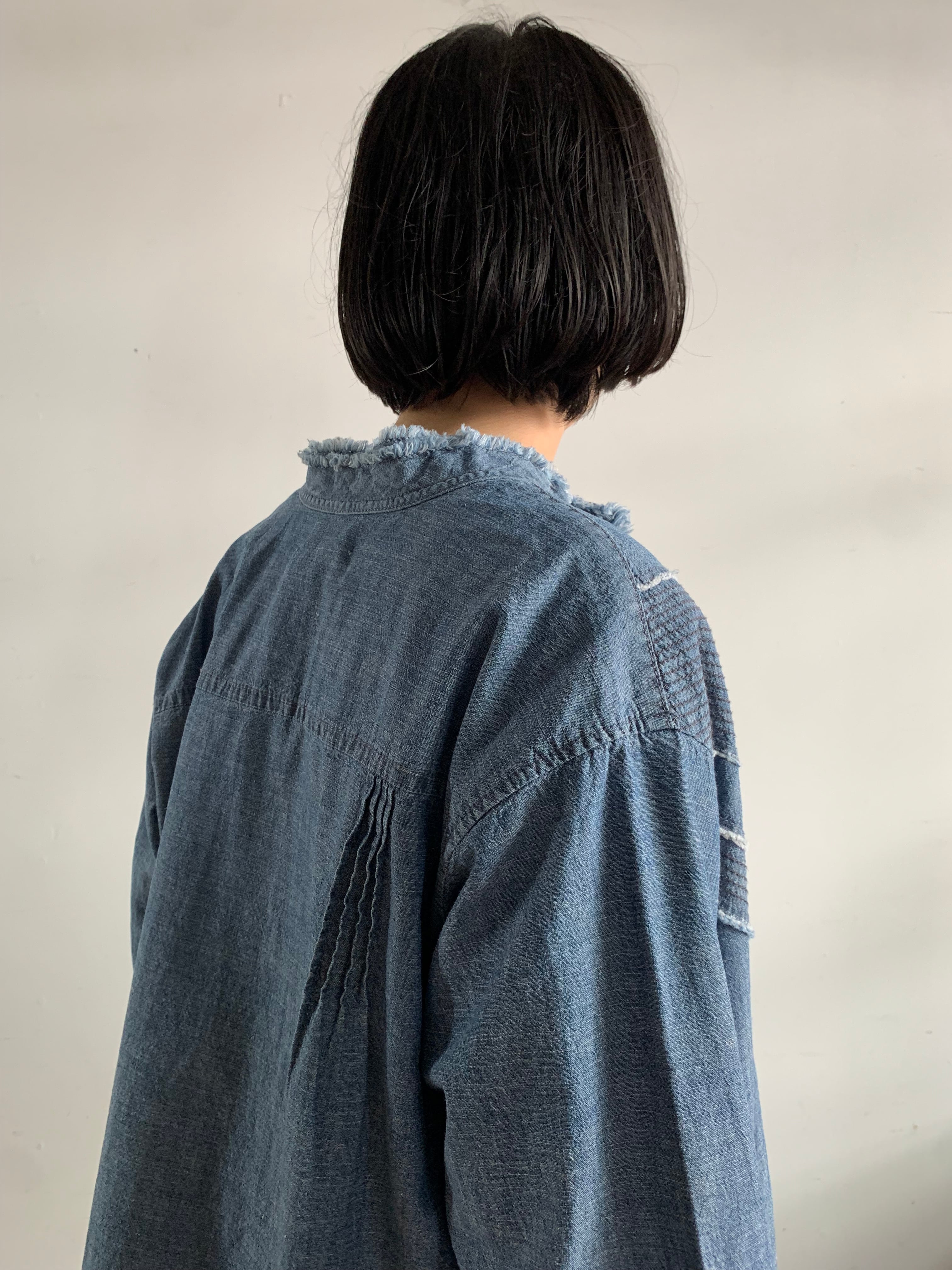 背面と袖口には細かなピンタック、襟元にはフリンジが施されておりシンプルながらも特徴のある一着。