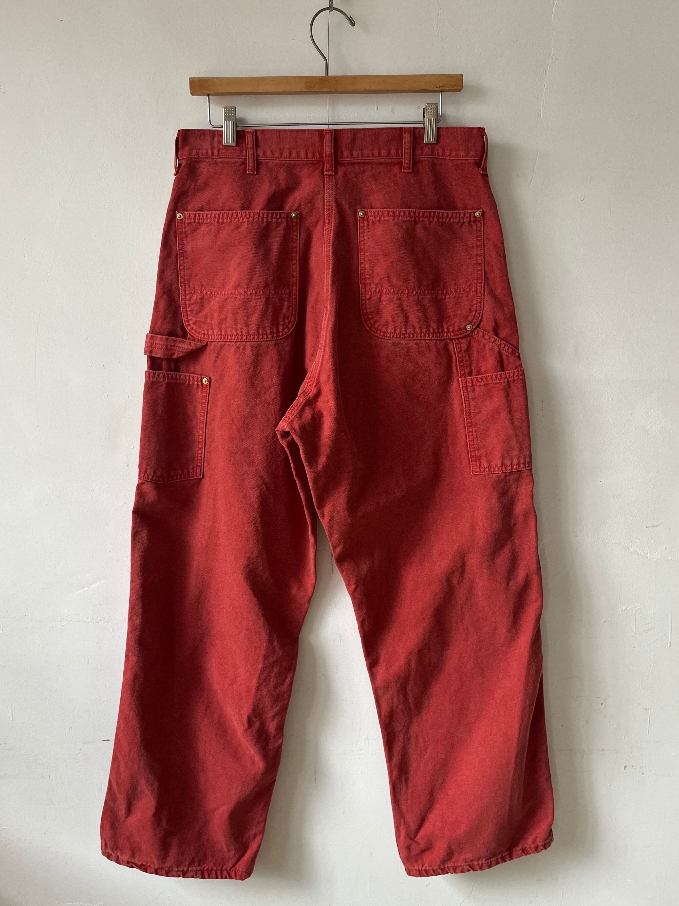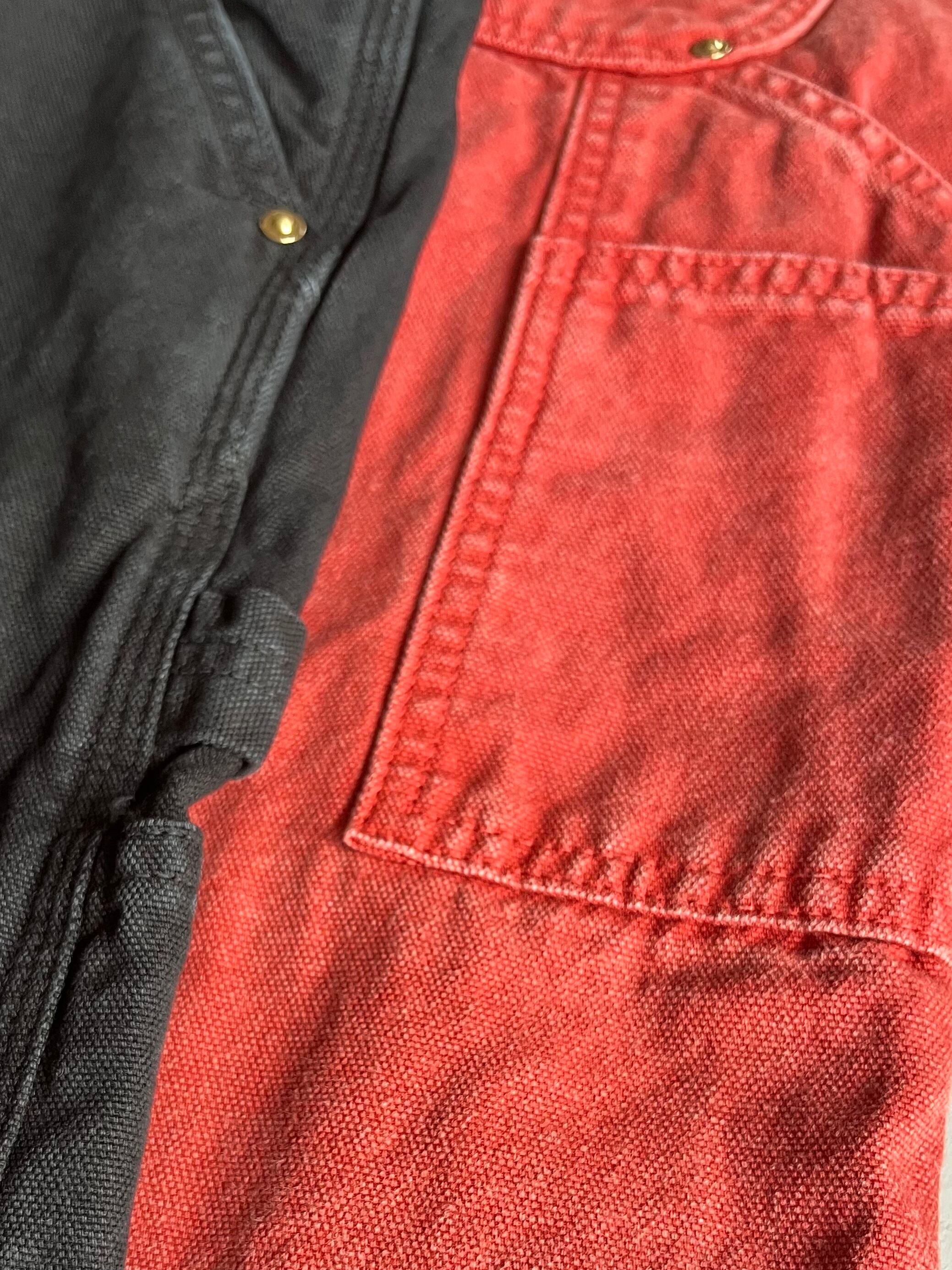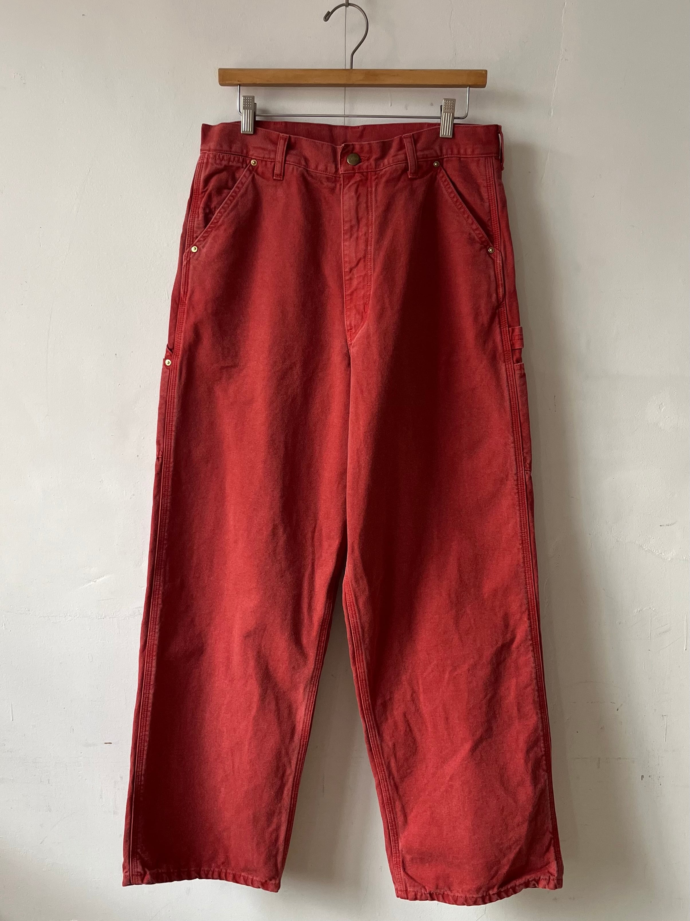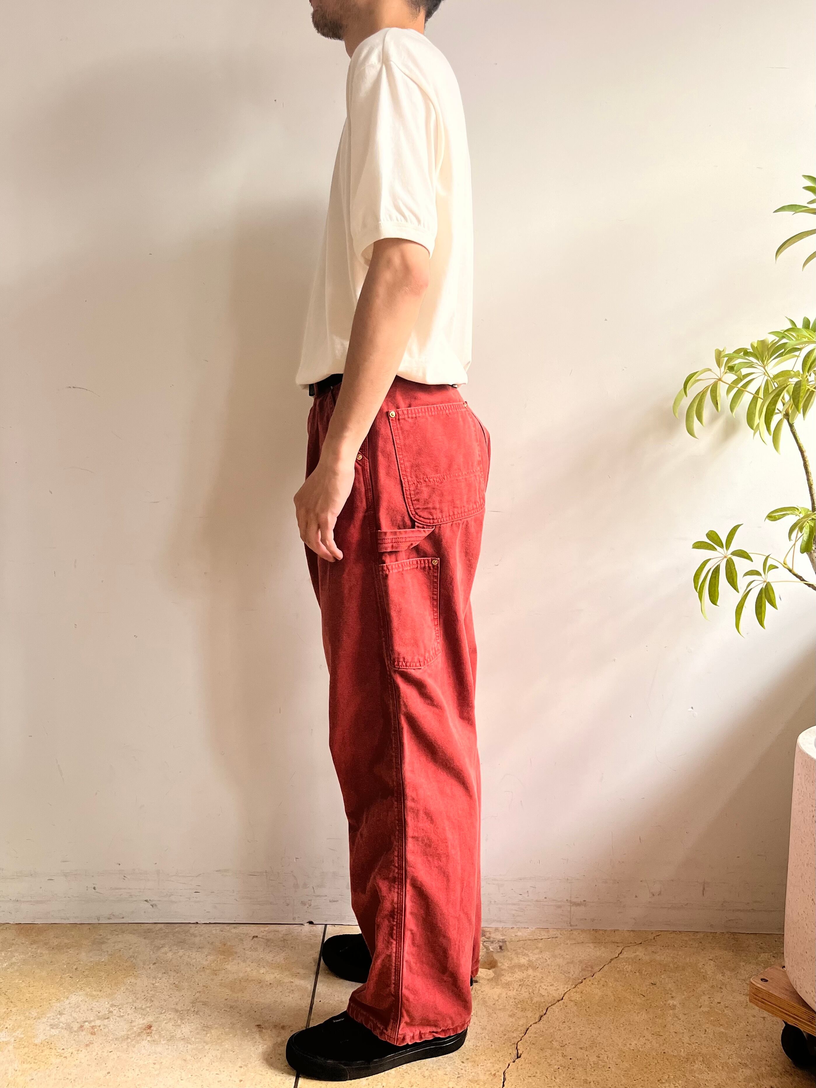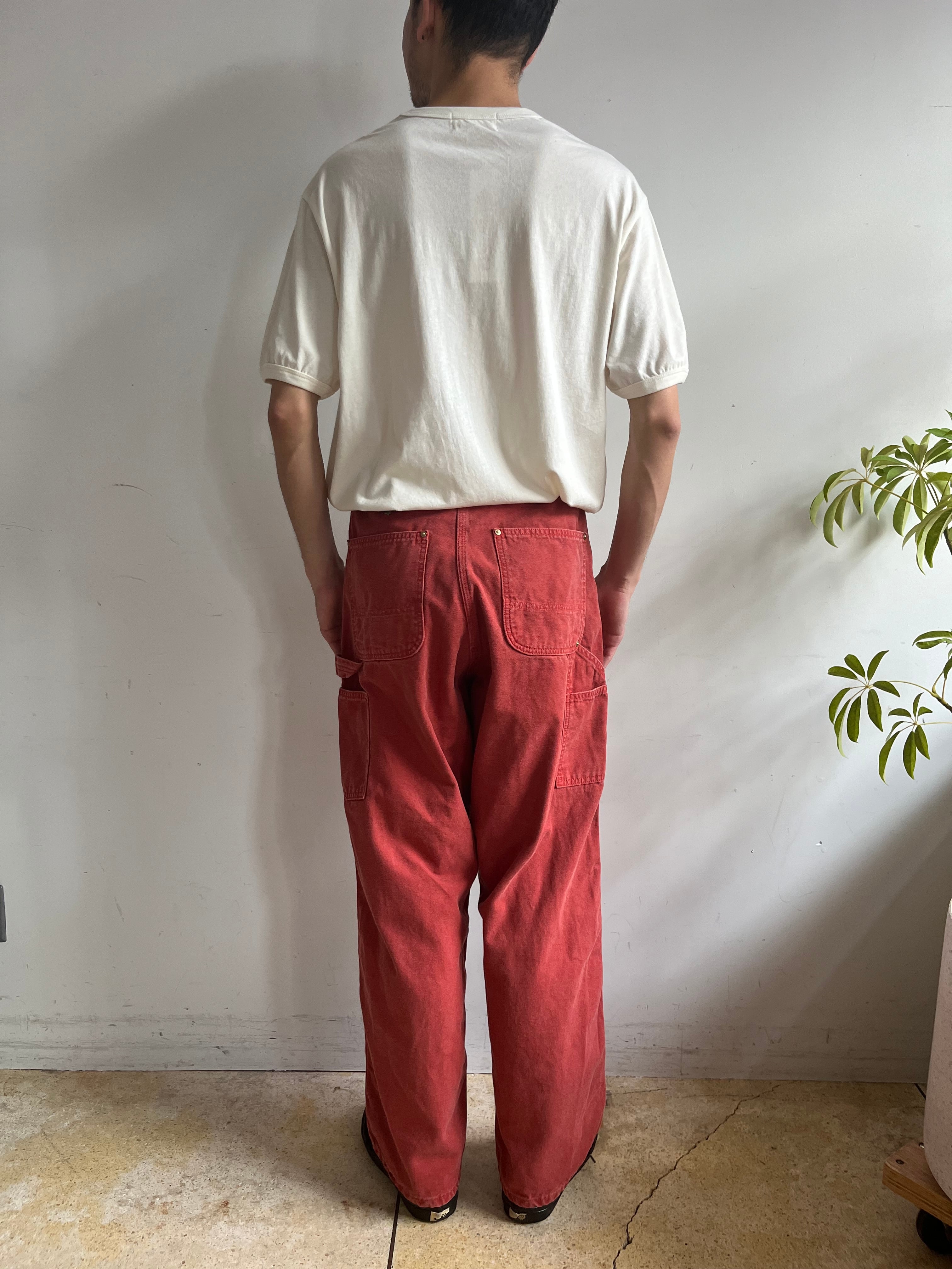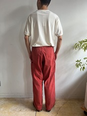 厚みとハリのあるオックス生地を使用したワーク感溢れるペインターパンツ。バックポケットや両脇のスケールポケットには補強カシメが随所に打たれておりバックスタイルが印象的な一本。製品の状態でUSED 加工が施されており全体的に自然なアタリとフェードが雰囲気の良い仕上がり。形は幅にゆとりがありリラックス感のあるダッドフィットになります。