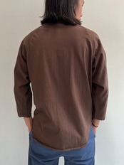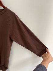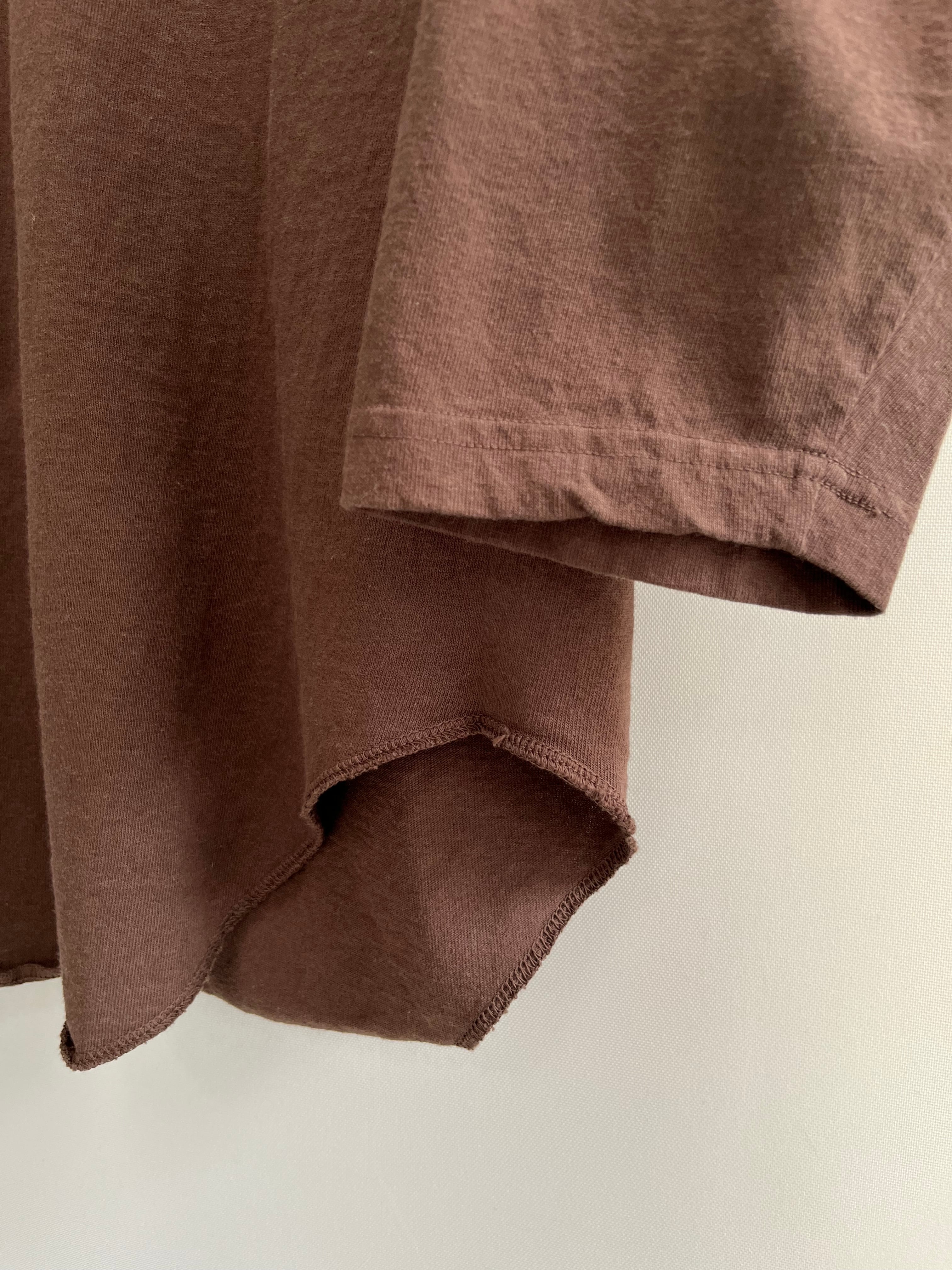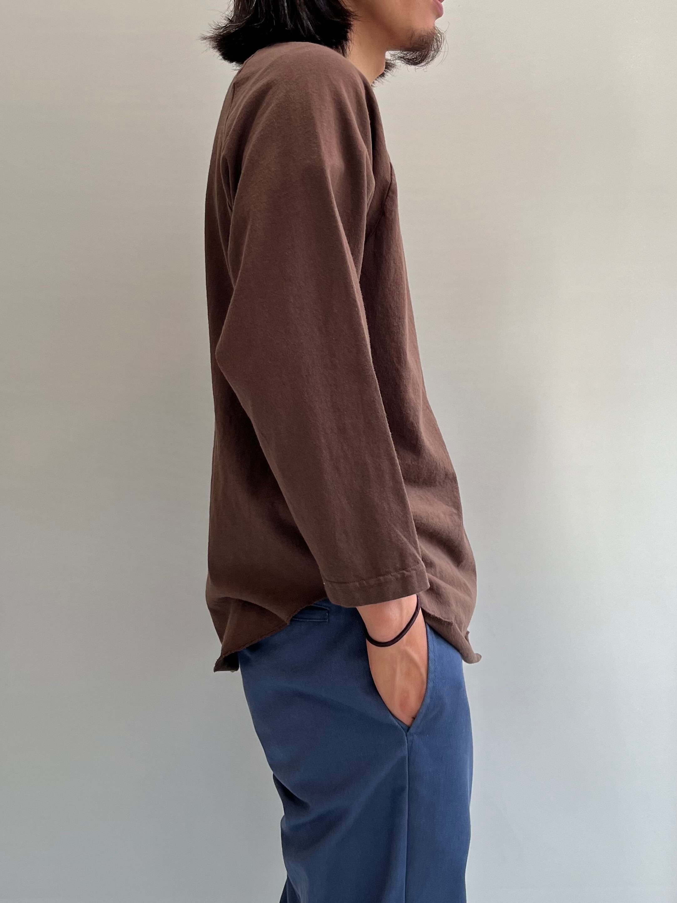 程よい厚みとフィット感、単体の着用でも雰囲気良いですが、バインダー縫製の襟元とラウンドした裾が重ね着と相性が良く、インナーとしてシャツやスウェットなどと組み合わせてチラ見せするのもお勧めです。