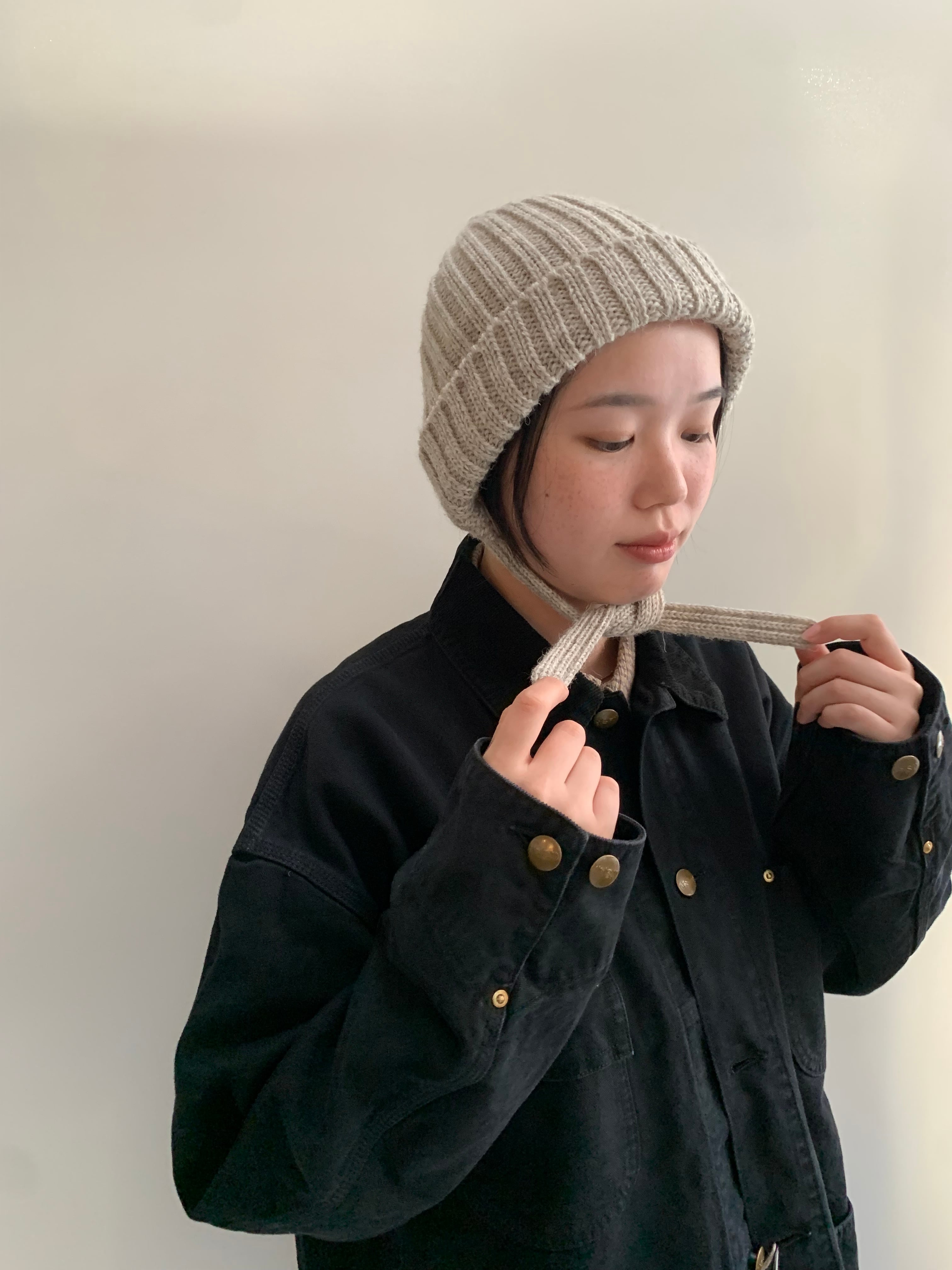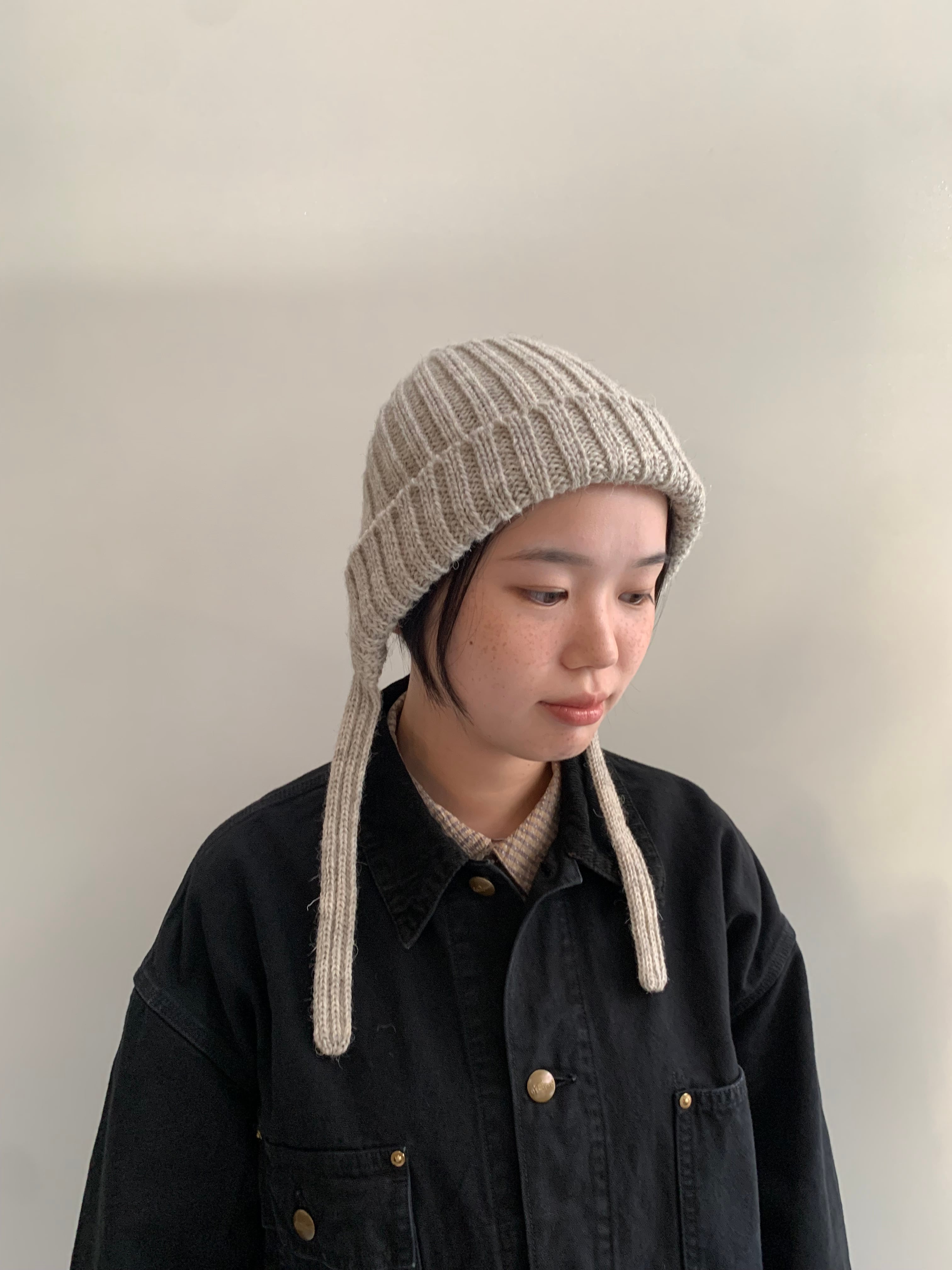 ハイランド定番の形をアレンジしたコード付きニットキャップ。色々な被り方ができます、前で縛ってフード調にも◯