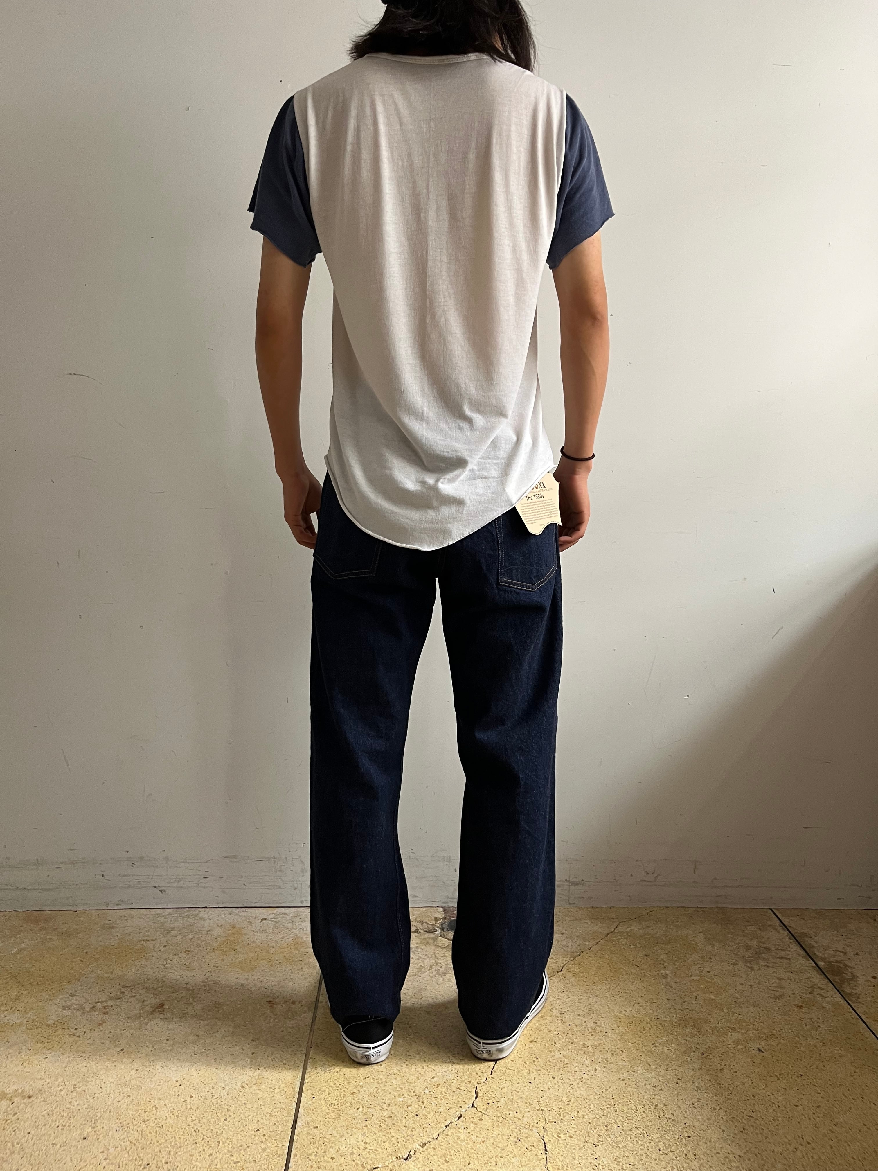 1953年製の紡績機械で紡がれた糸を旧式シャトル織り機で織り上げたオリジナルセルヴィッジデニムを使用、当時のデニム同様の自然なムラのある色落ちを再現、素材だけでなくバックポケット端の隠しリベット、ずらして取り付けたベルトループ、革製のパッチなど当時の仕様も踏襲されたオアスロウならではの一品。