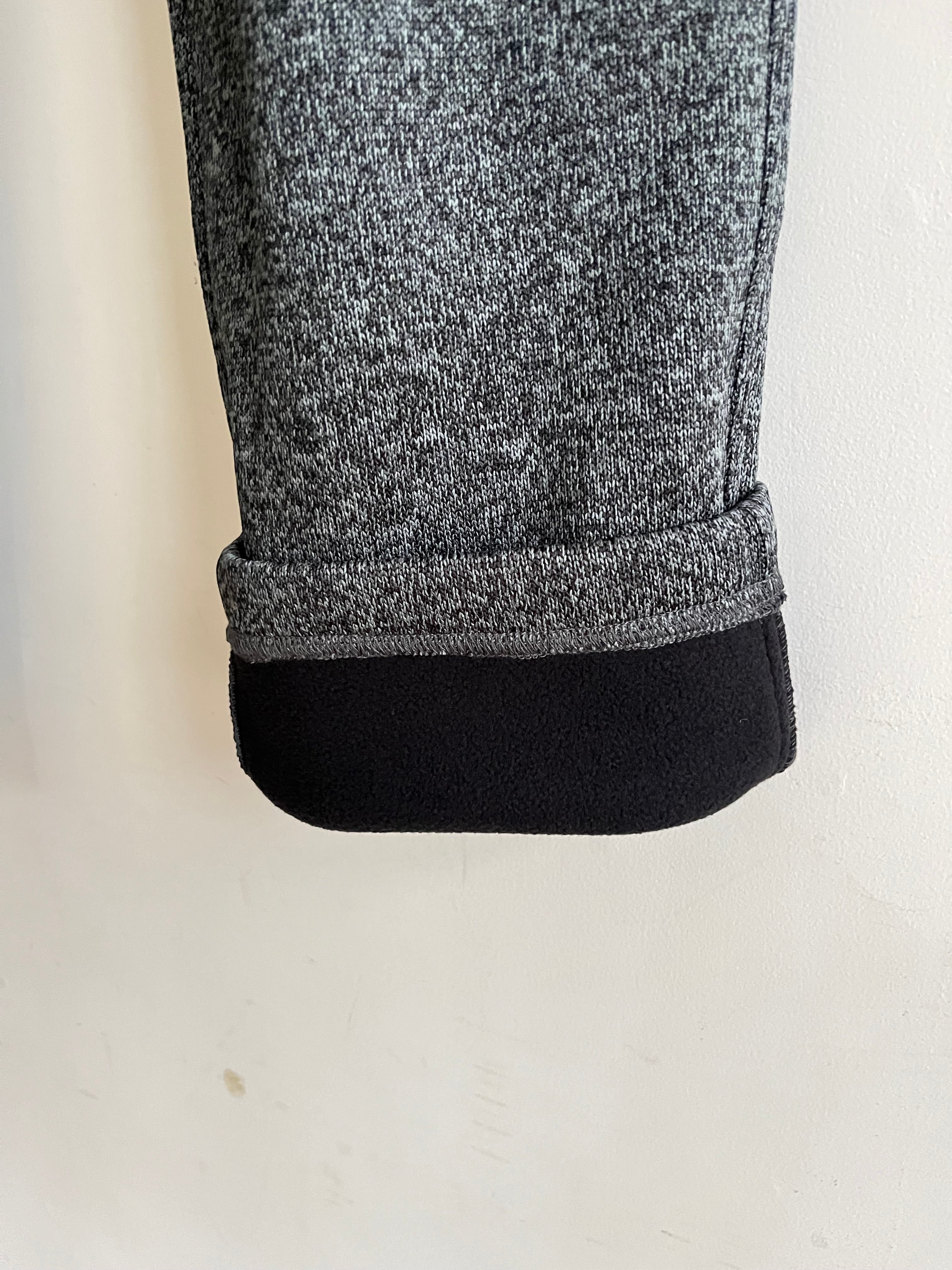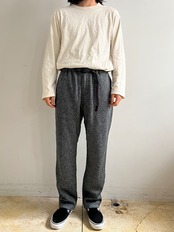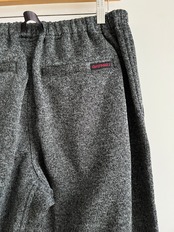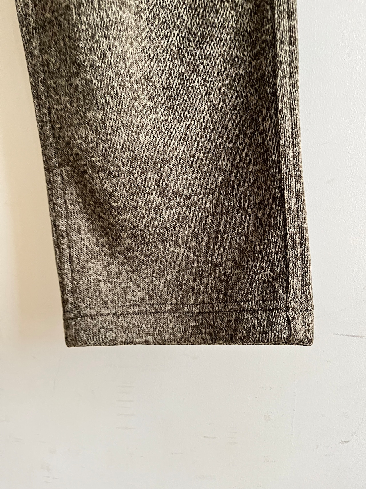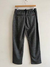 霜降り感のあるポリエステルニット素材を表に、風を通しにくく保温性の高いマイクロフリースを裏面に張り付けてあるボンディング生地を素材にしたニットフリースイージーパンツ、伸縮性があり動きやすく履き心地が良い印象です。一体型のナイロンベルトに股繰りのマチなどグラミチらしい仕様、形はヒップ周りにゆとりを持たせつつ裾先までテーパードされたすっきりとしたシルエットです。