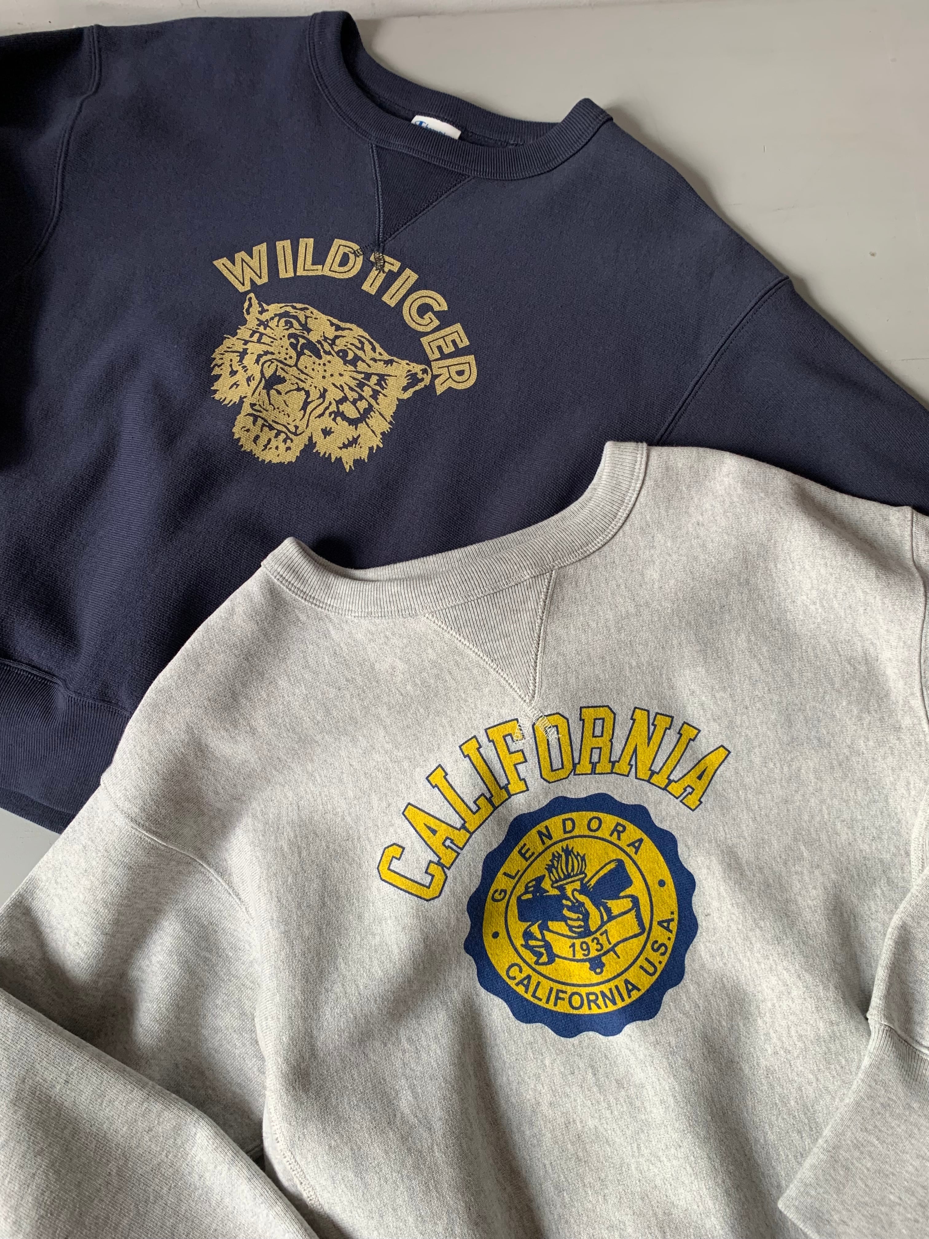 肉厚なアメリカ綿90%+ポリエステル10%の11.5オンス裏起毛生地を使用、身幅や肩幅にゆとりを持たせたリラックスフィットでVガゼット付きのデザイン。カレッジ風の「CARIFORNIA」には染み込みプリント、アニマルモチーフの「WILD TIGER」にはハーフラバープリントを施しています。