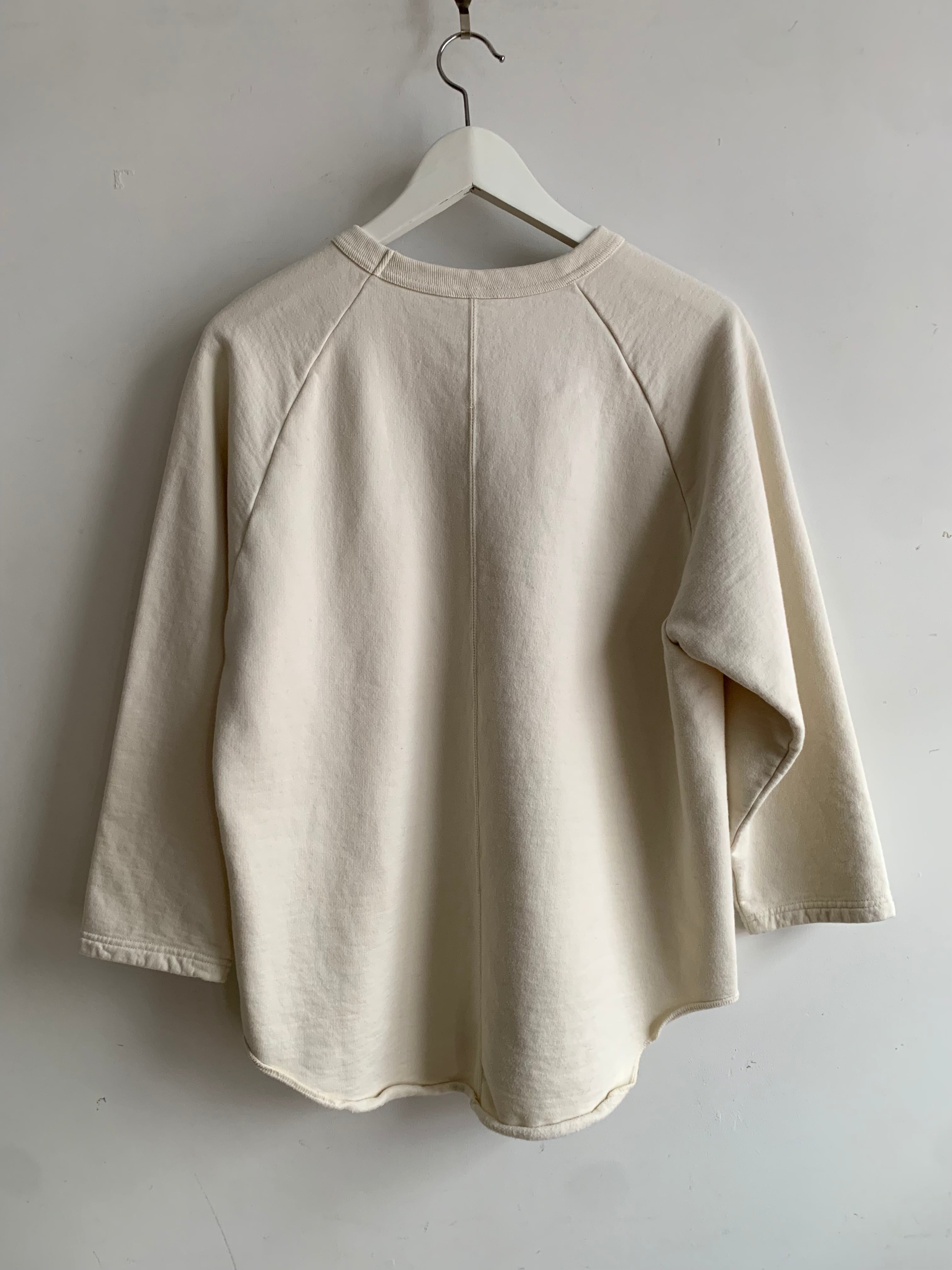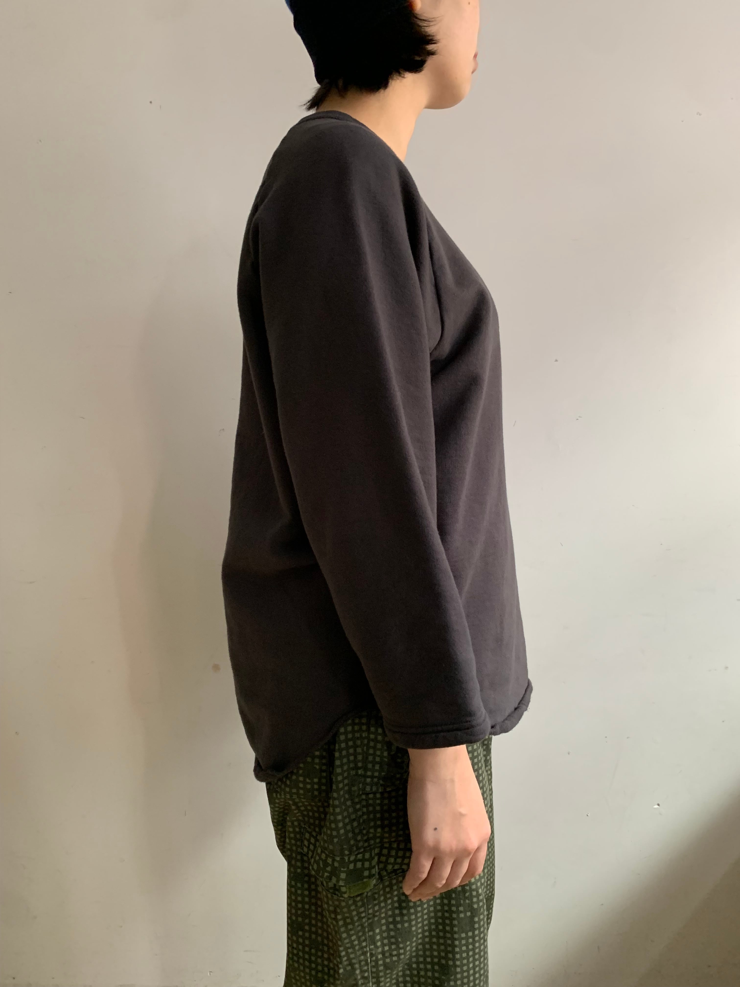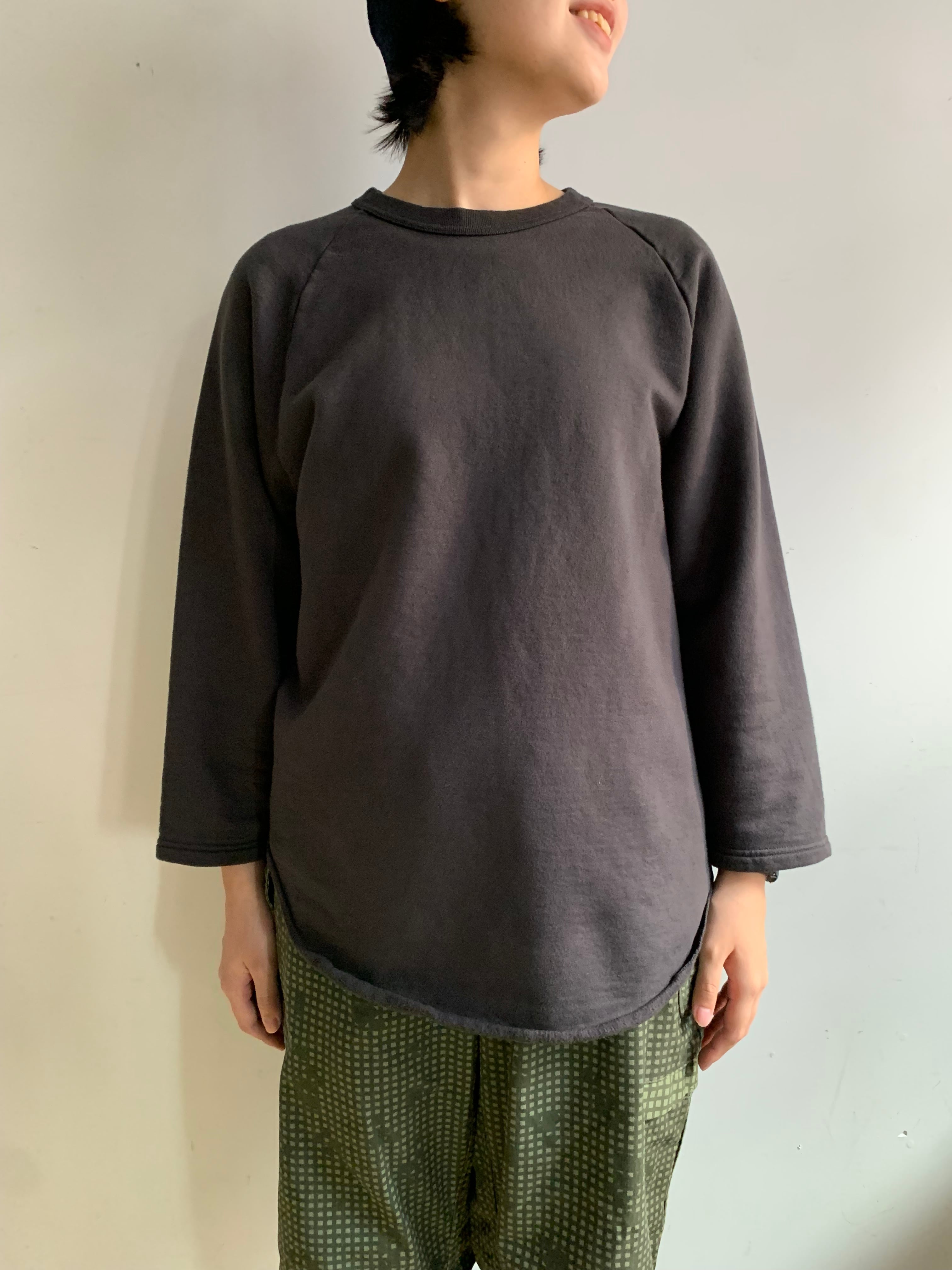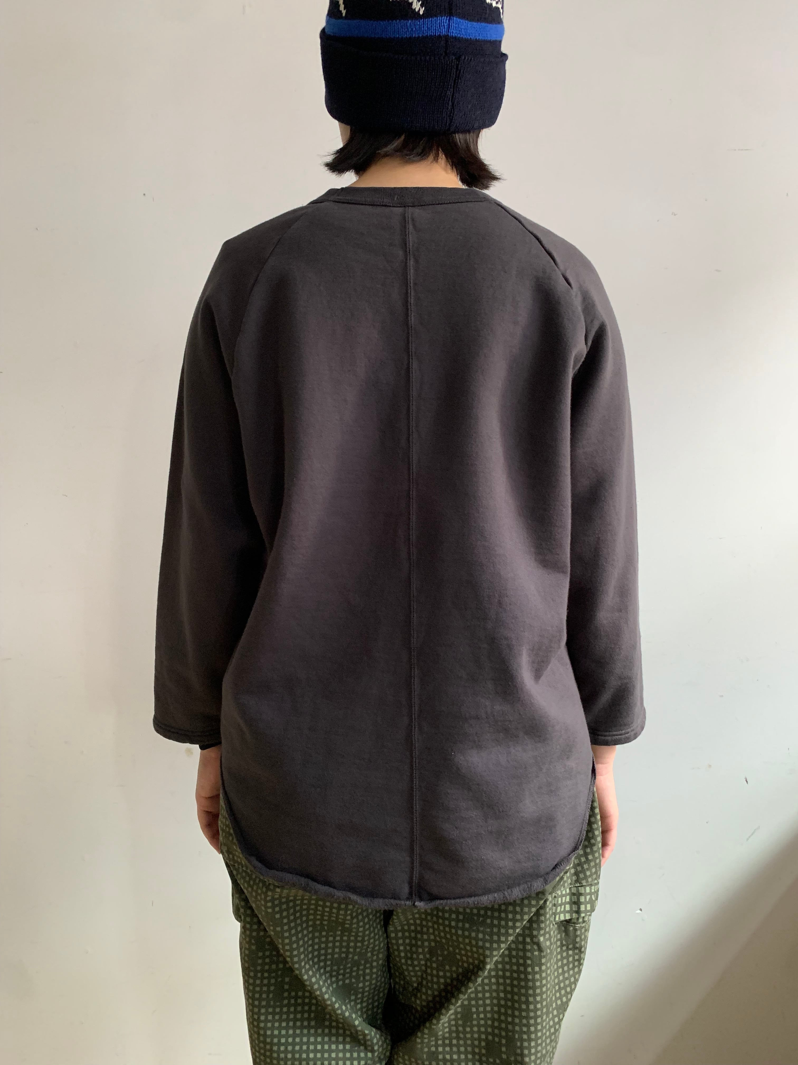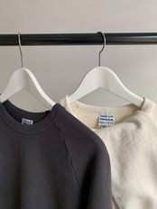 米綿100%の裏起毛生地に裾のラウンドカット、ラグランスリーブ、ネックのバインディングに背中に縫い目が入ったデザイン。