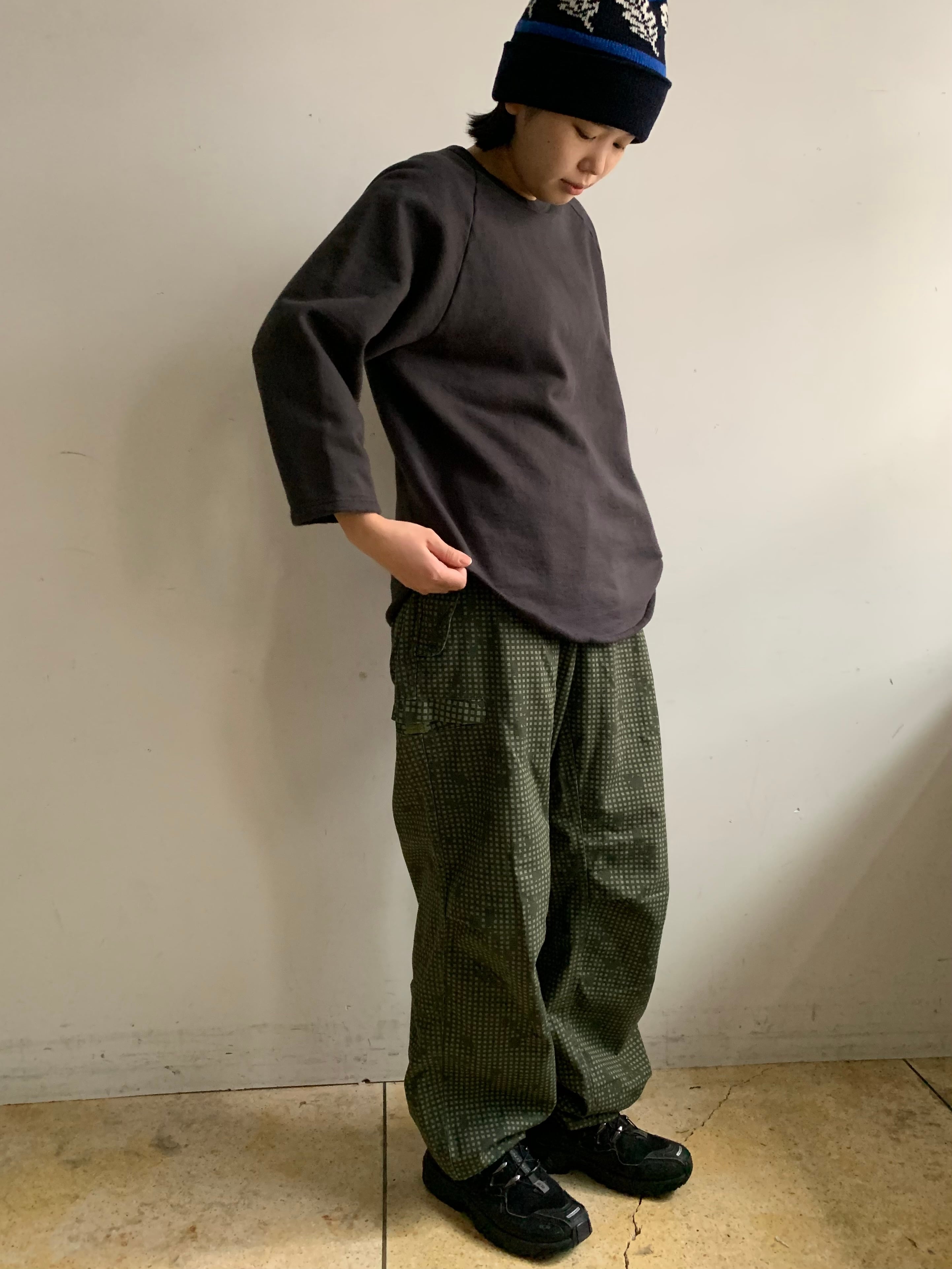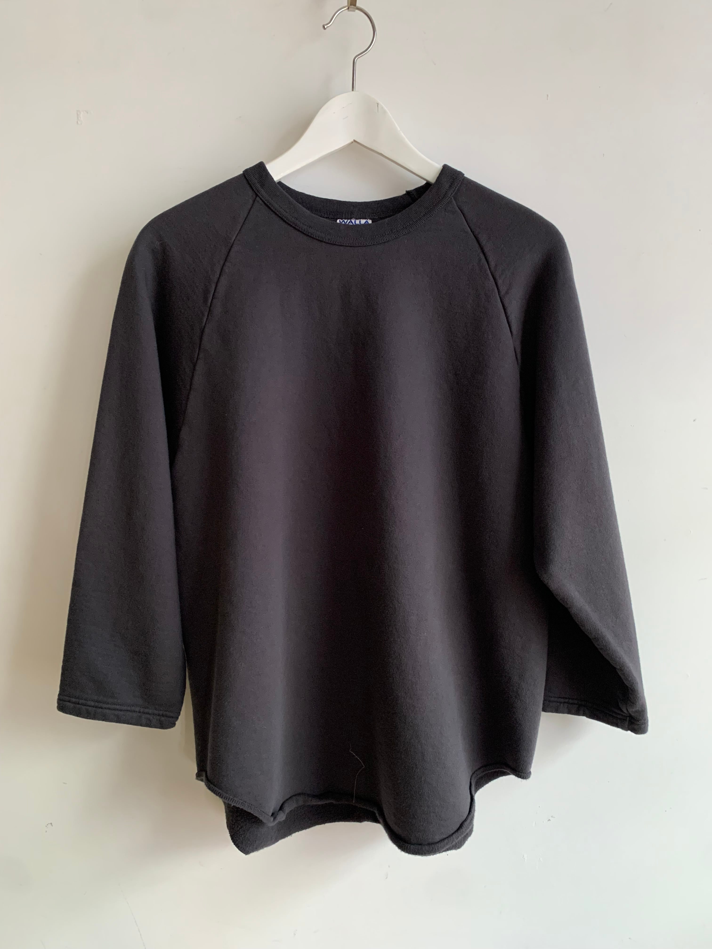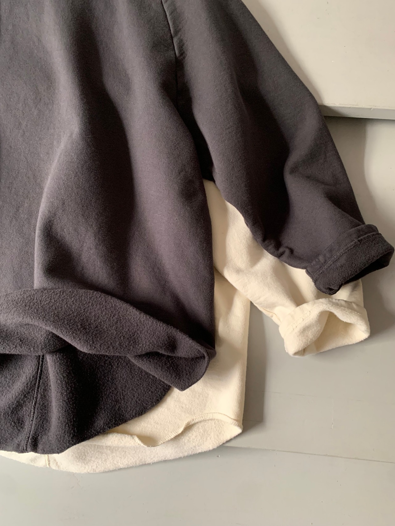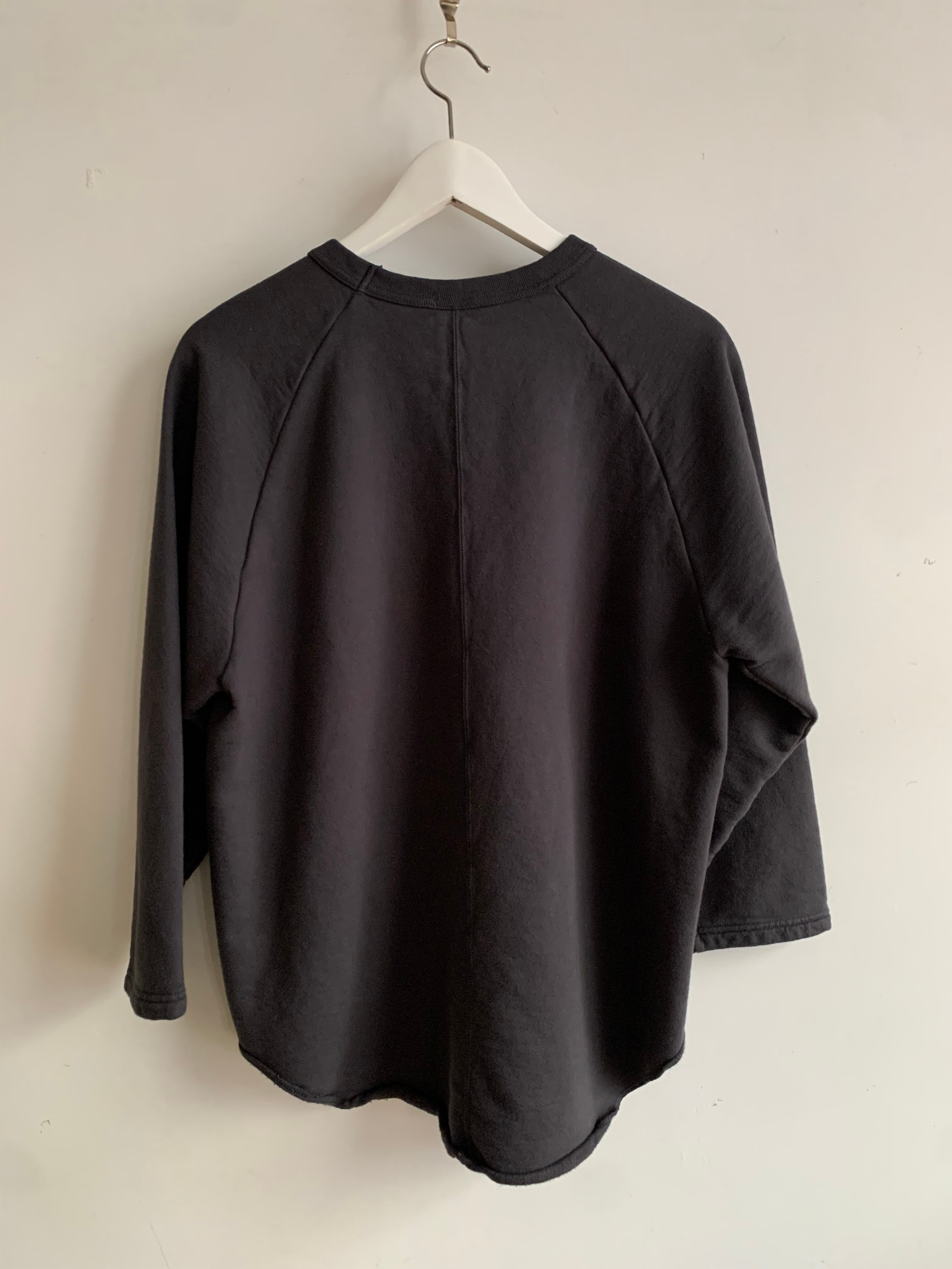 米綿100%の裏起毛生地に裾のラウンドカット、ラグランスリーブ、ネックのバインディングに背中に縫い目が入ったデザイン。