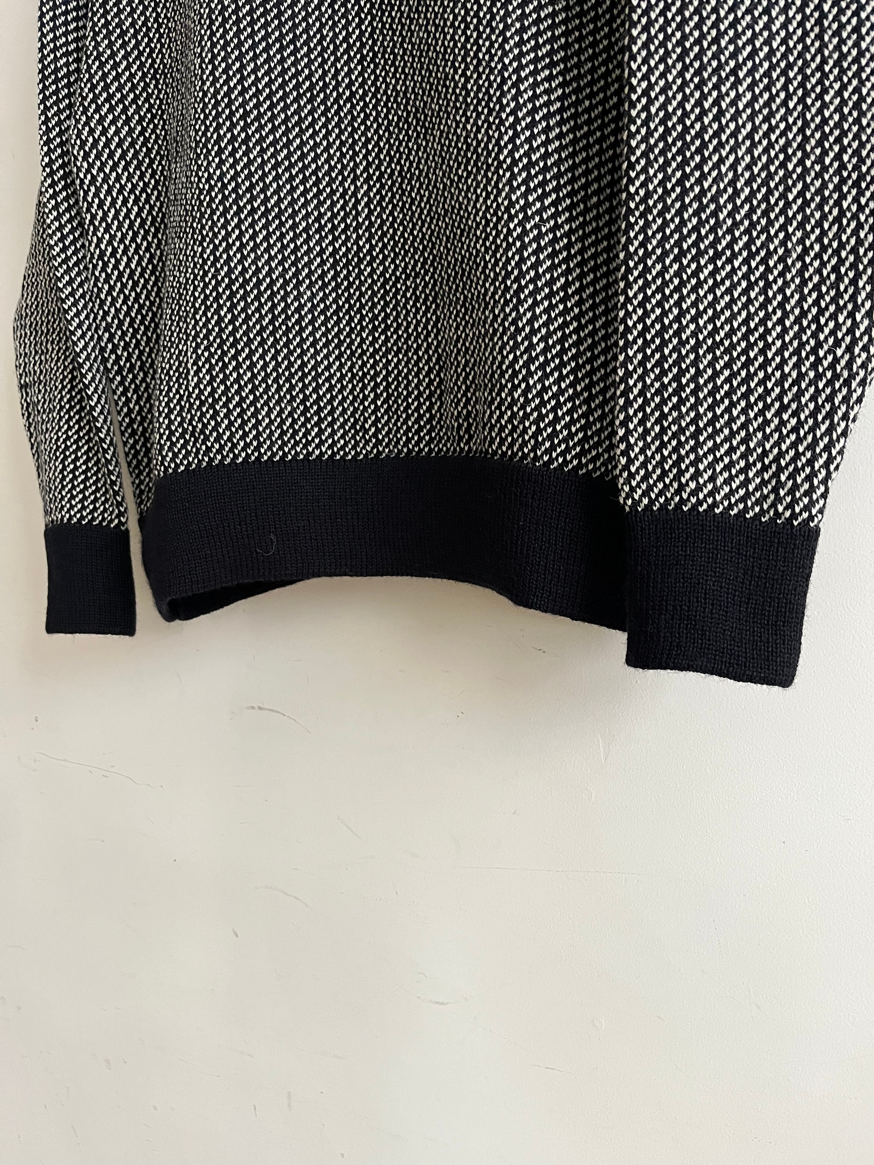 しっかりと厚みを出して編まれた首回り、裾や袖口切り替え部分等、丁寧な編地に確かな高品位さを感じる一着。
