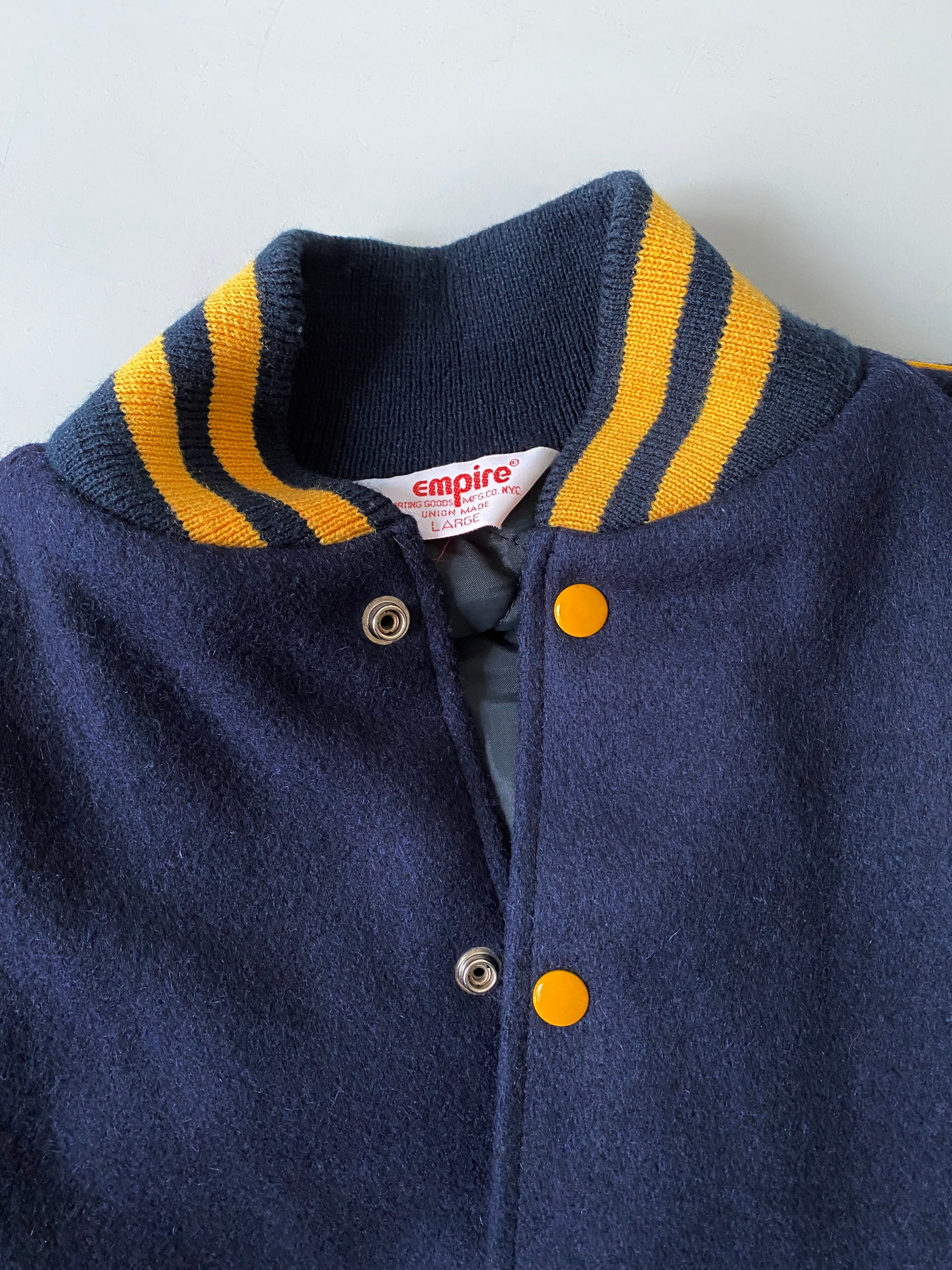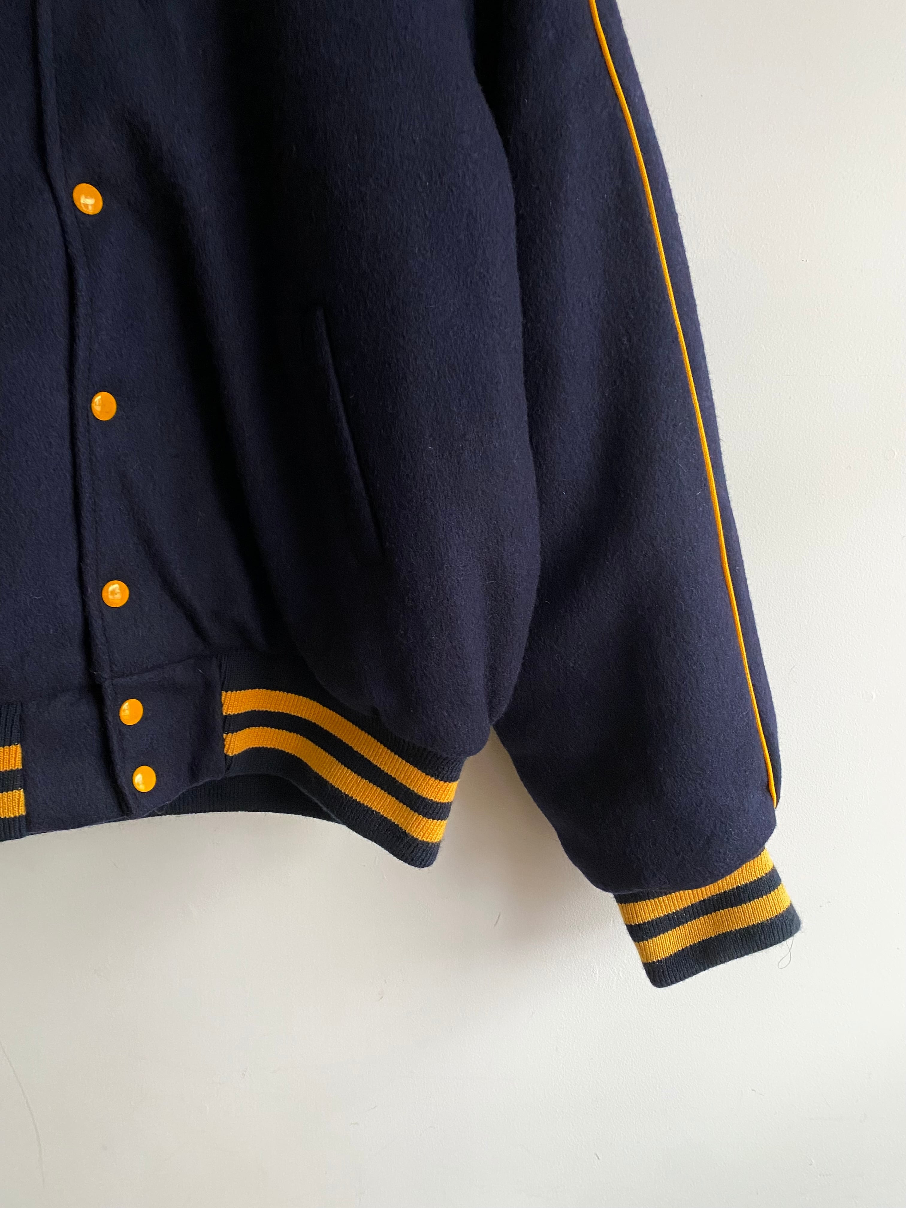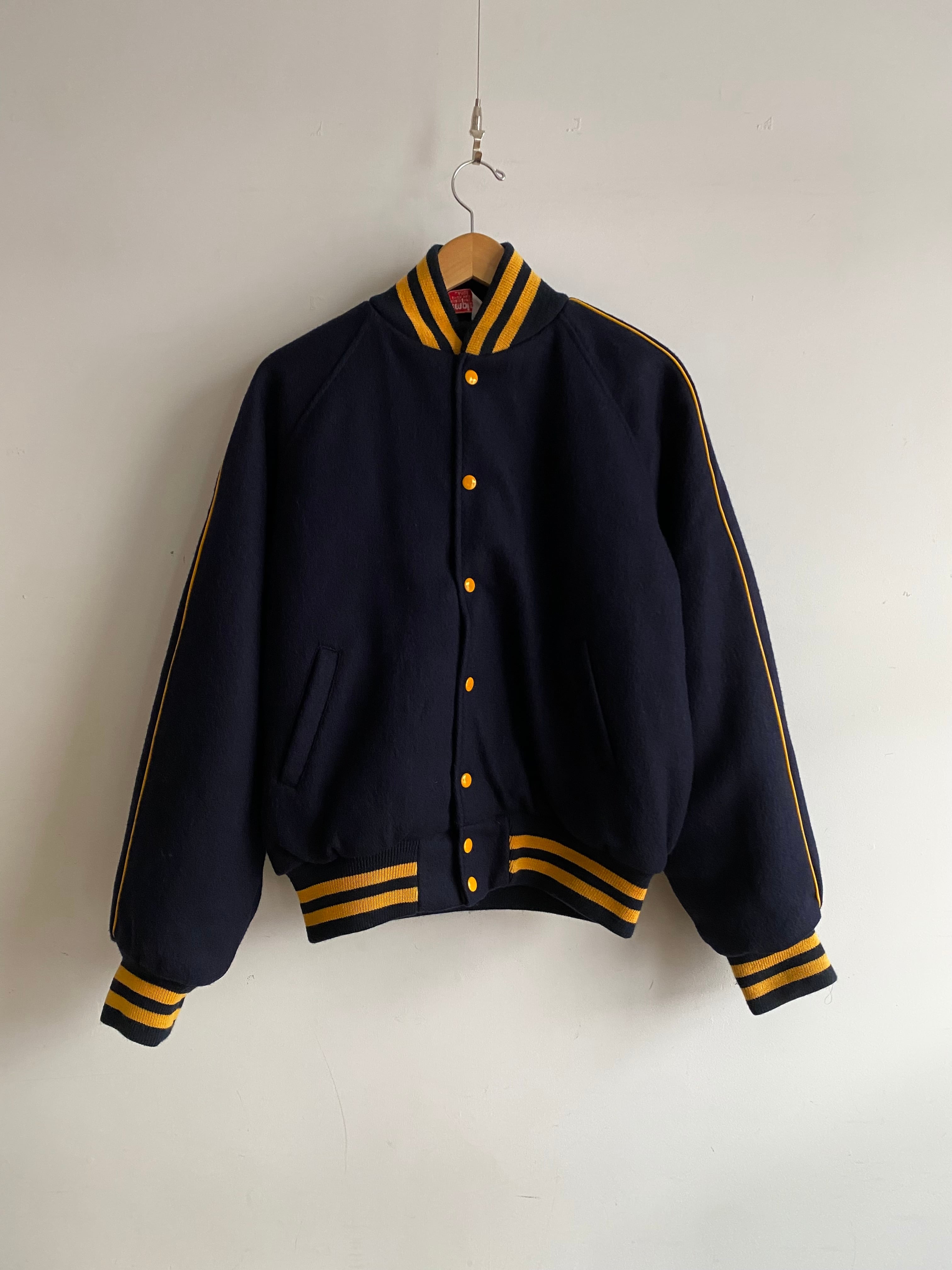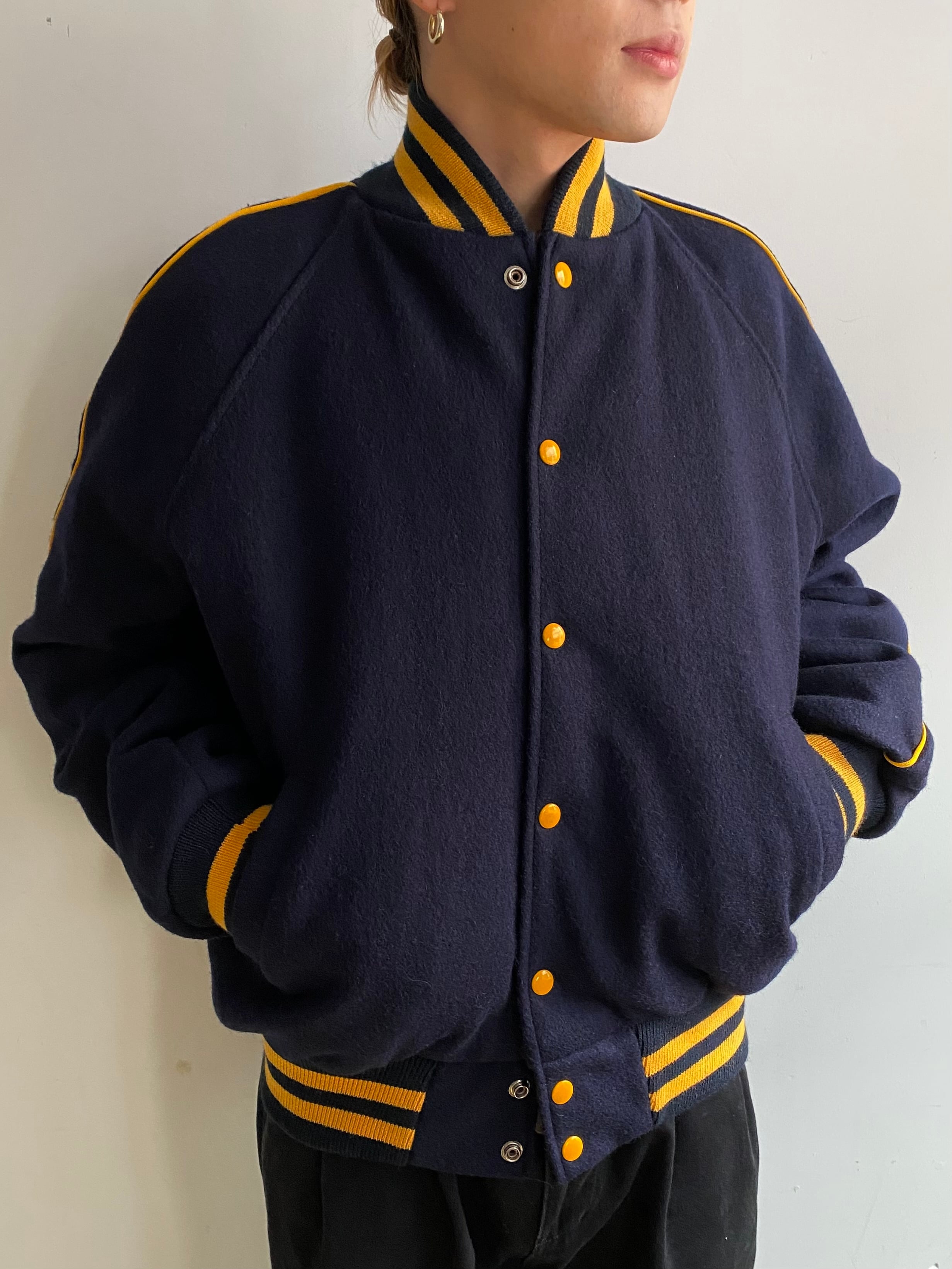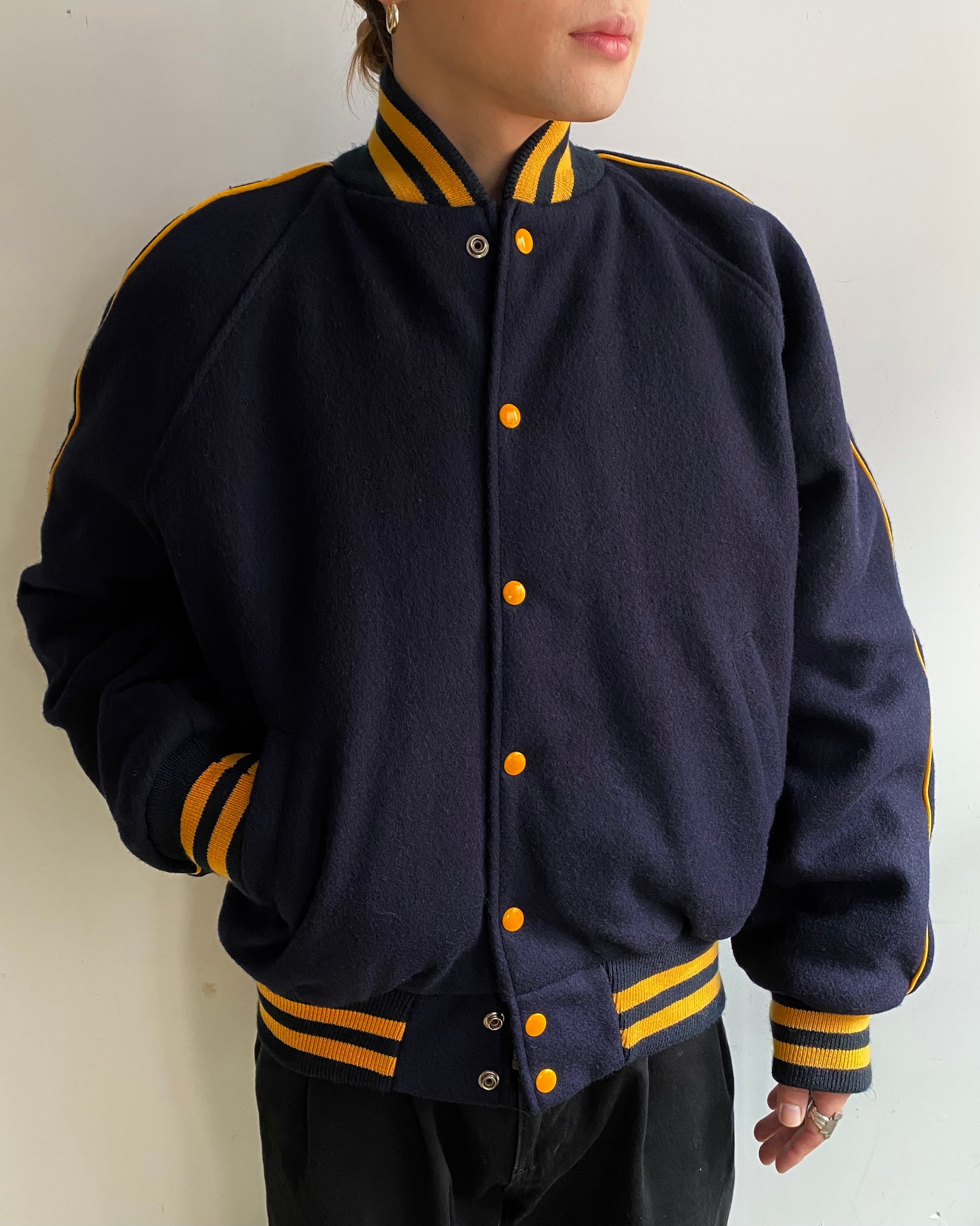 黄色とネイビーの配色が絶妙に良いスタジアムジャケット。