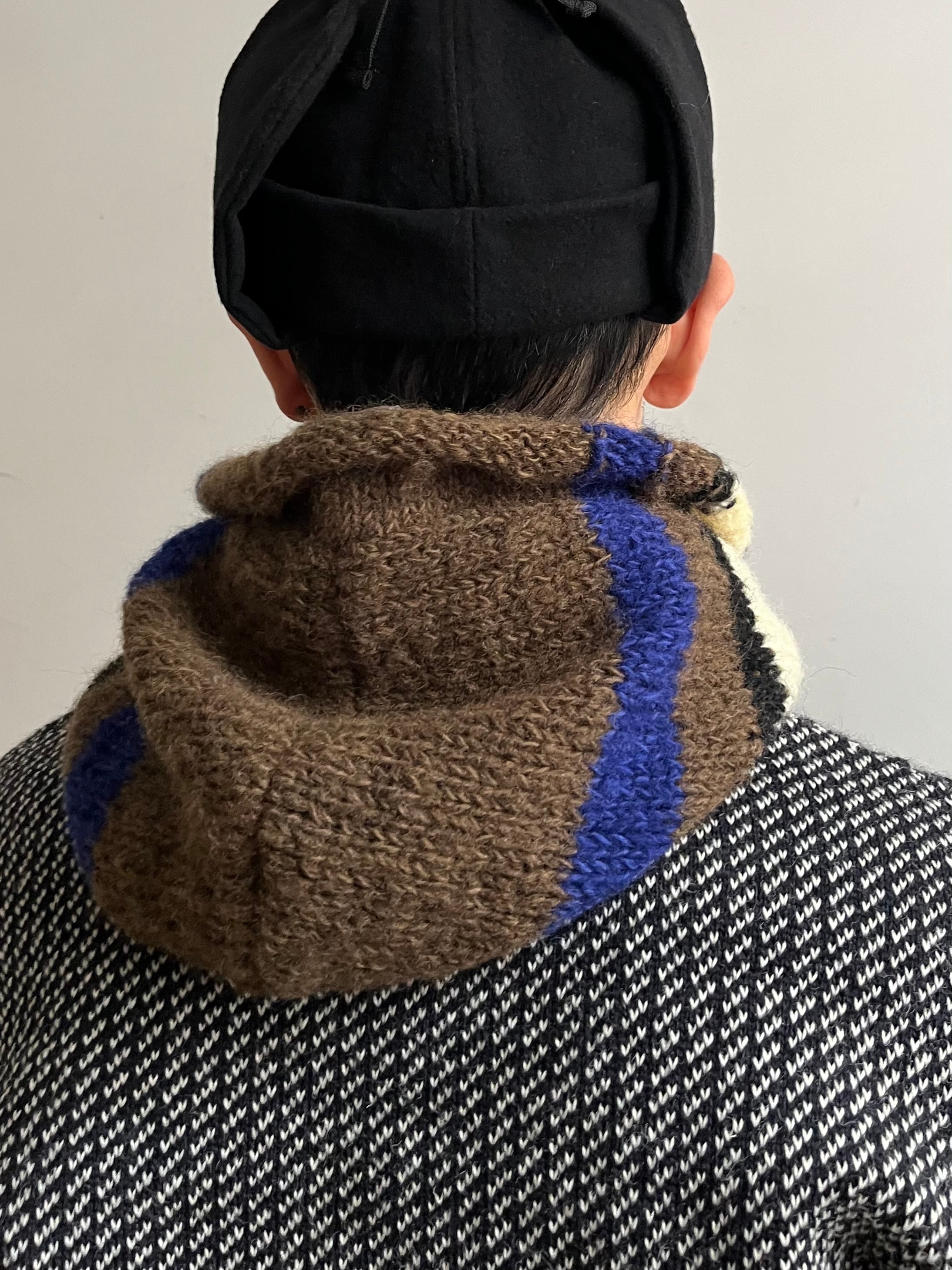 ウールとモヘア混紡のニット素材を使用したバラクラバ。ライン部分の配色が良い雰囲気、フード付きのスヌードの様な感覚で着用でき、コーディネートのアクセントに丁度良い一品です。同素材の「HAND KNIT LINE GLOVE」とのセットもお勧め。