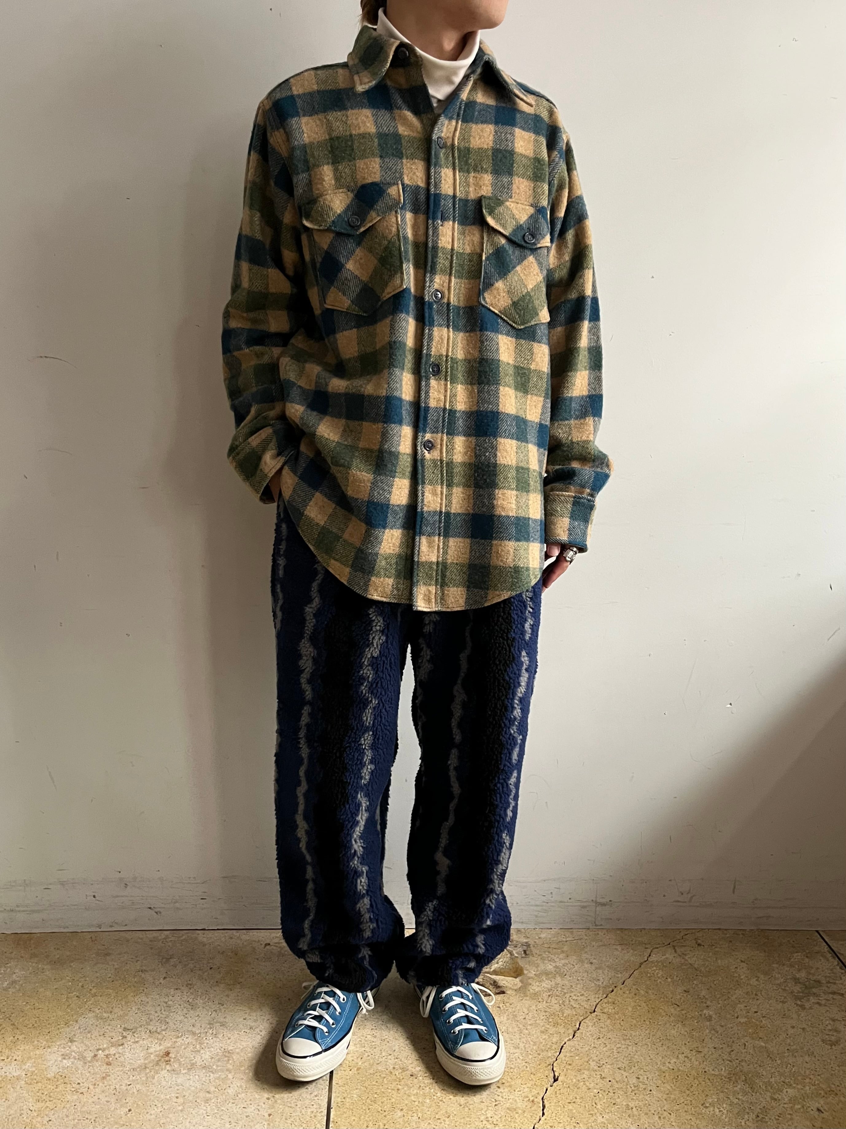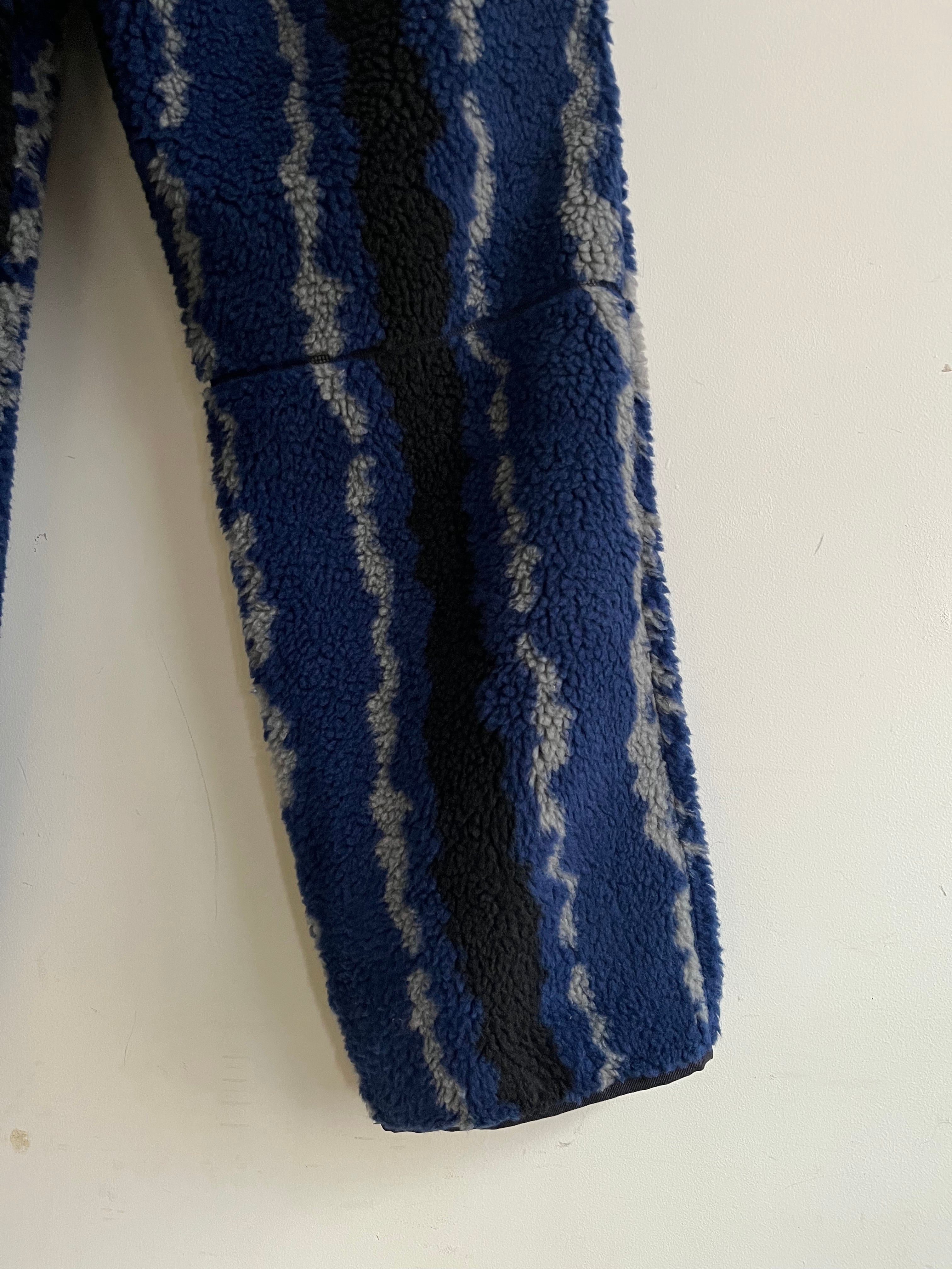 稲妻を思わせるような柄が印象的な一着。特徴的でありながら落ち着いた配色で履きやすい印象、厚みのあるボア素材で幅感はありますが全体的にすっきりとしたストレートシルエット。