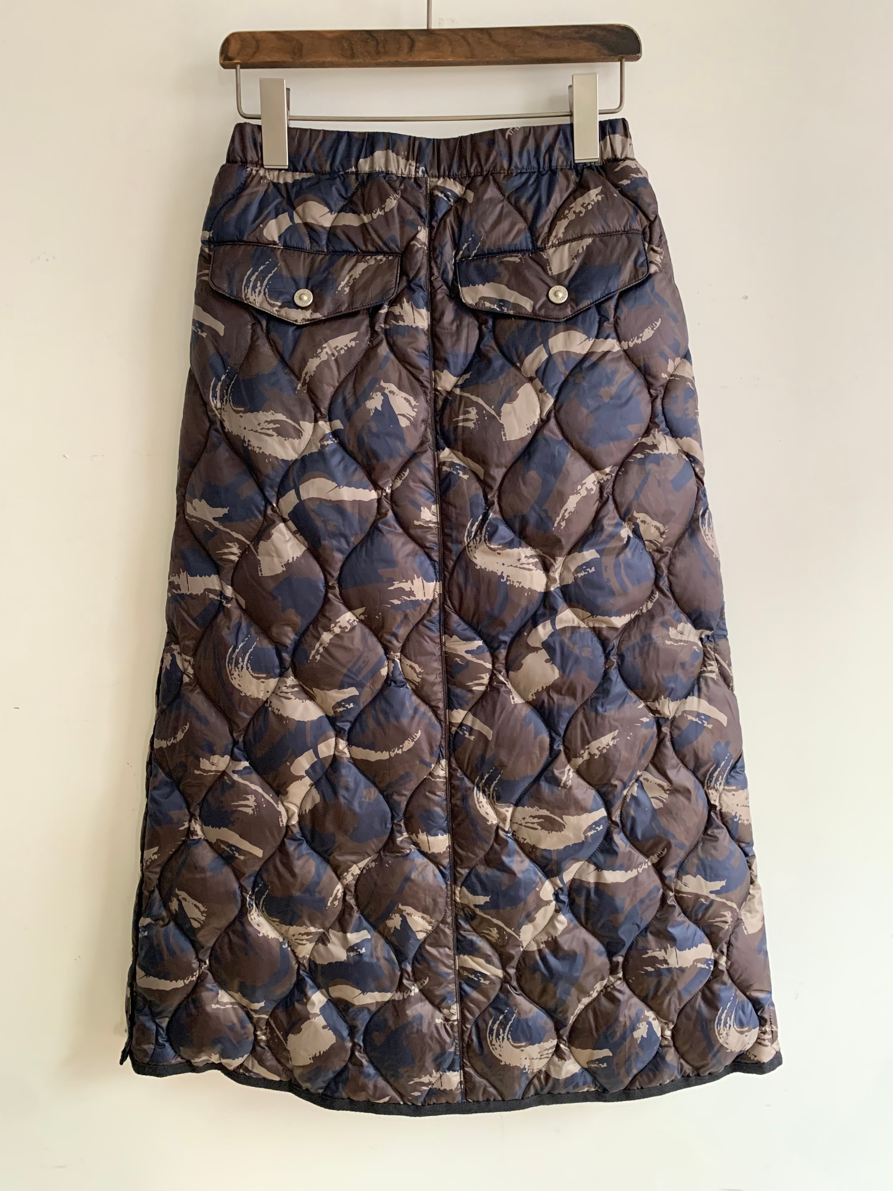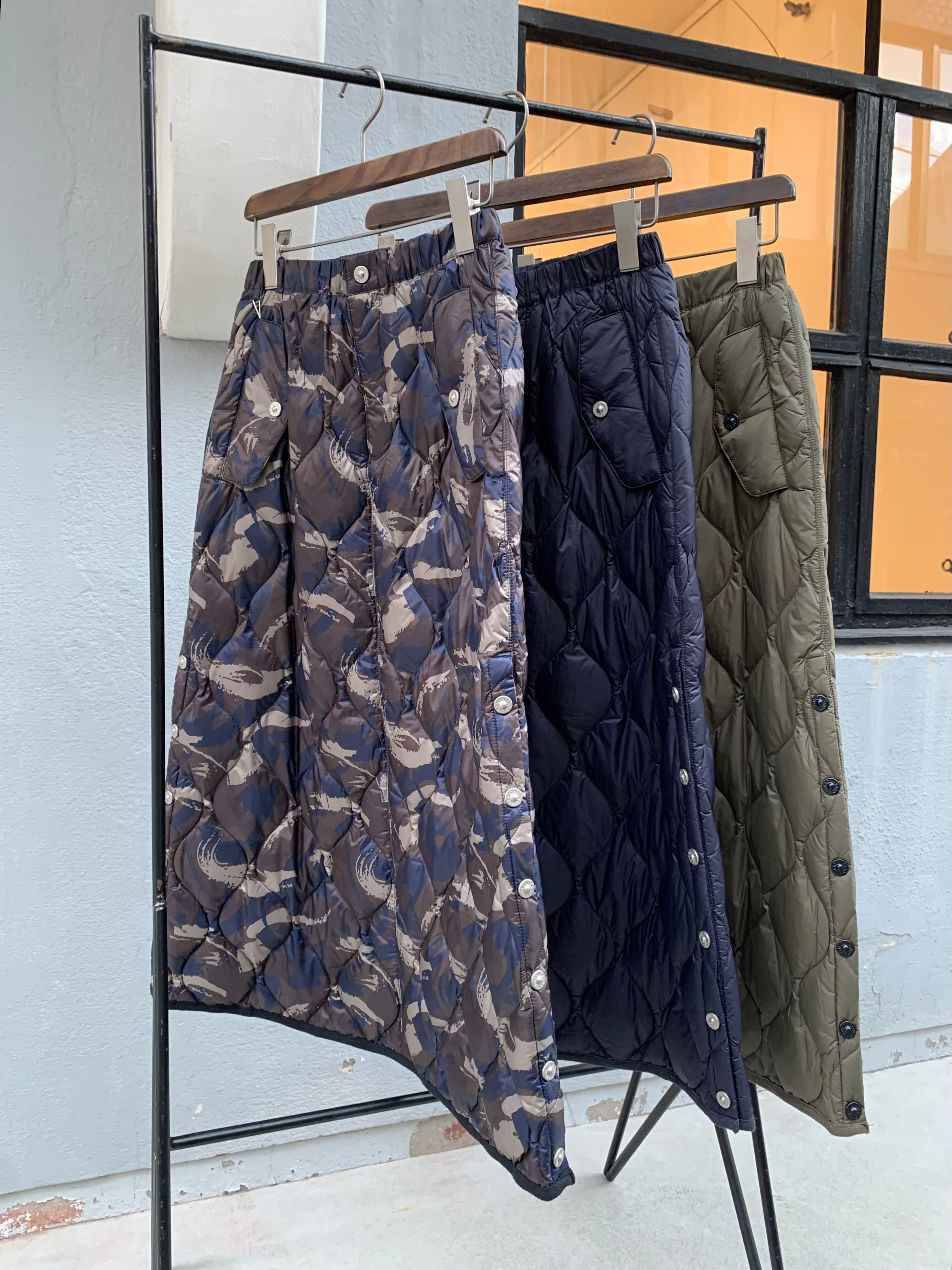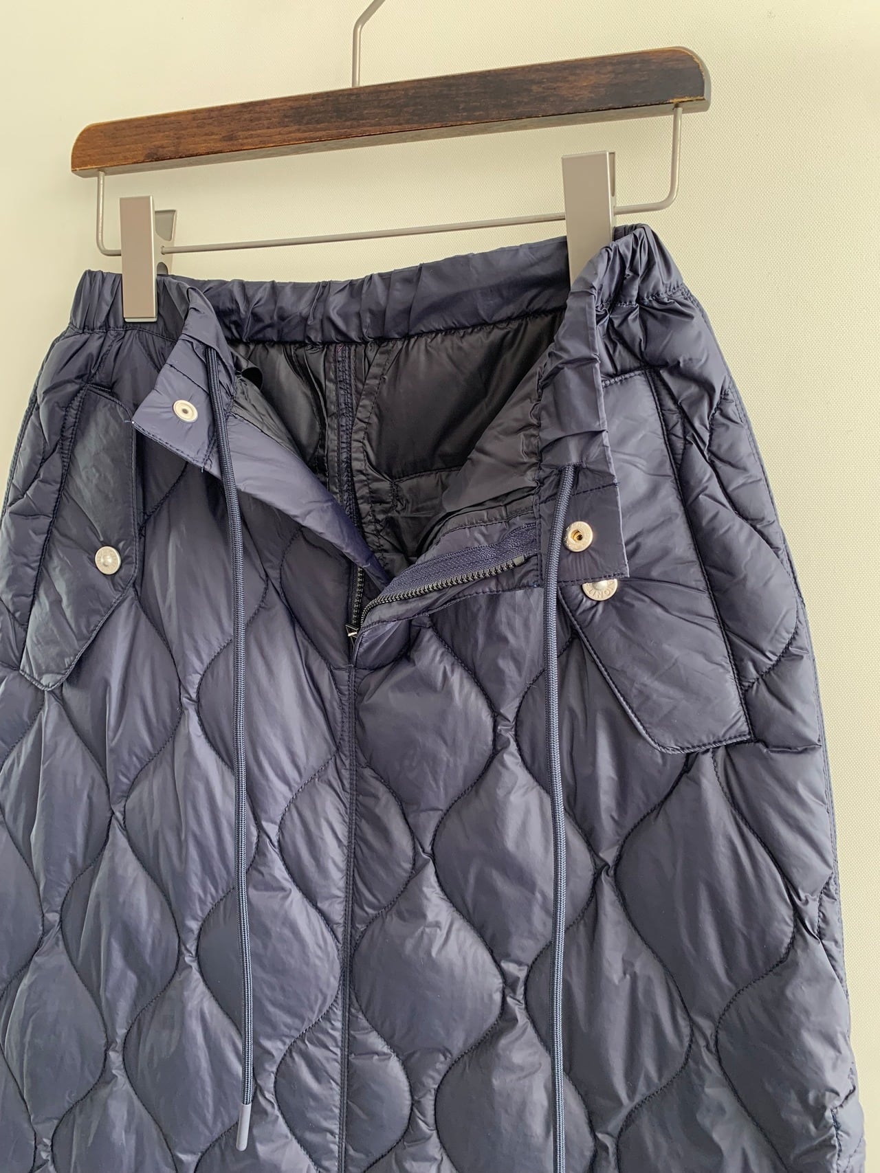 裾にかけて広がるAラインシルエットのミリタリーダウンスカート。