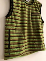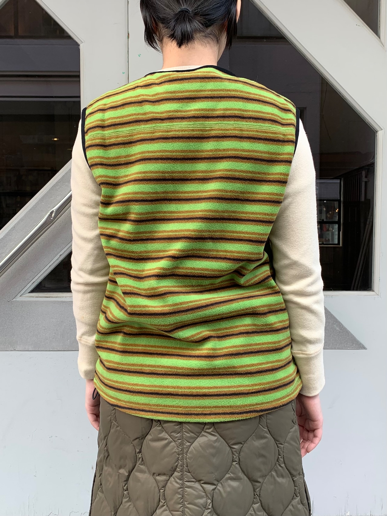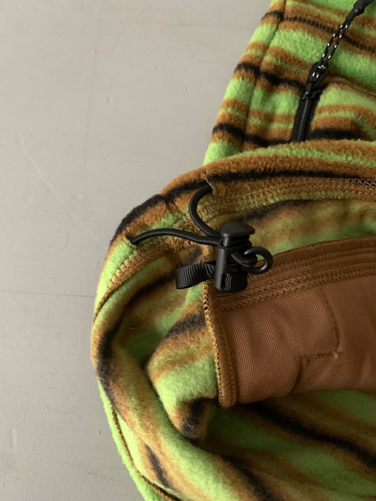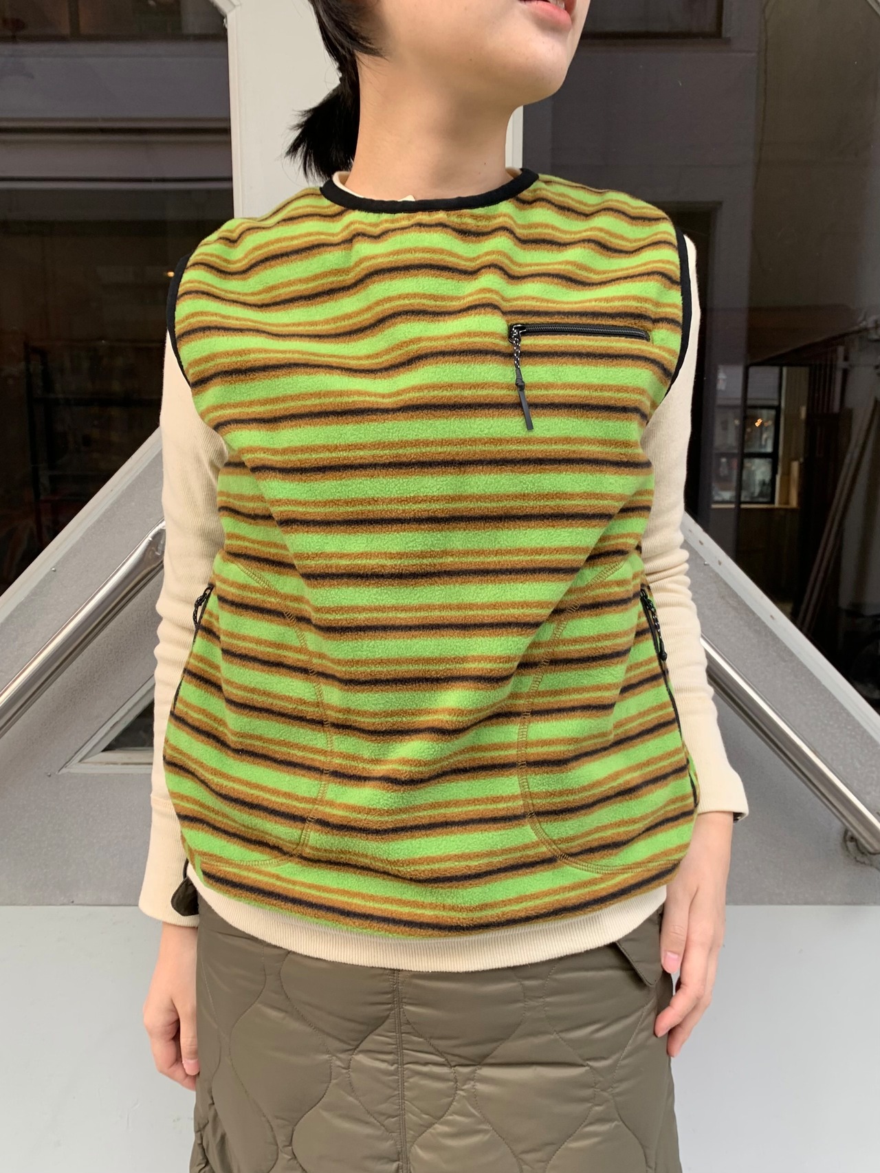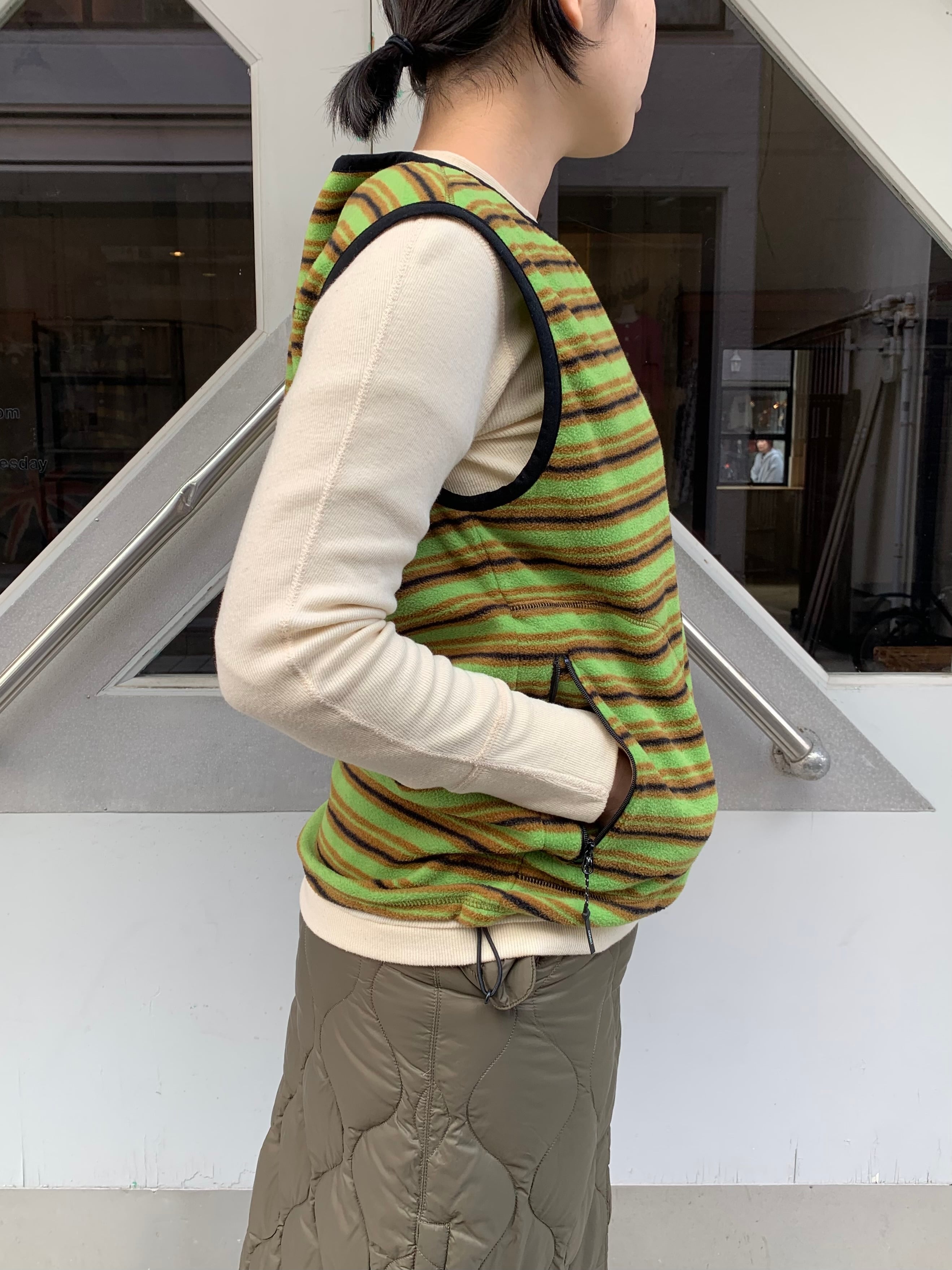 リサイクルポリエステルを使用したやや厚手なフリース素材で軽くて暖かく、ソフトな肌触り。新鮮さとどこか懐かしさを感じるきれいな色目のボーダーで、寒い季節はアウター下のミドルレイヤーとしてもアクセントになります。裾のドローコードでシルエットの調整も可◎