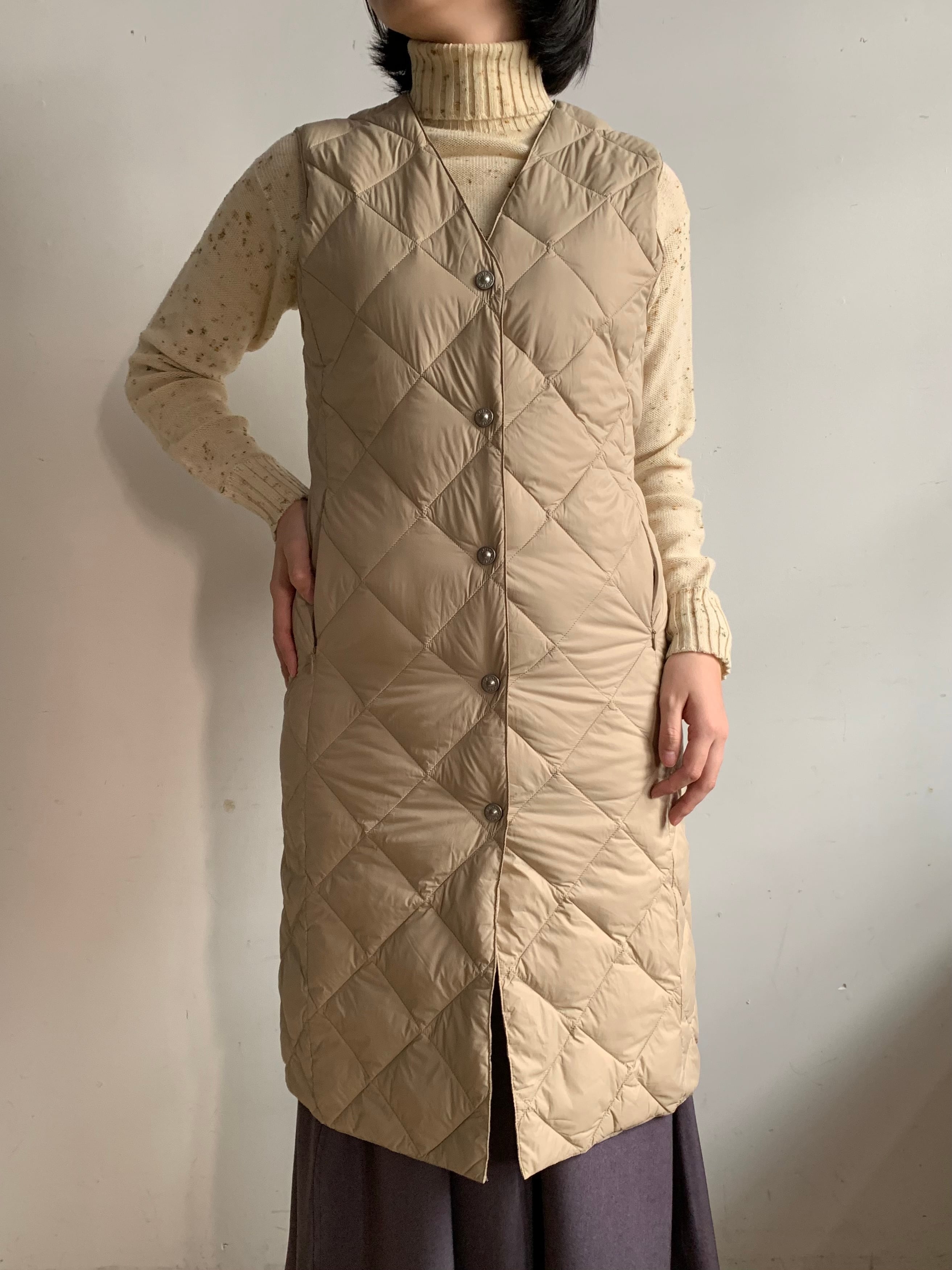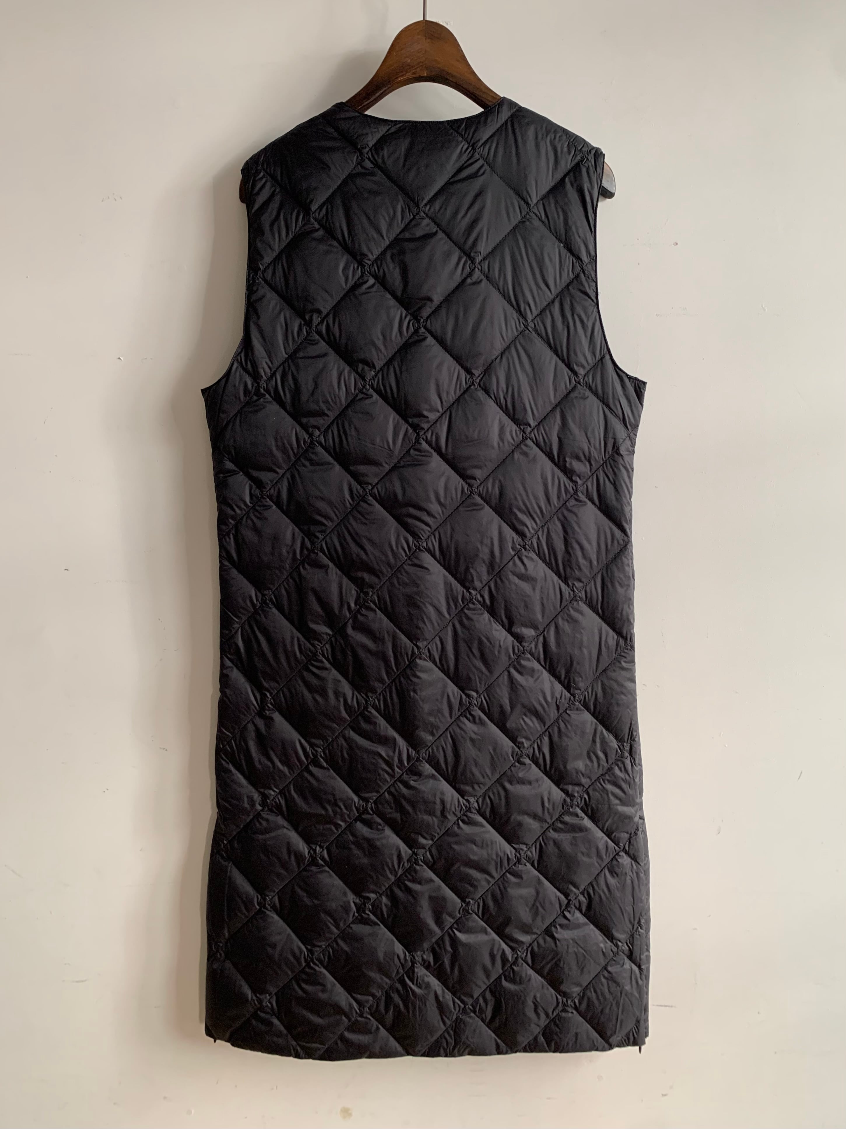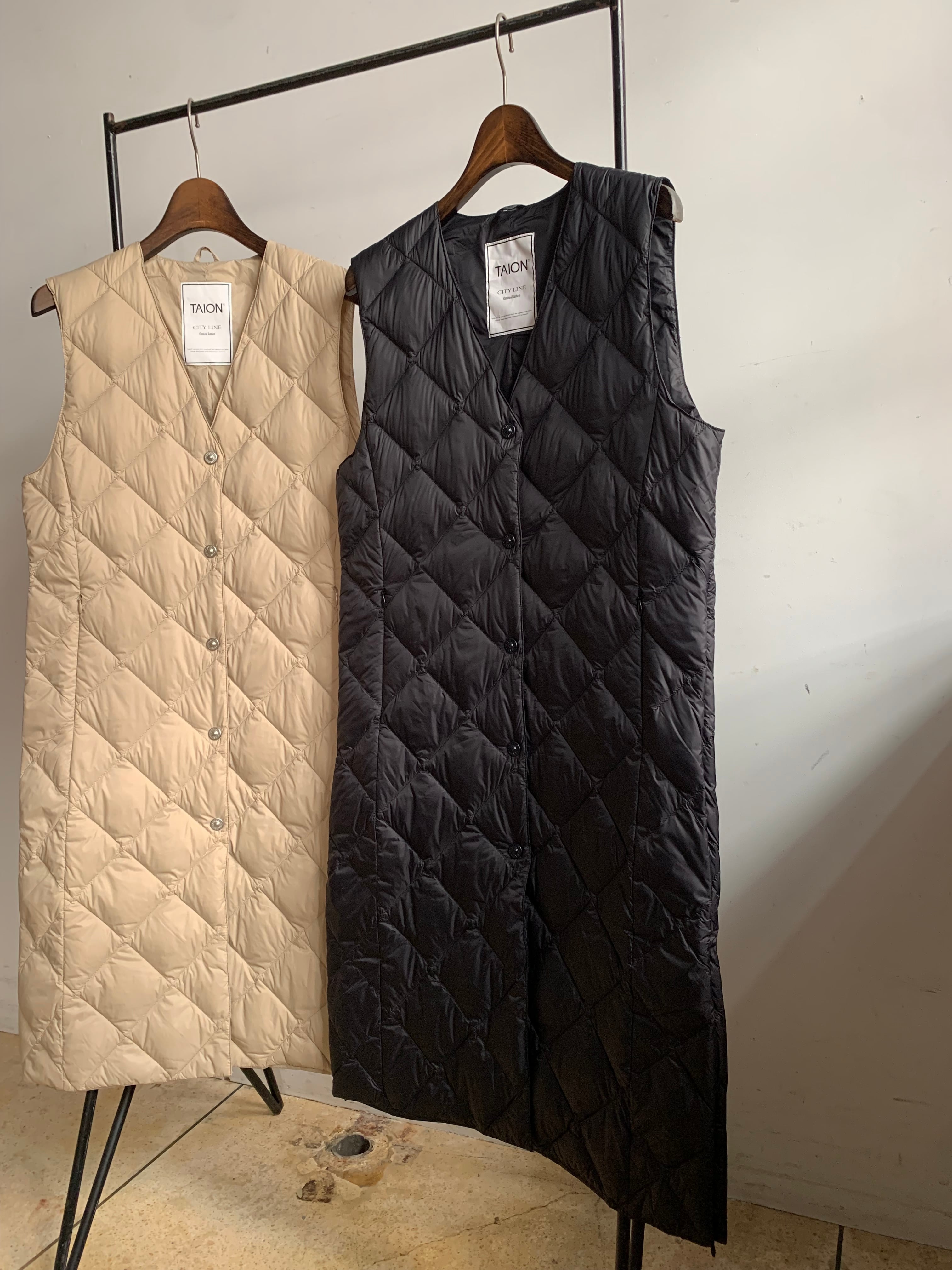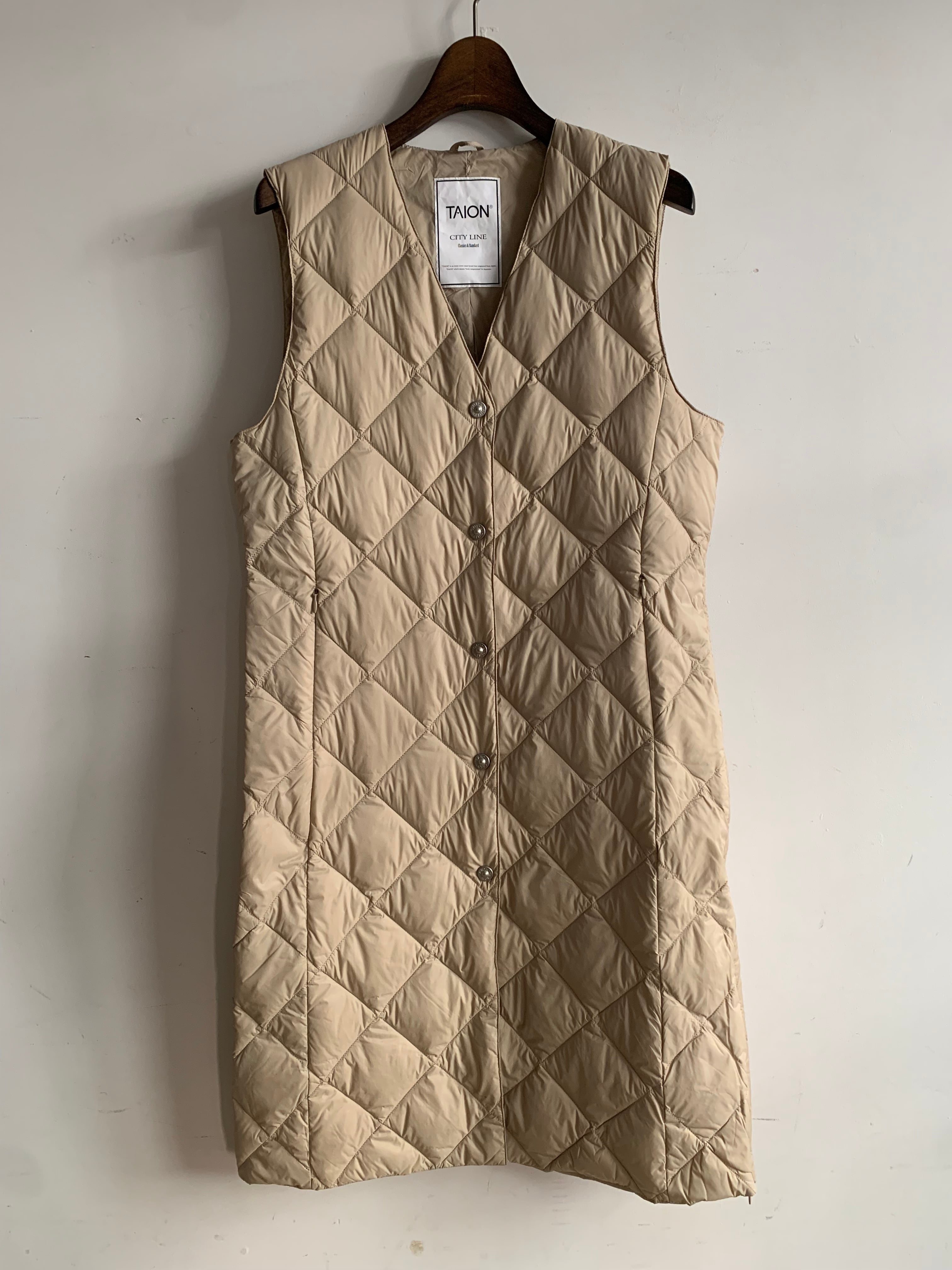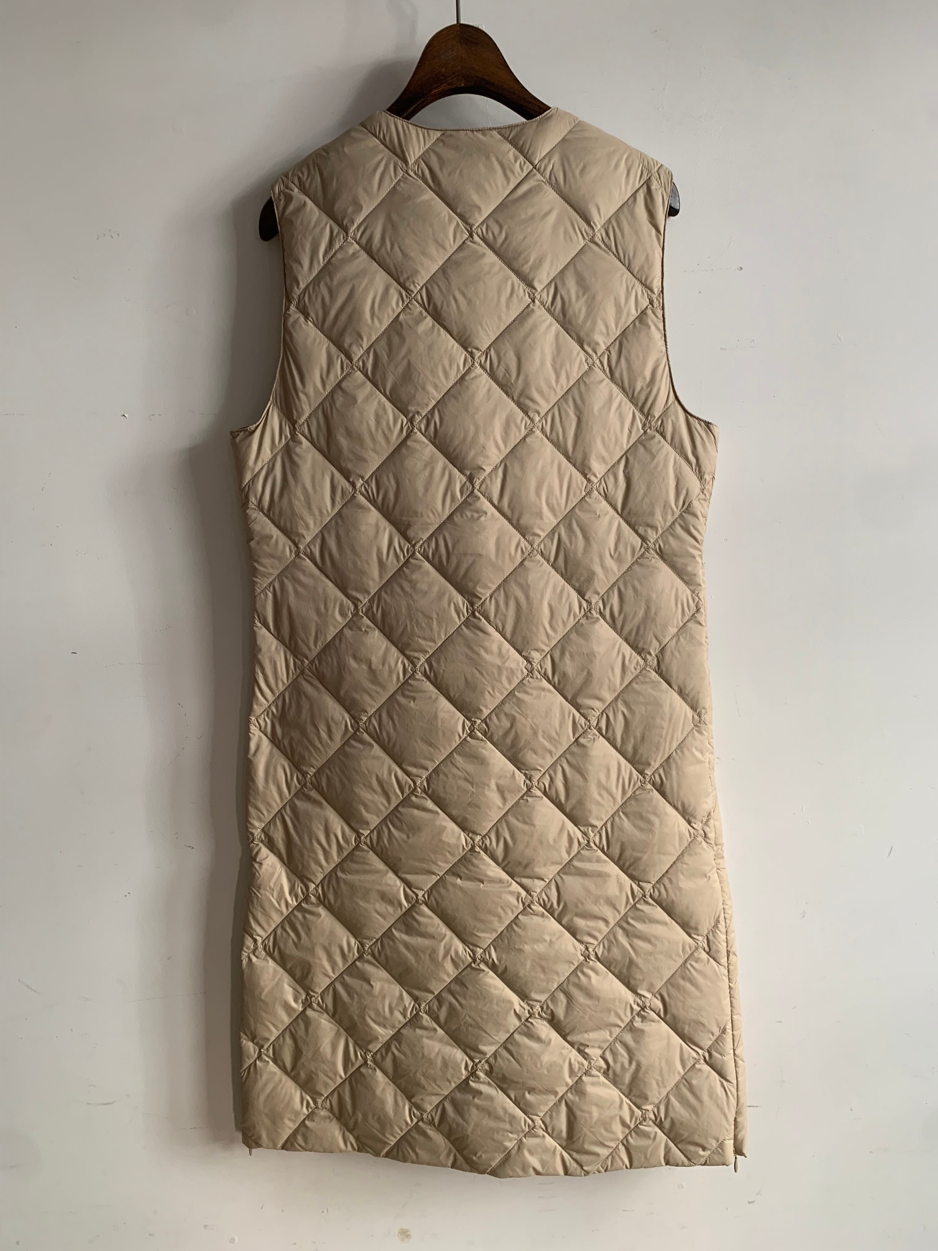 ダイヤモンド型のキルトが上品な印象のロングダウンジレ。