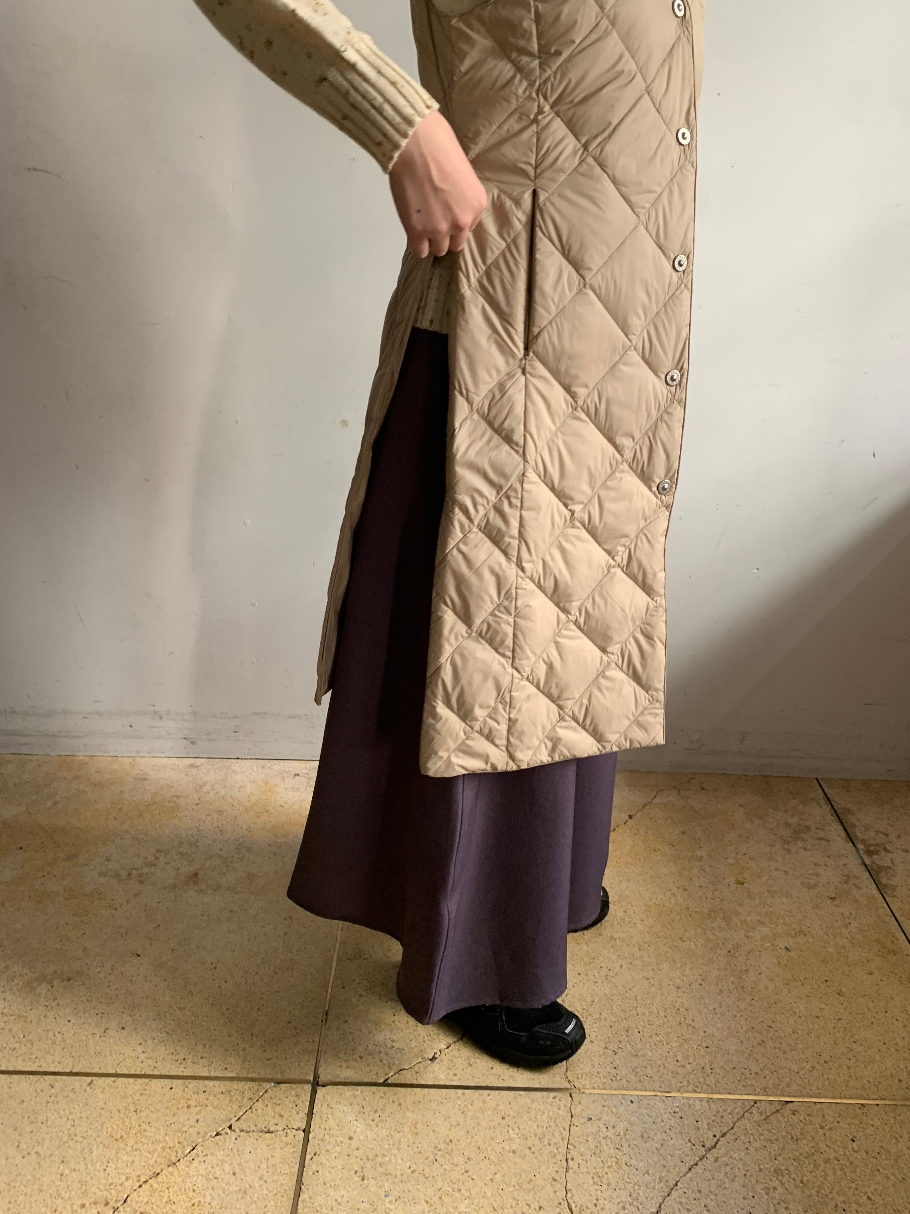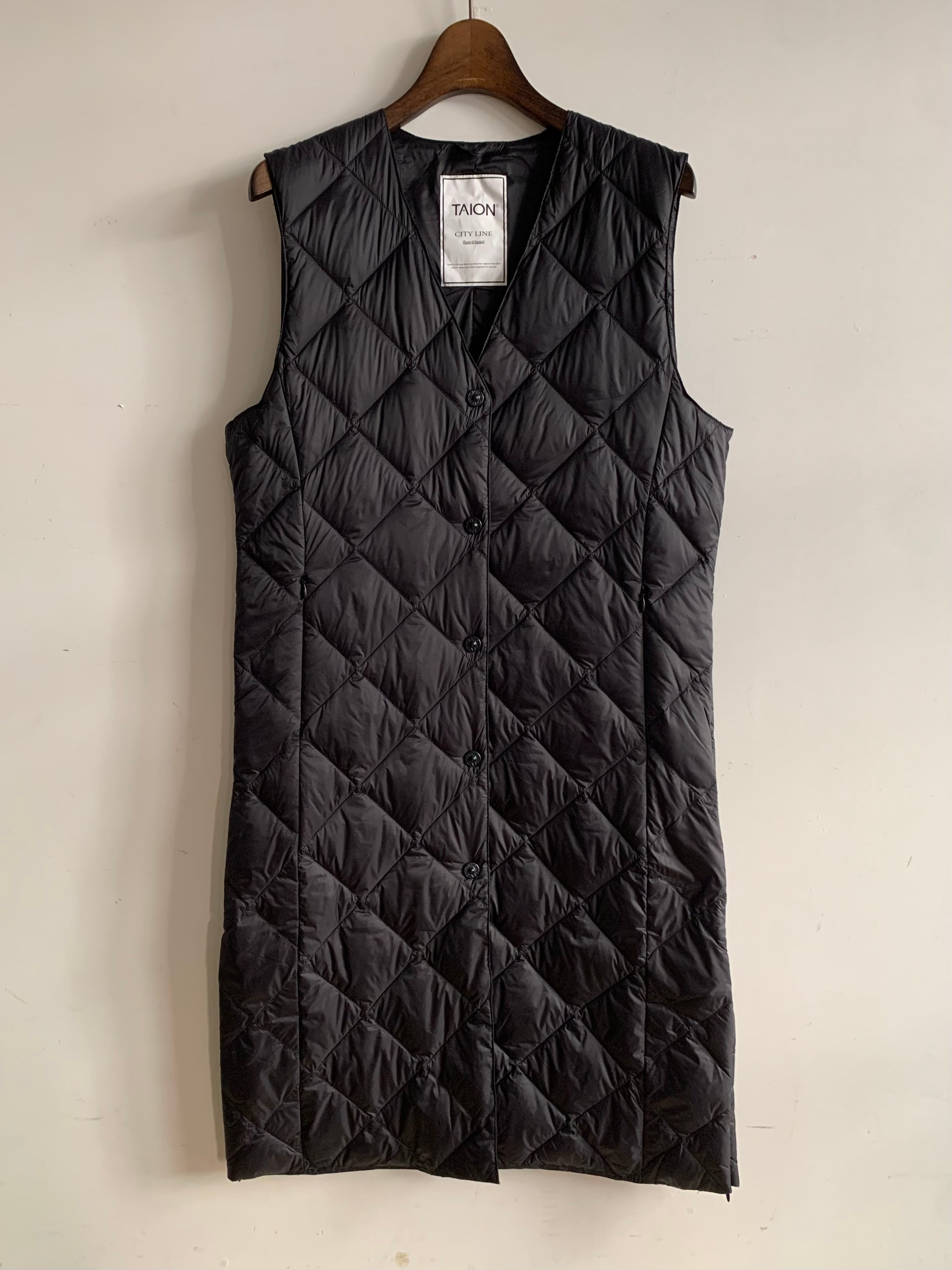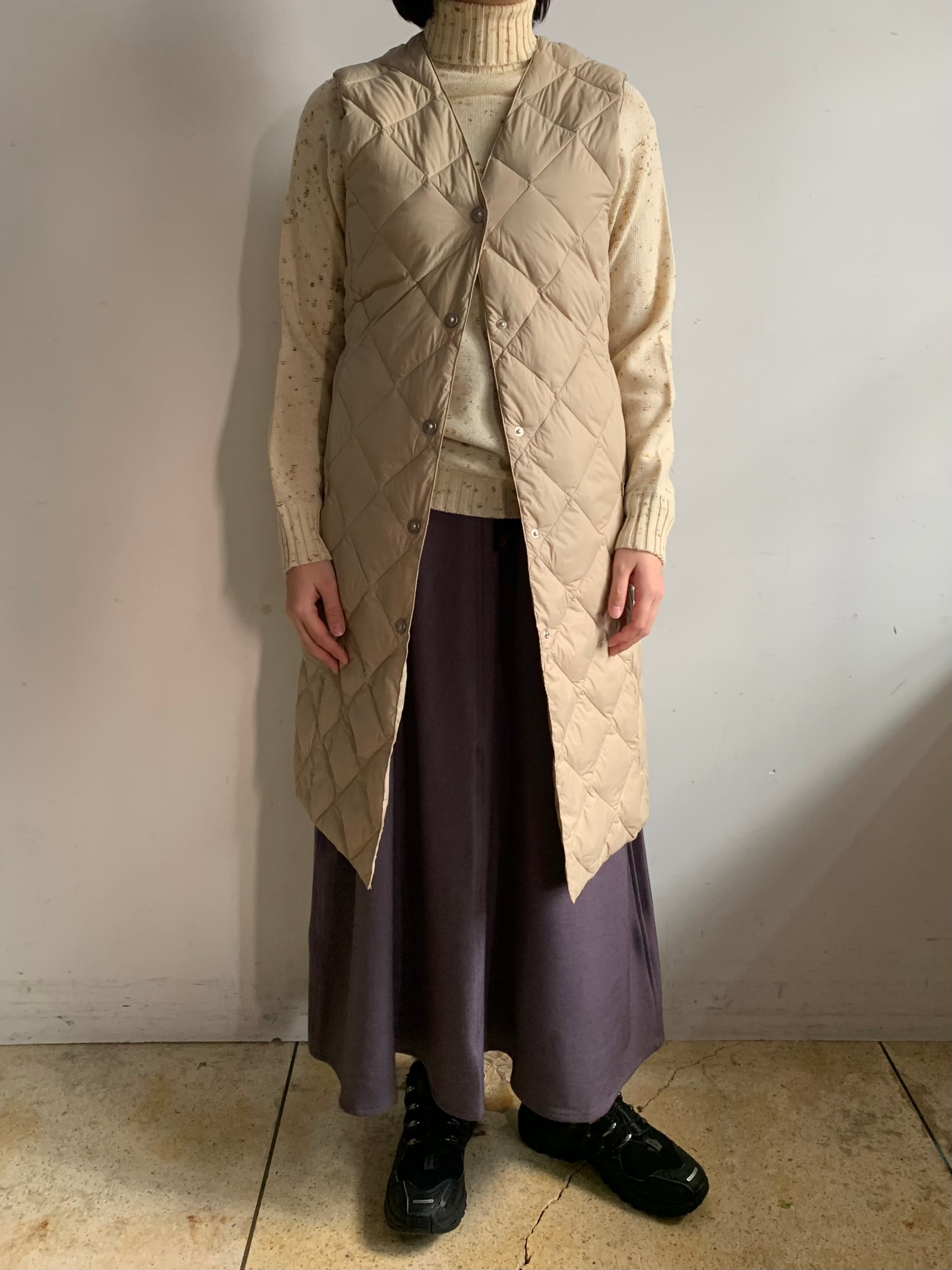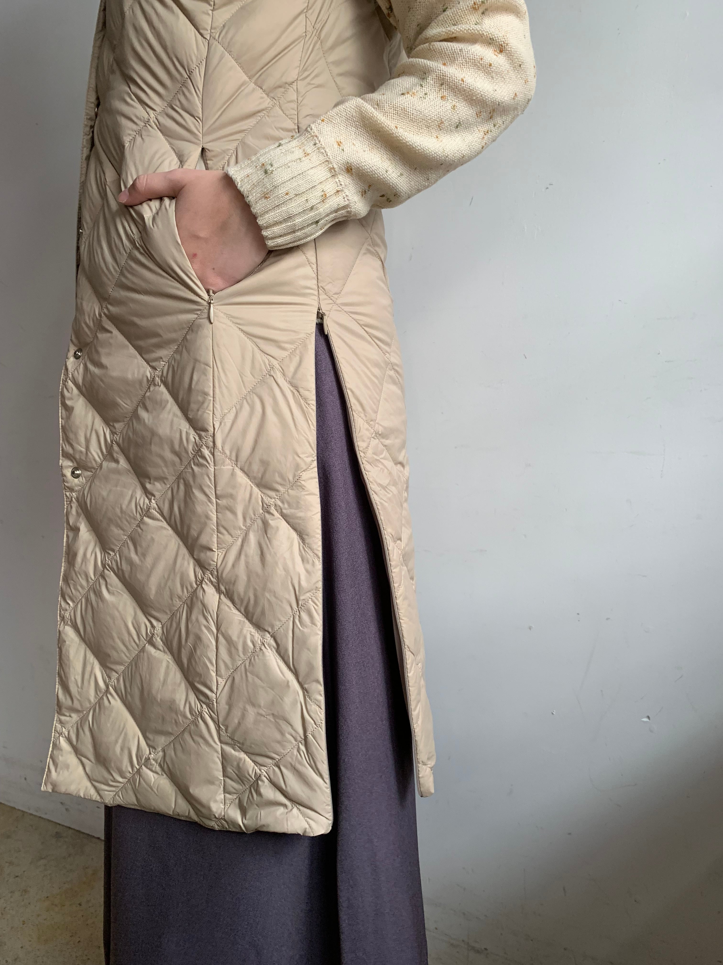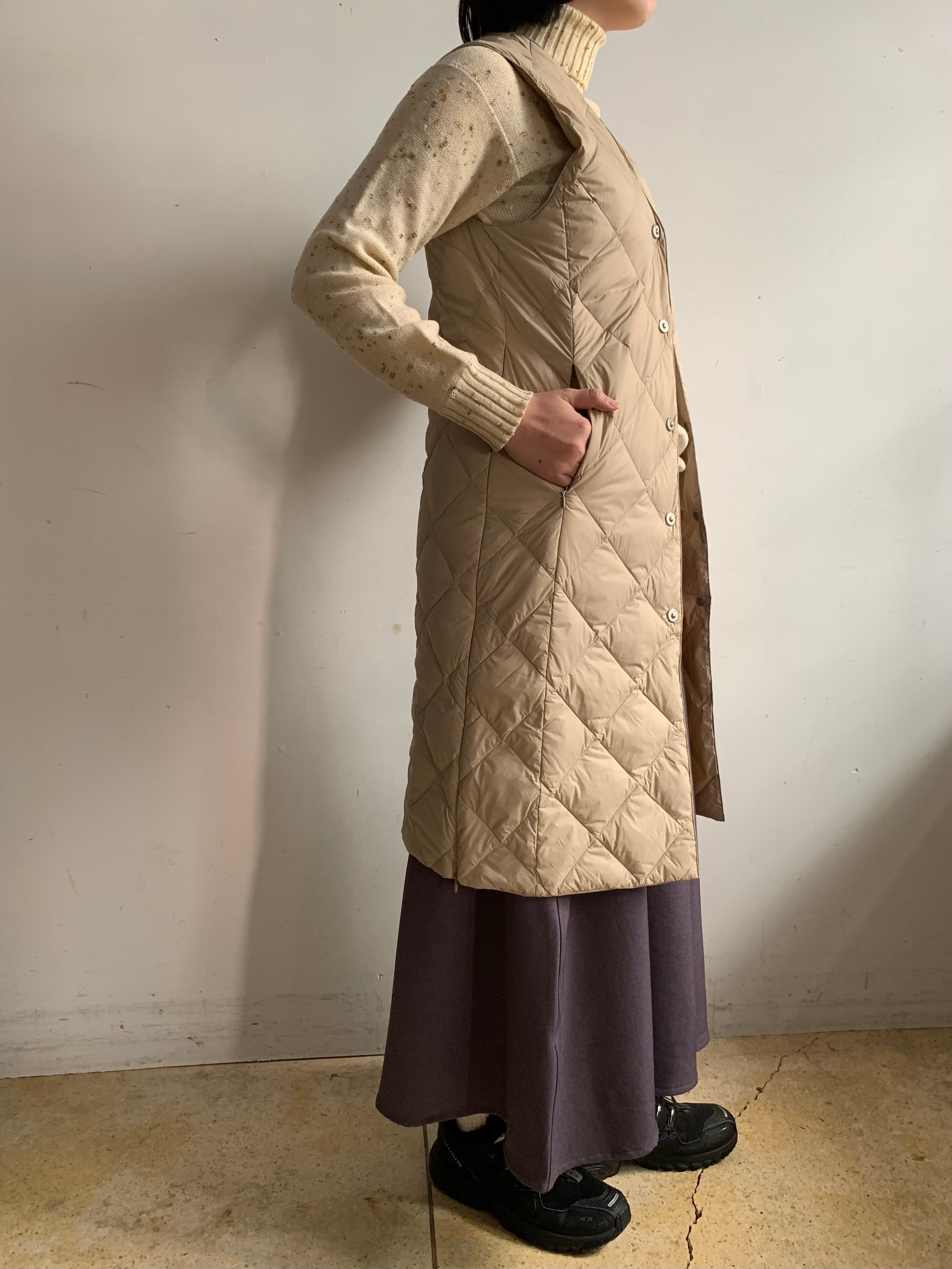 ダイヤモンド型のキルトが上品な印象のロングダウンジレ。