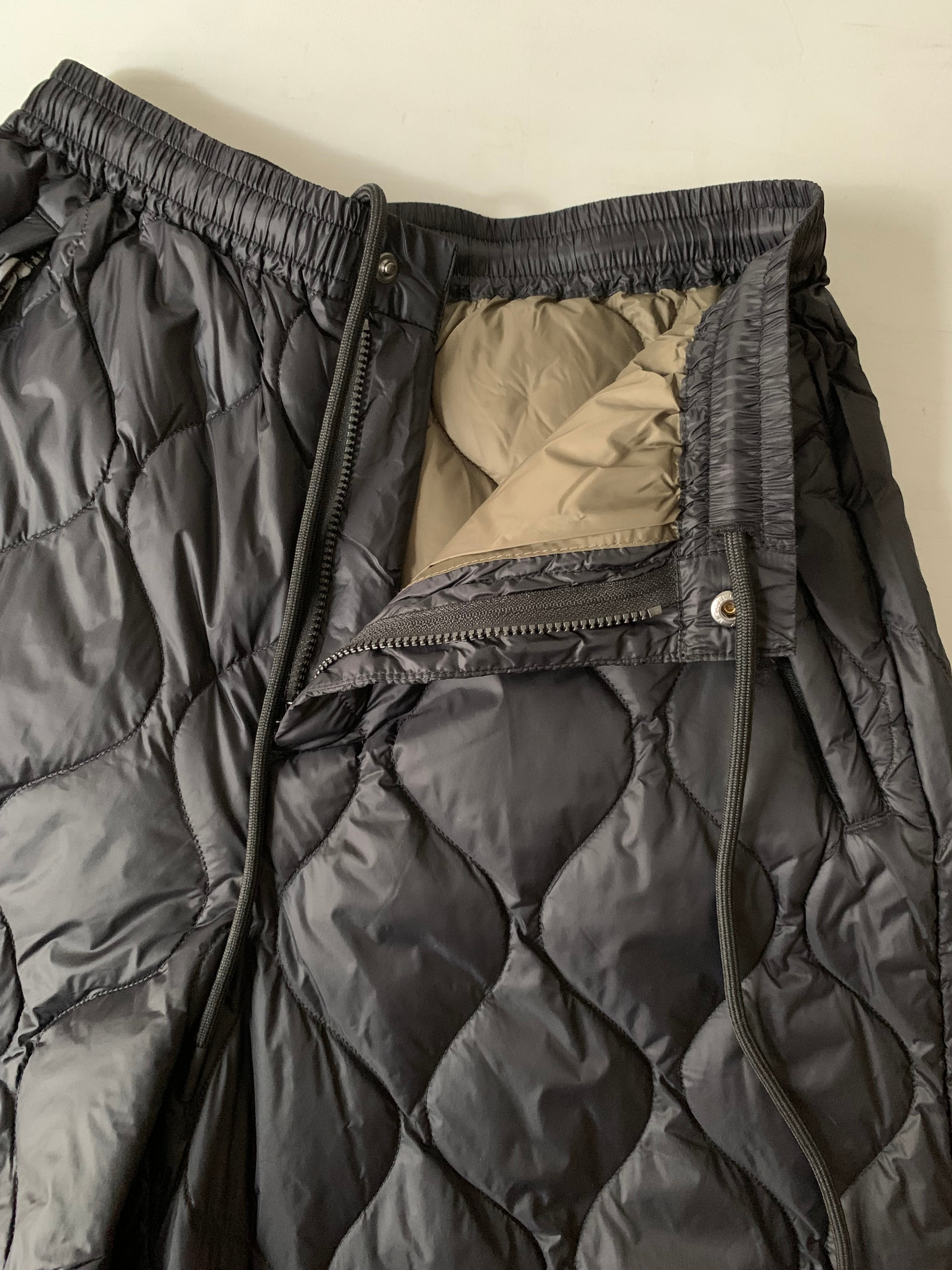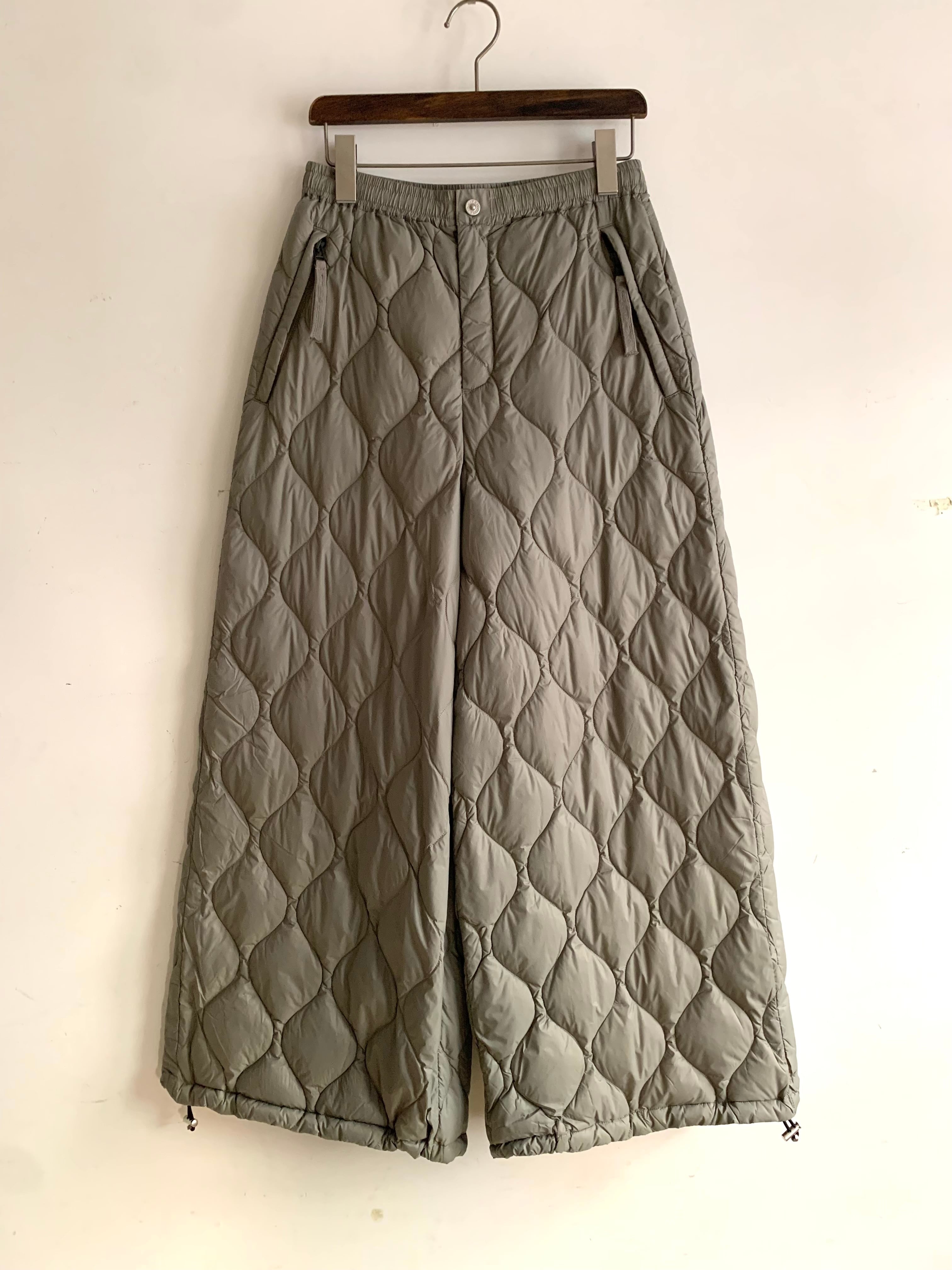 キュロットスカートのように裾が広がるワイドシルエットのダウンパンツ。
