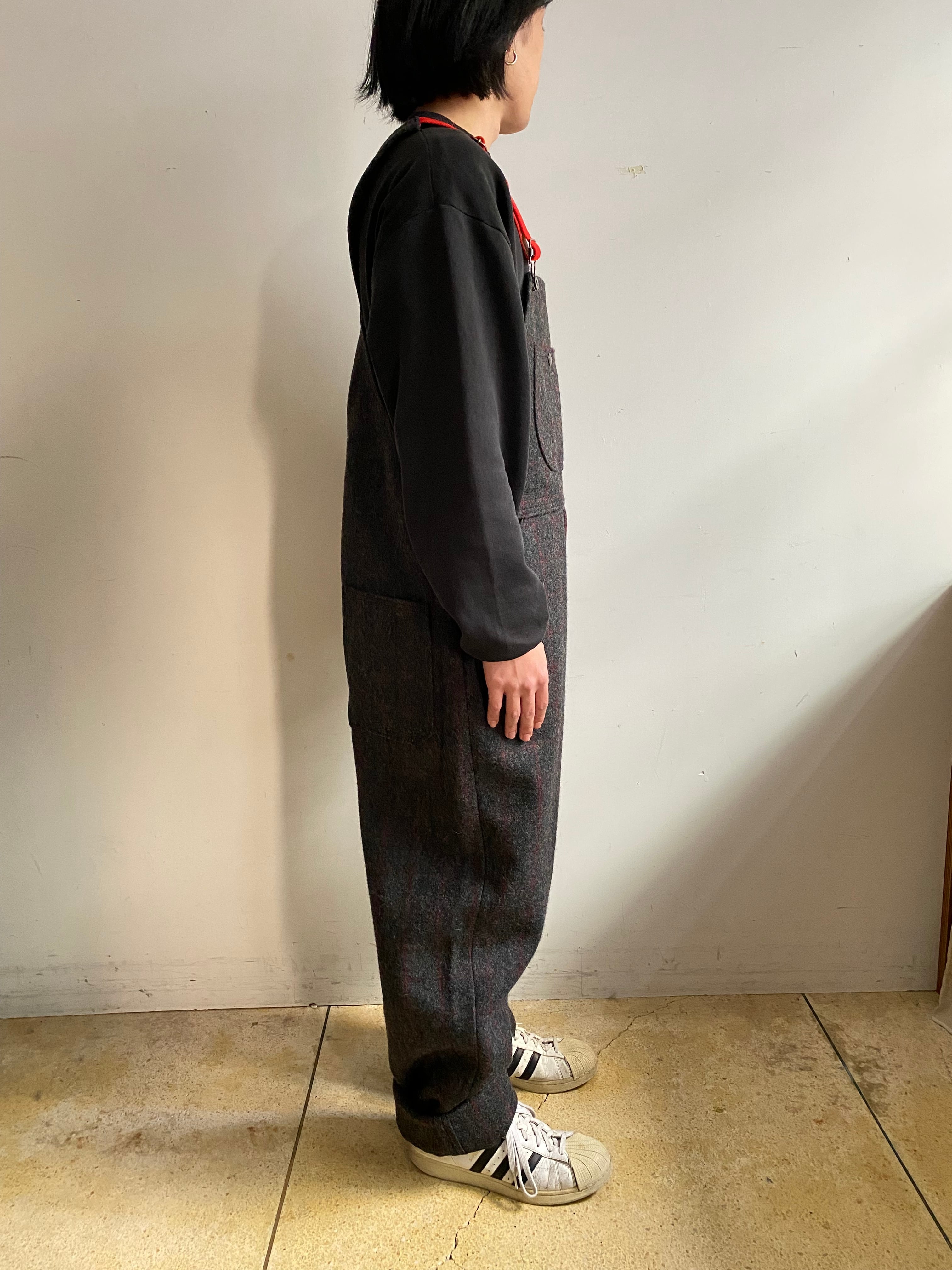 赤いサスペンダーが目を引く存在感たっぷりのオーバーオール。