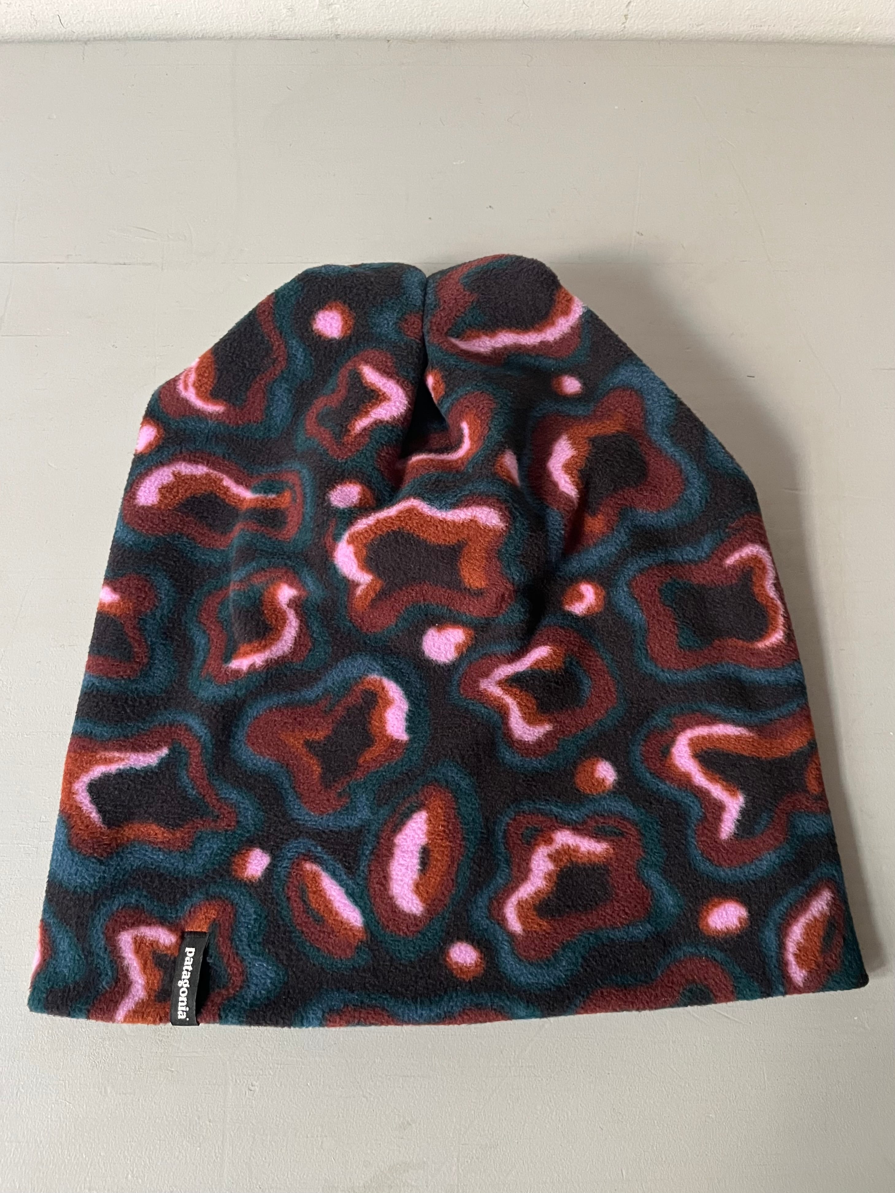 軽量さとソフトな肌触りを兼ね備えたマイクロフリース素材を使用したフリースビーニー。アメーバ状の総柄が特徴的、パンチのある柄に対してダークトーンな配色で被り易い印象、コーディネートのワンポイントに是非。