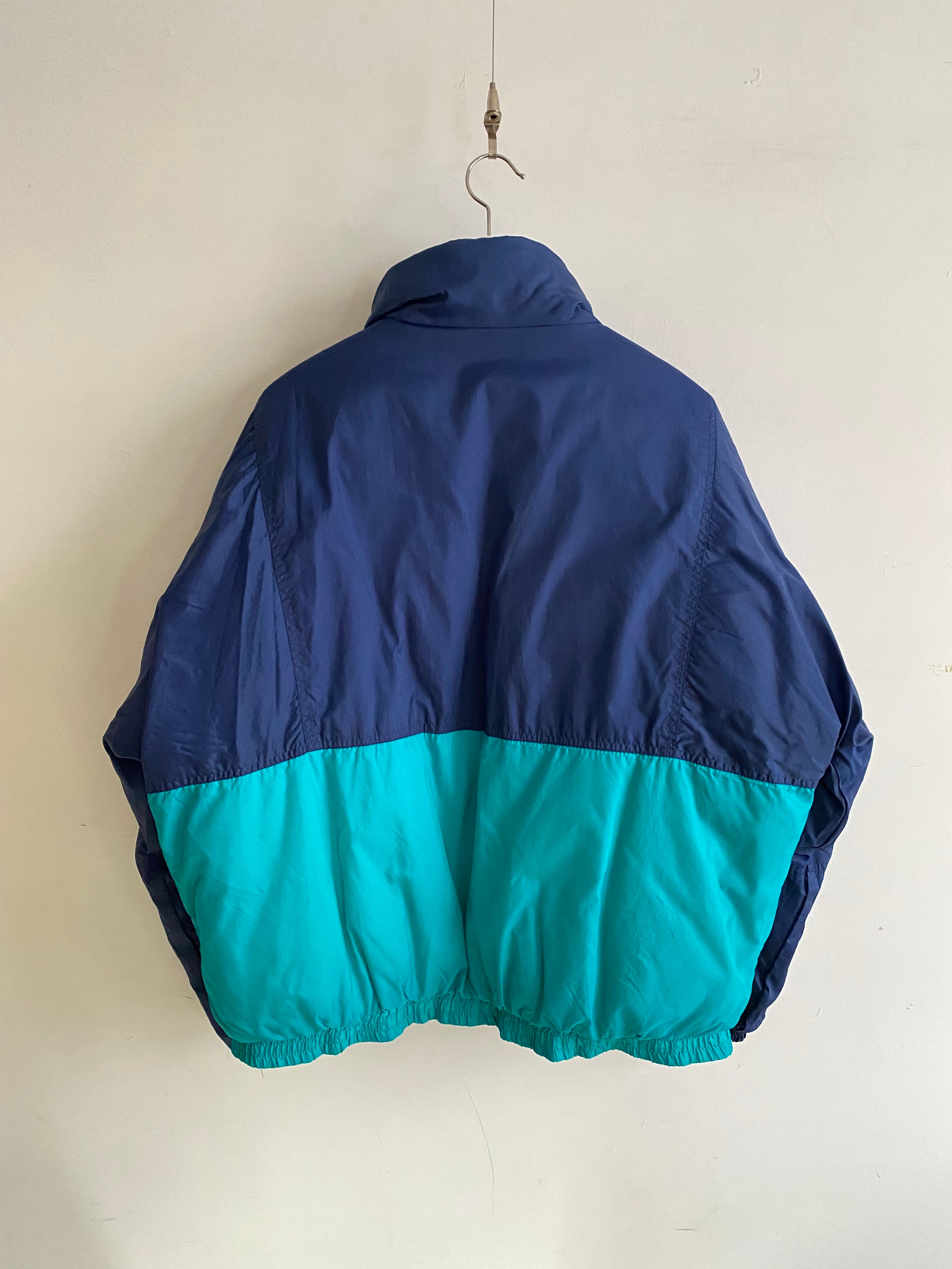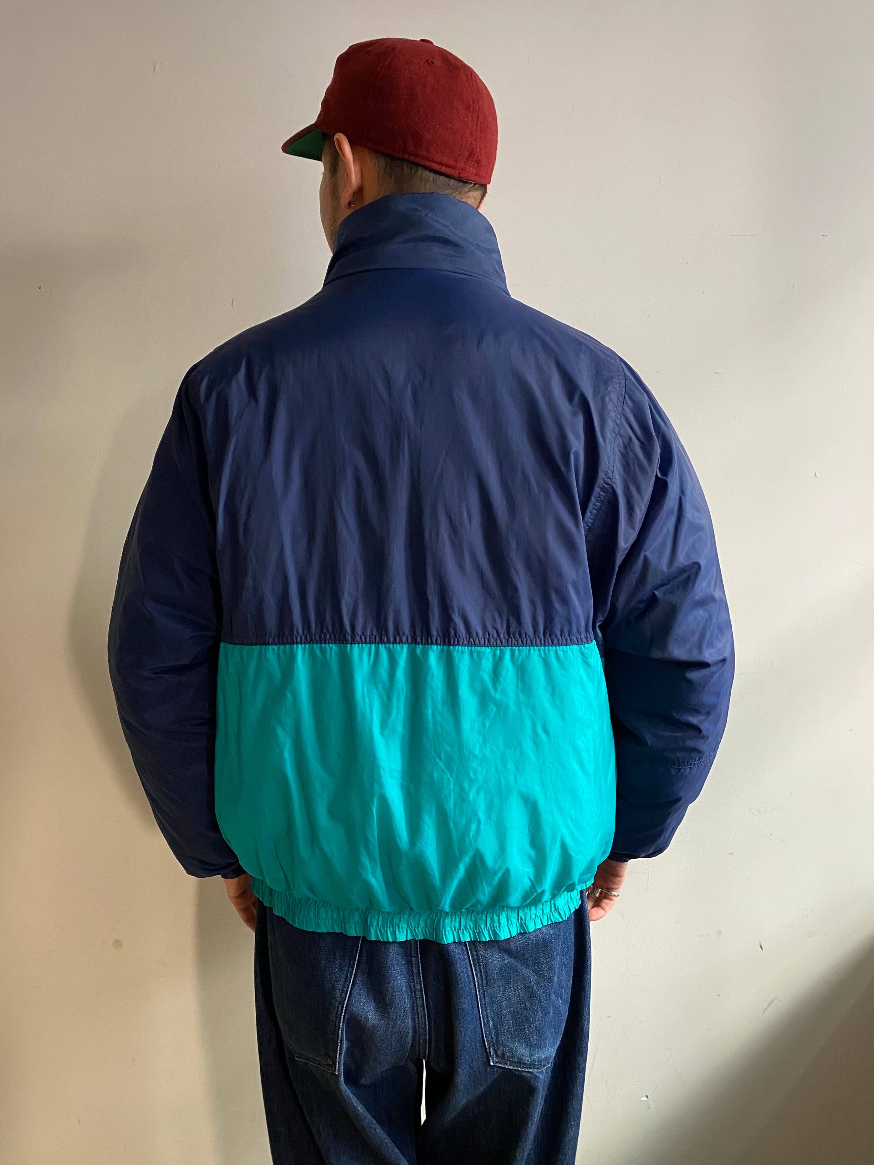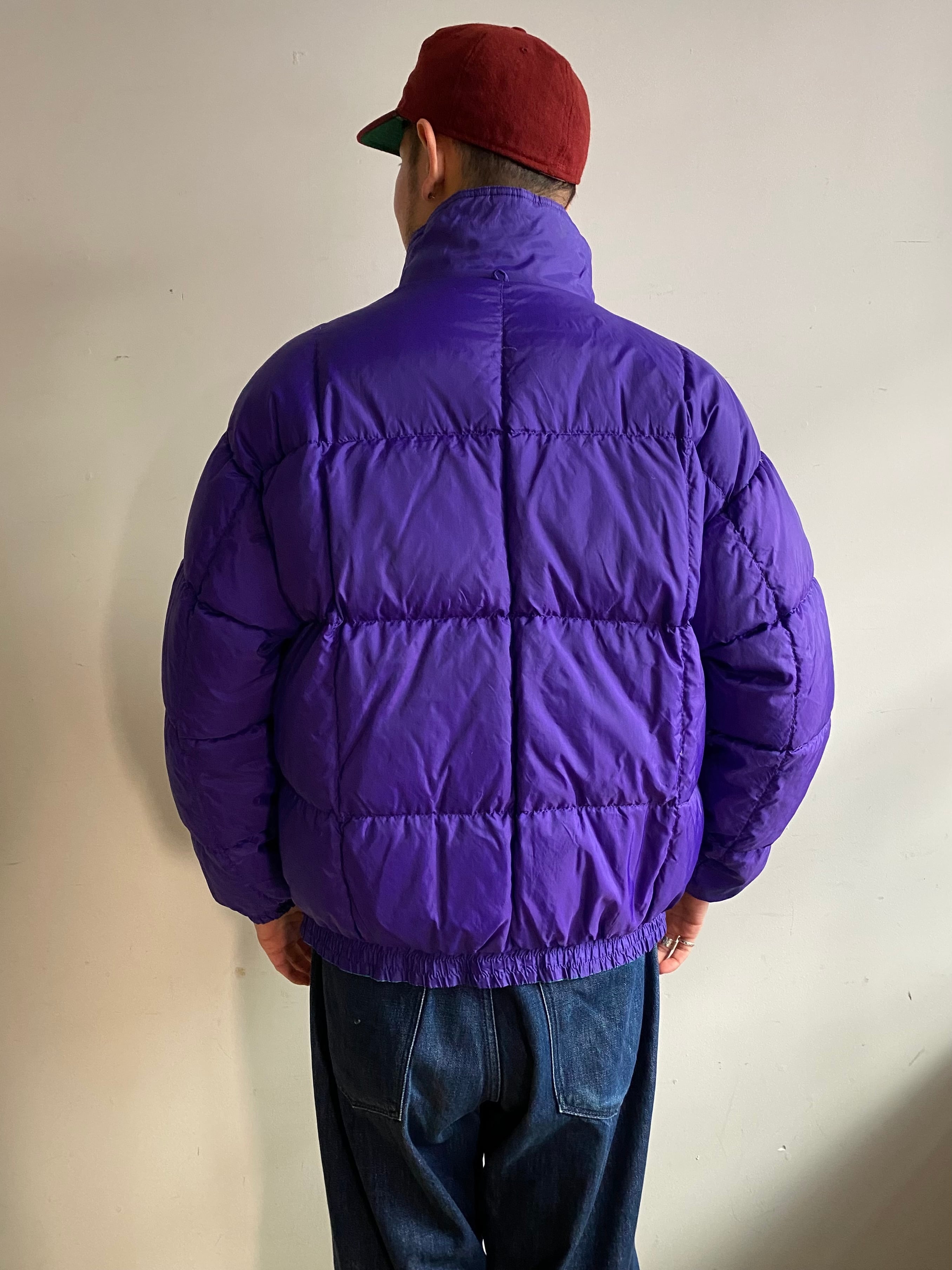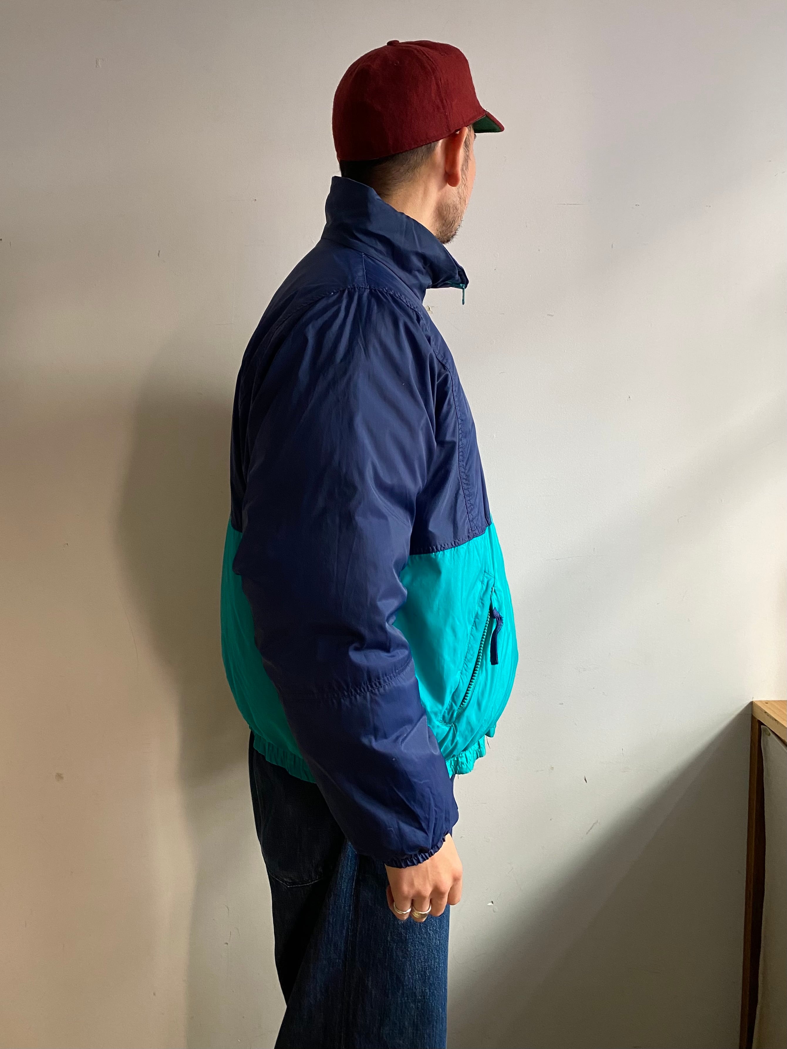 クラシックな切り替えが映えるネイビー×エメラルドグリーン面と、当時の時代背景を感じさせる鮮やかなパープル面のリバーシブル仕様のダウンジャケット