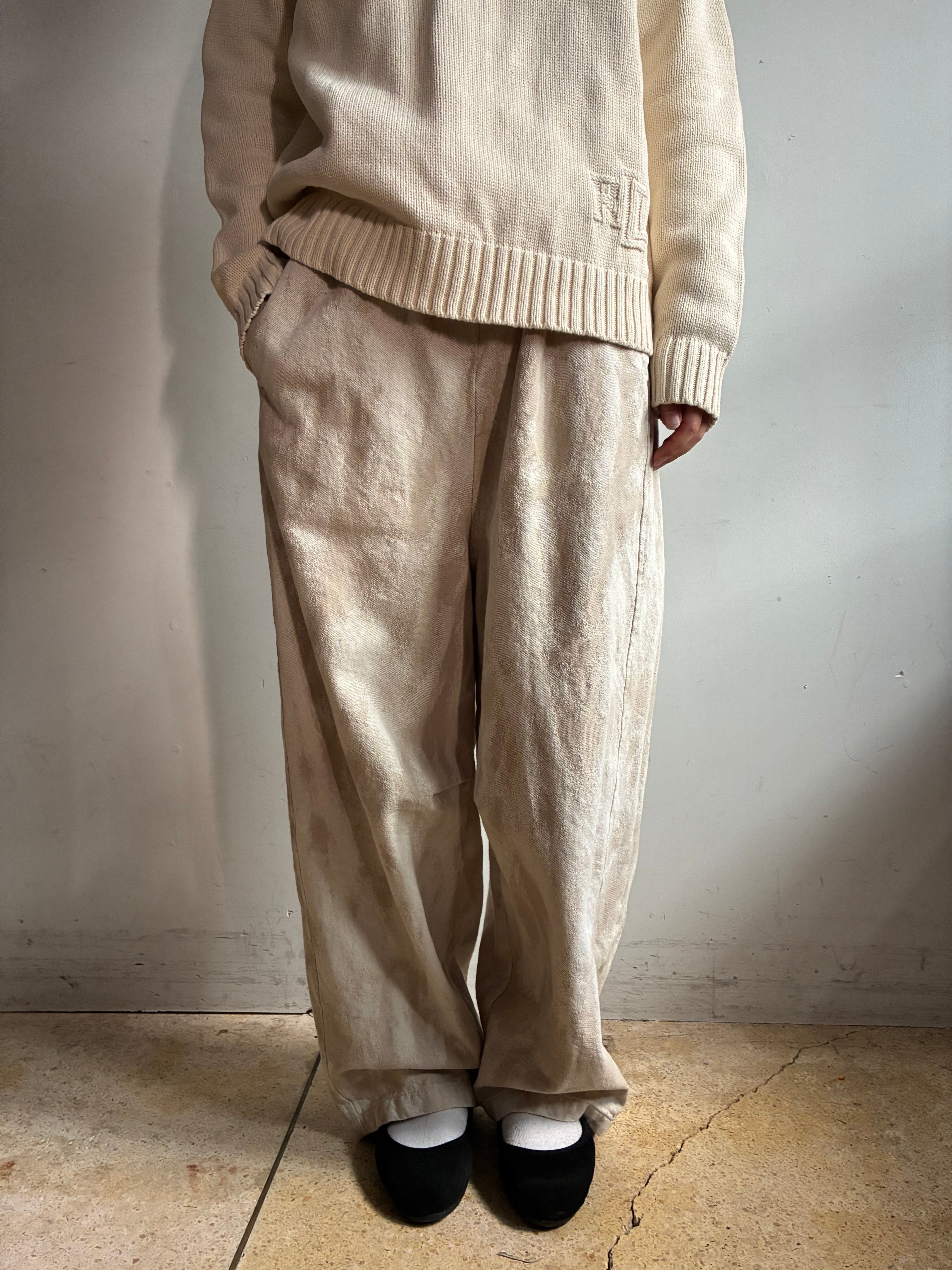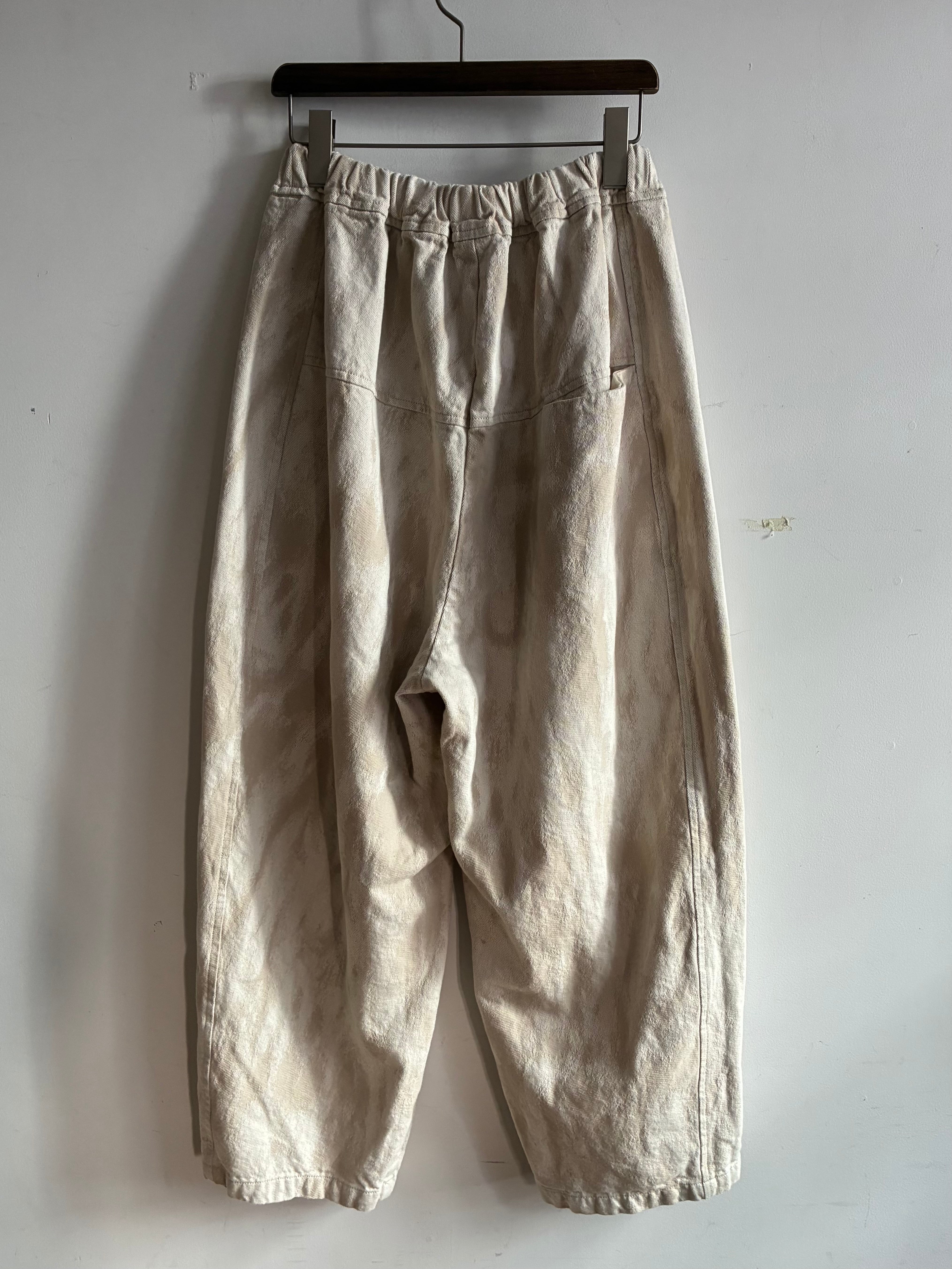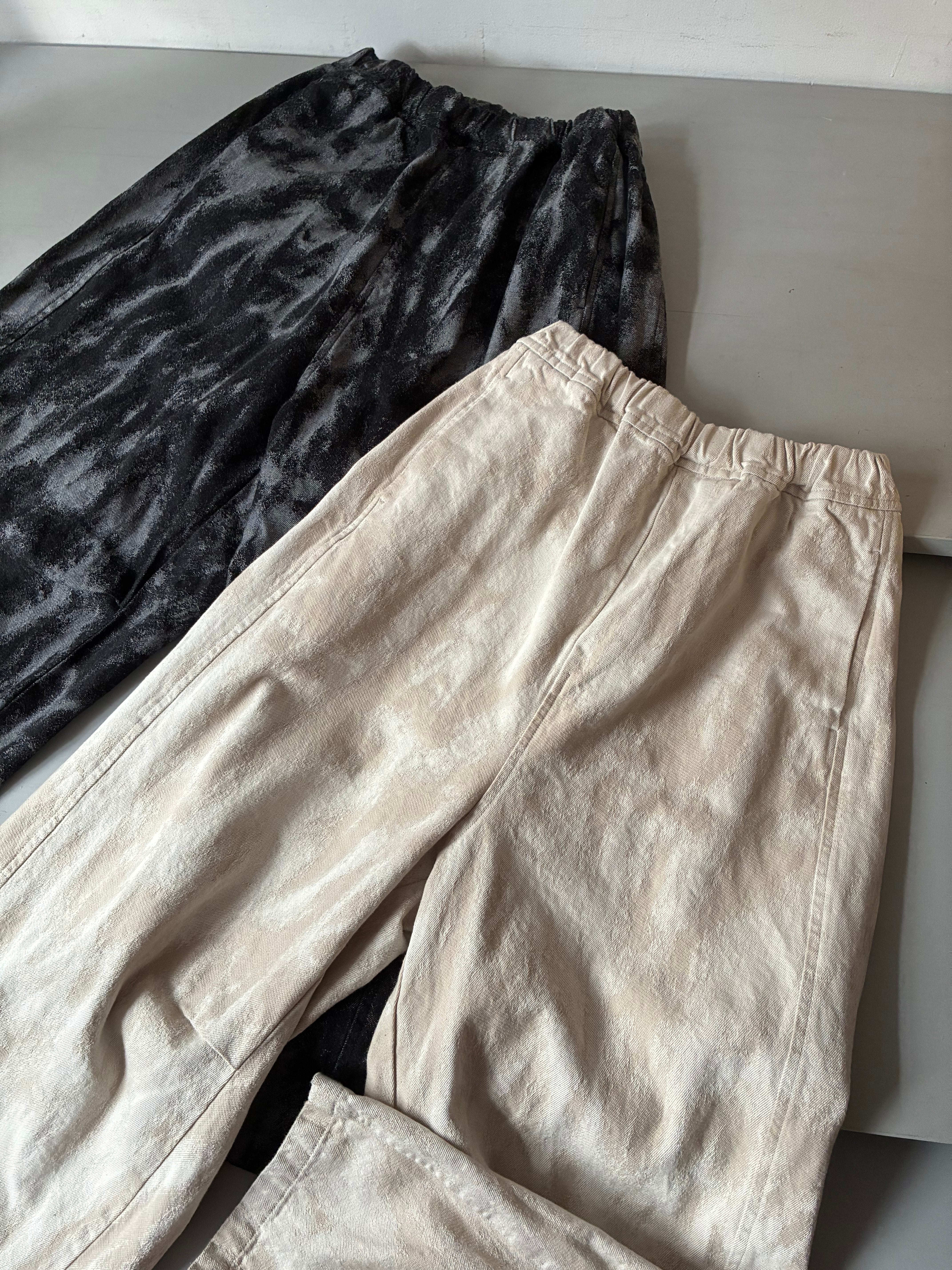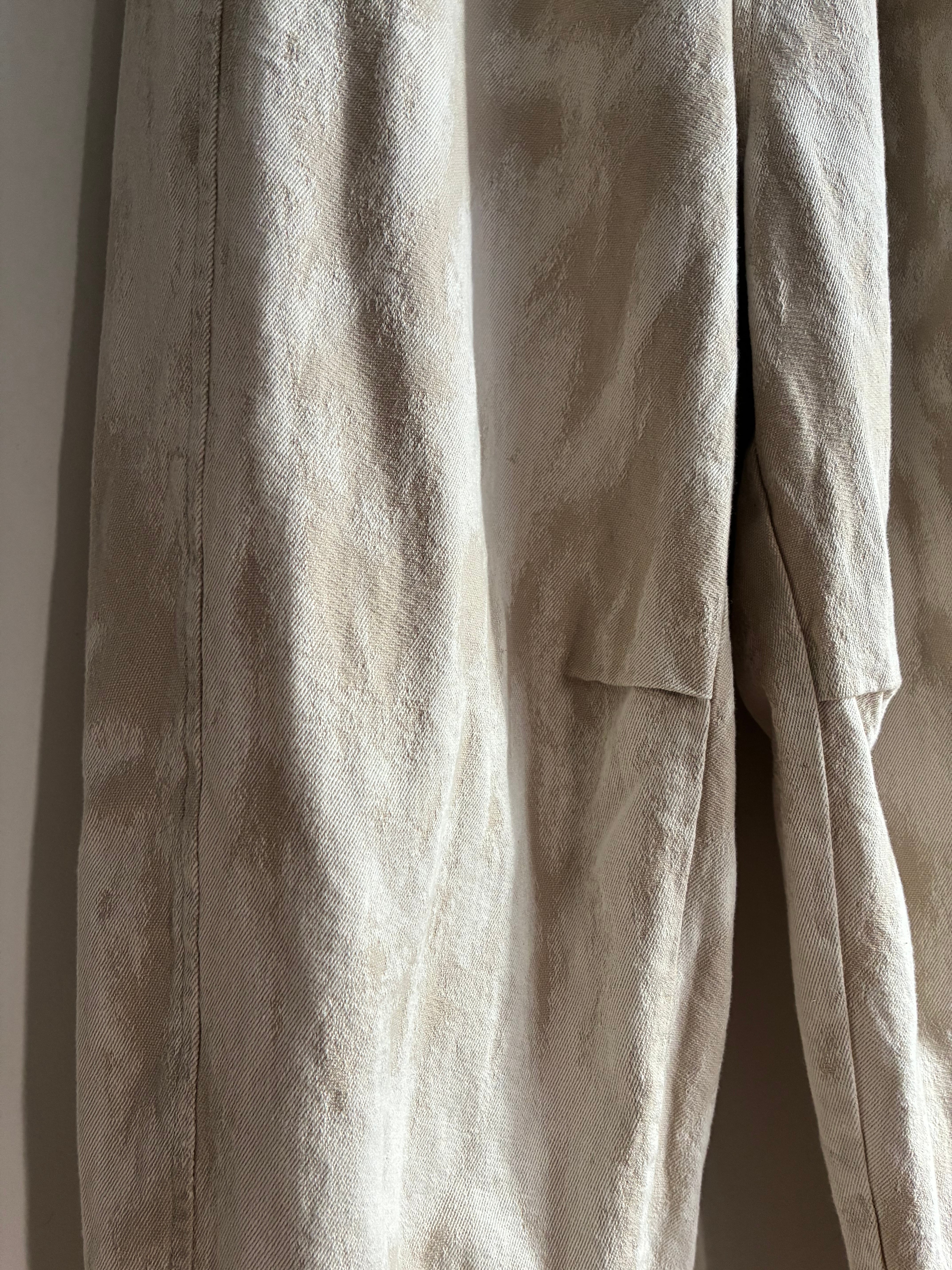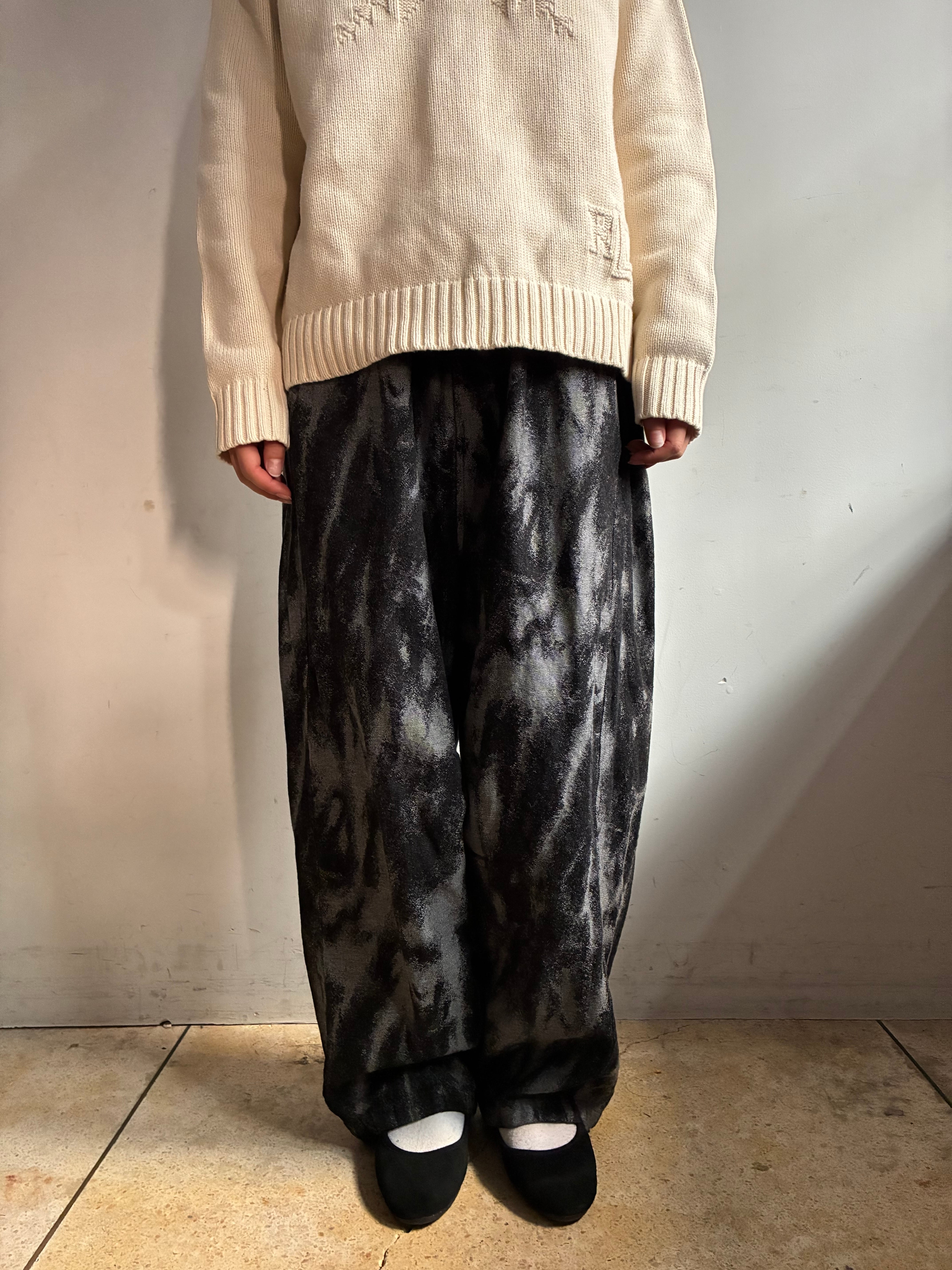 スプレーを吹きかけたような、一見ペイントに見える柄をジャガードで表現した生地のトロワパンツ。
