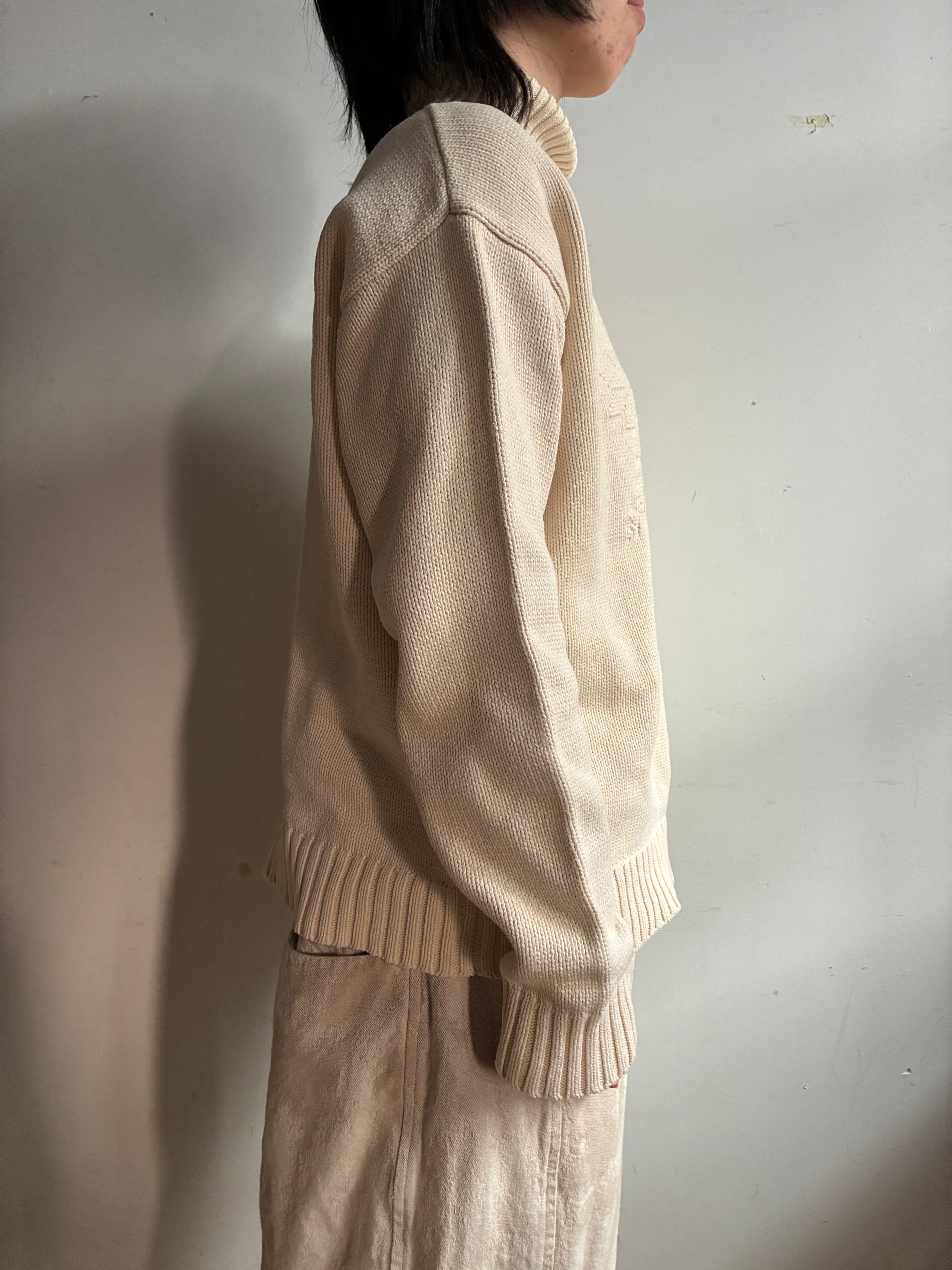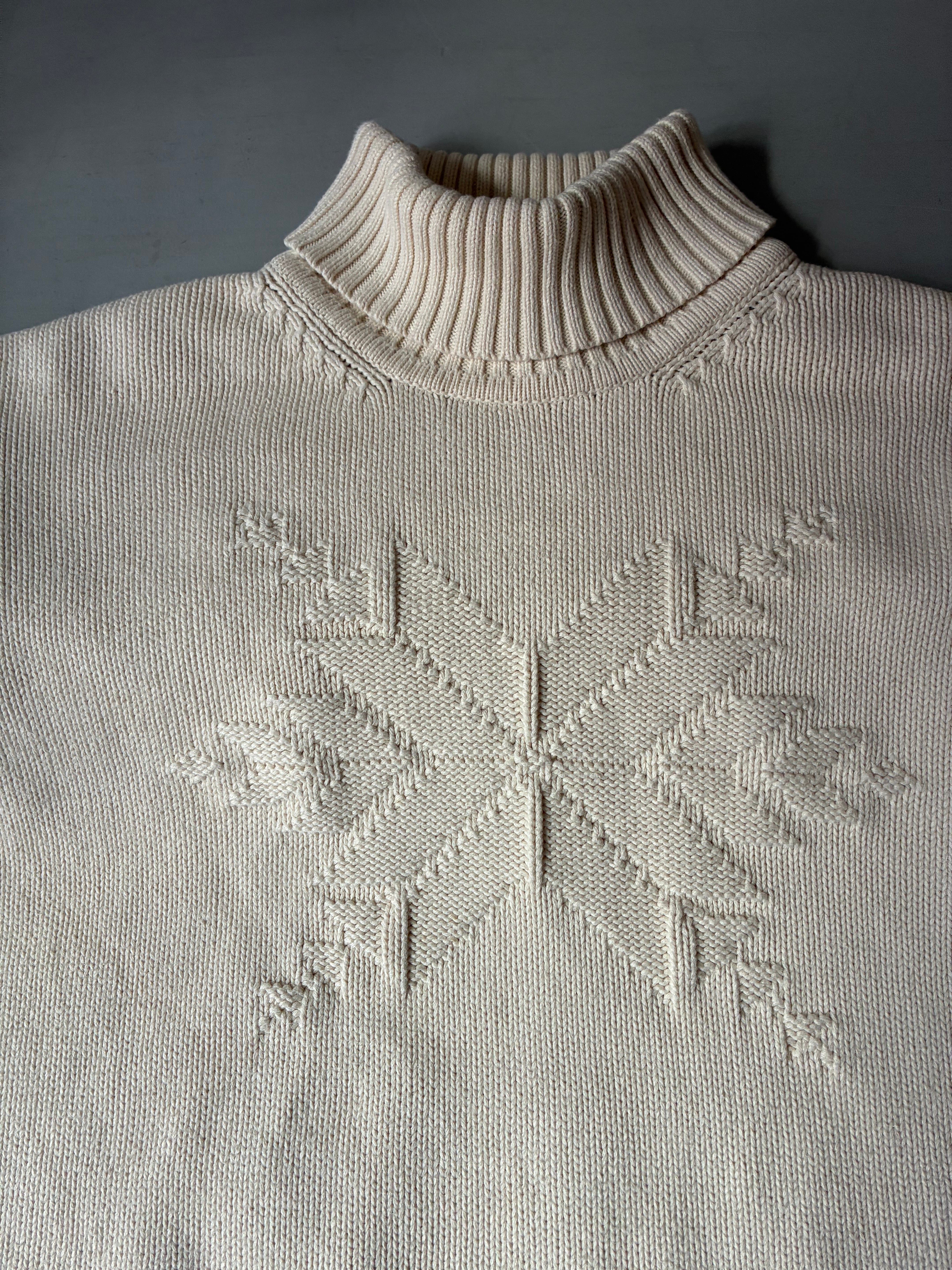 雪の結晶が編まれたタートルネックコットンニット。