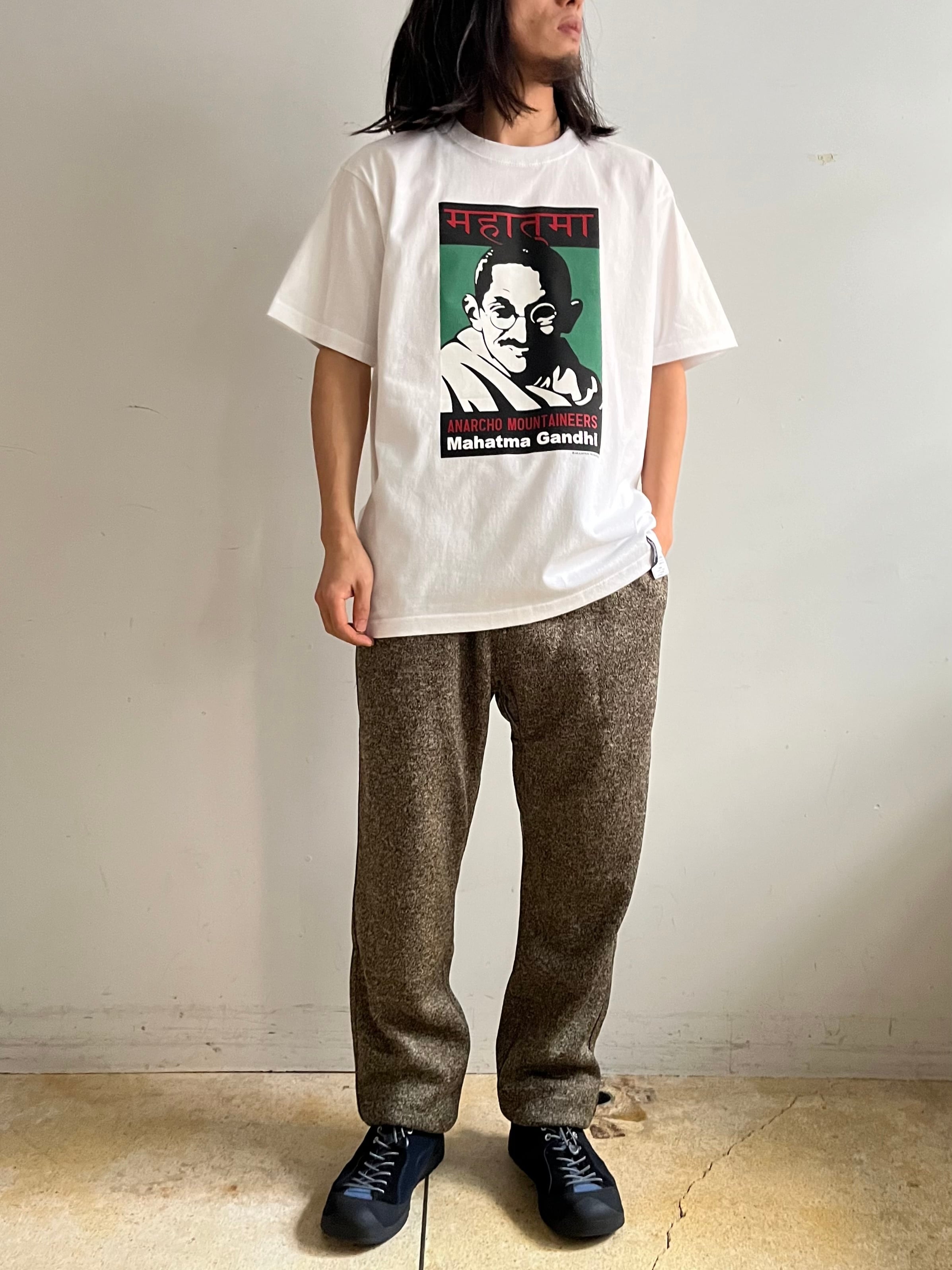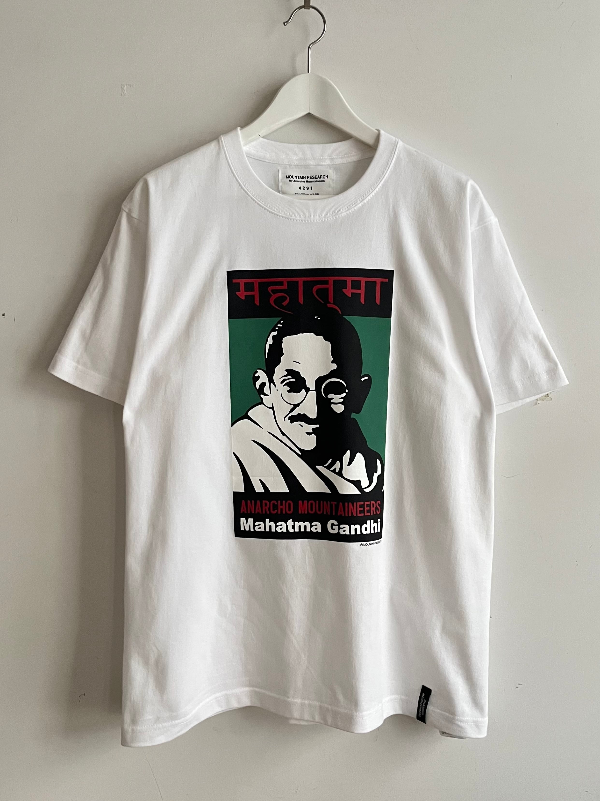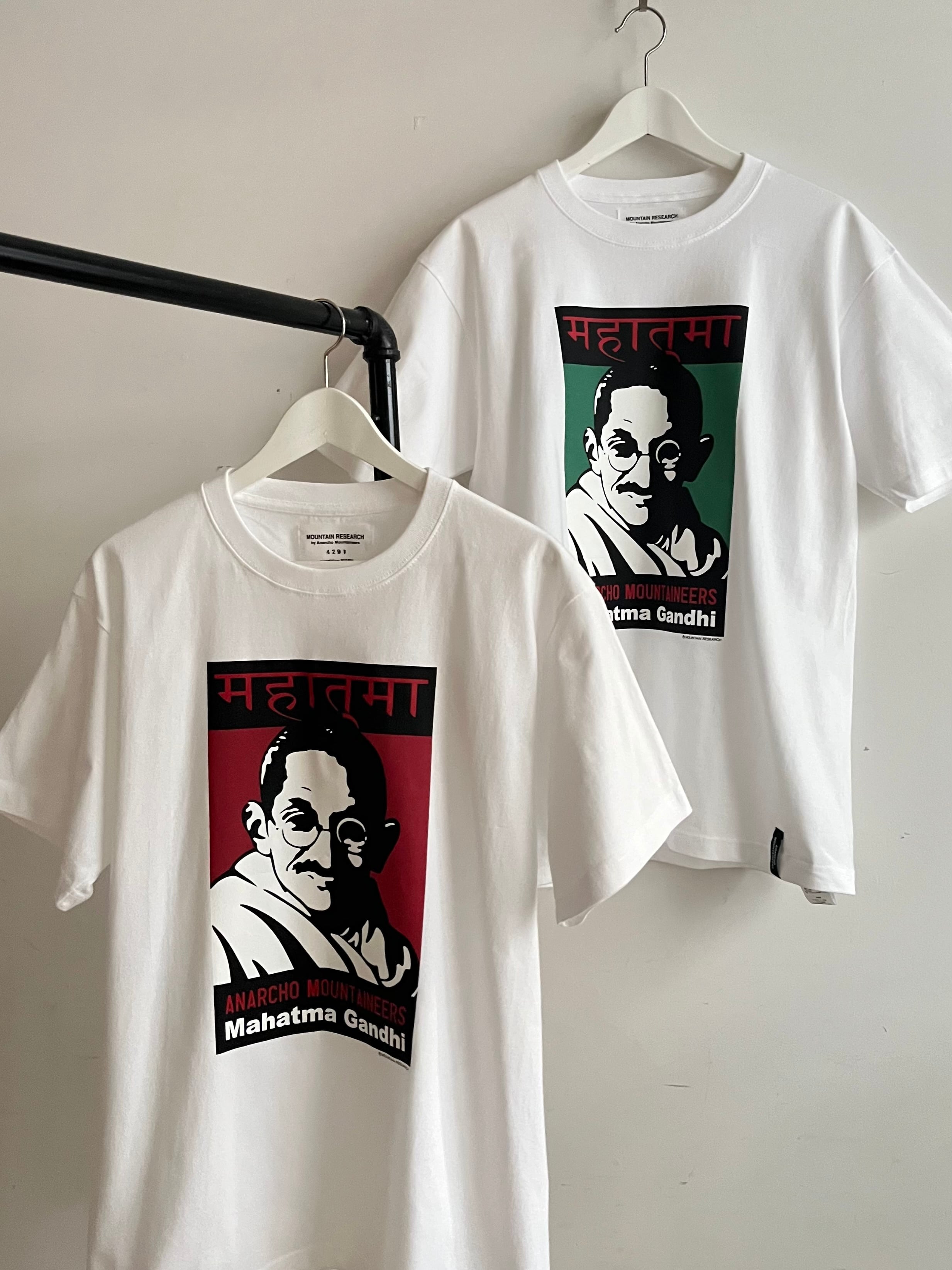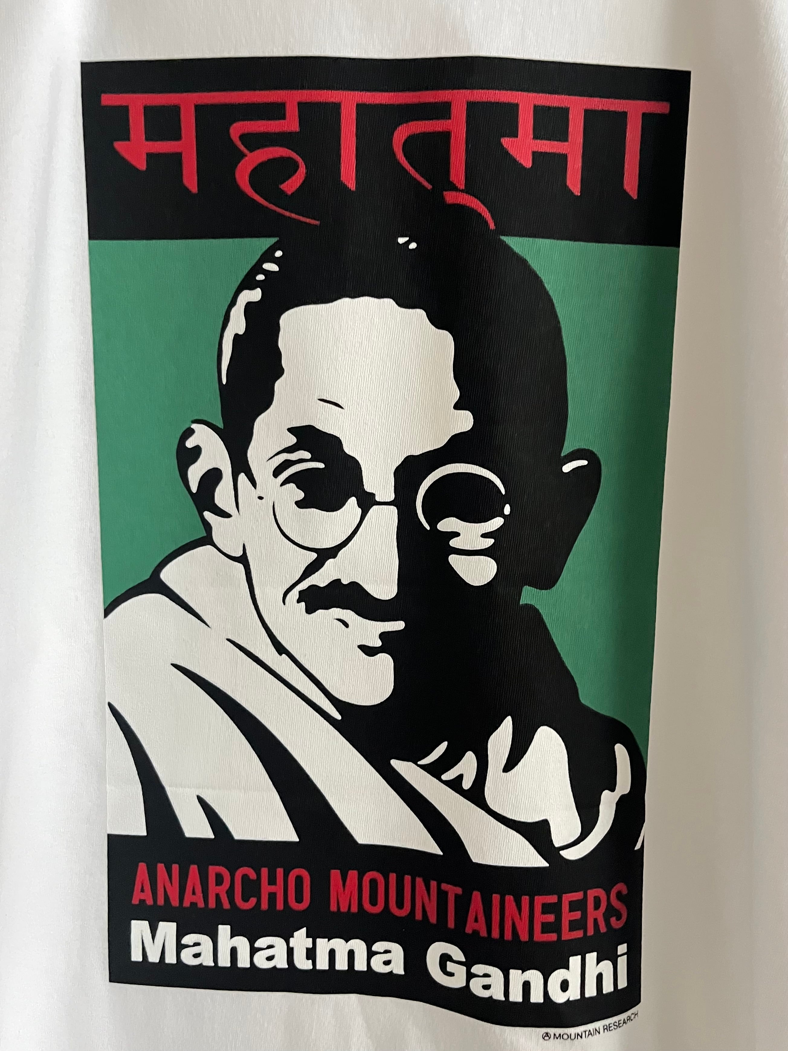 プリントに描かれている人物はインドの宗教家・政治指導者である「マハトマ・ガンディー」。プロパガンダポスターを思わせるデザイン、哲学・思想に重きを置くマウンテンリサーチらしい一着です。