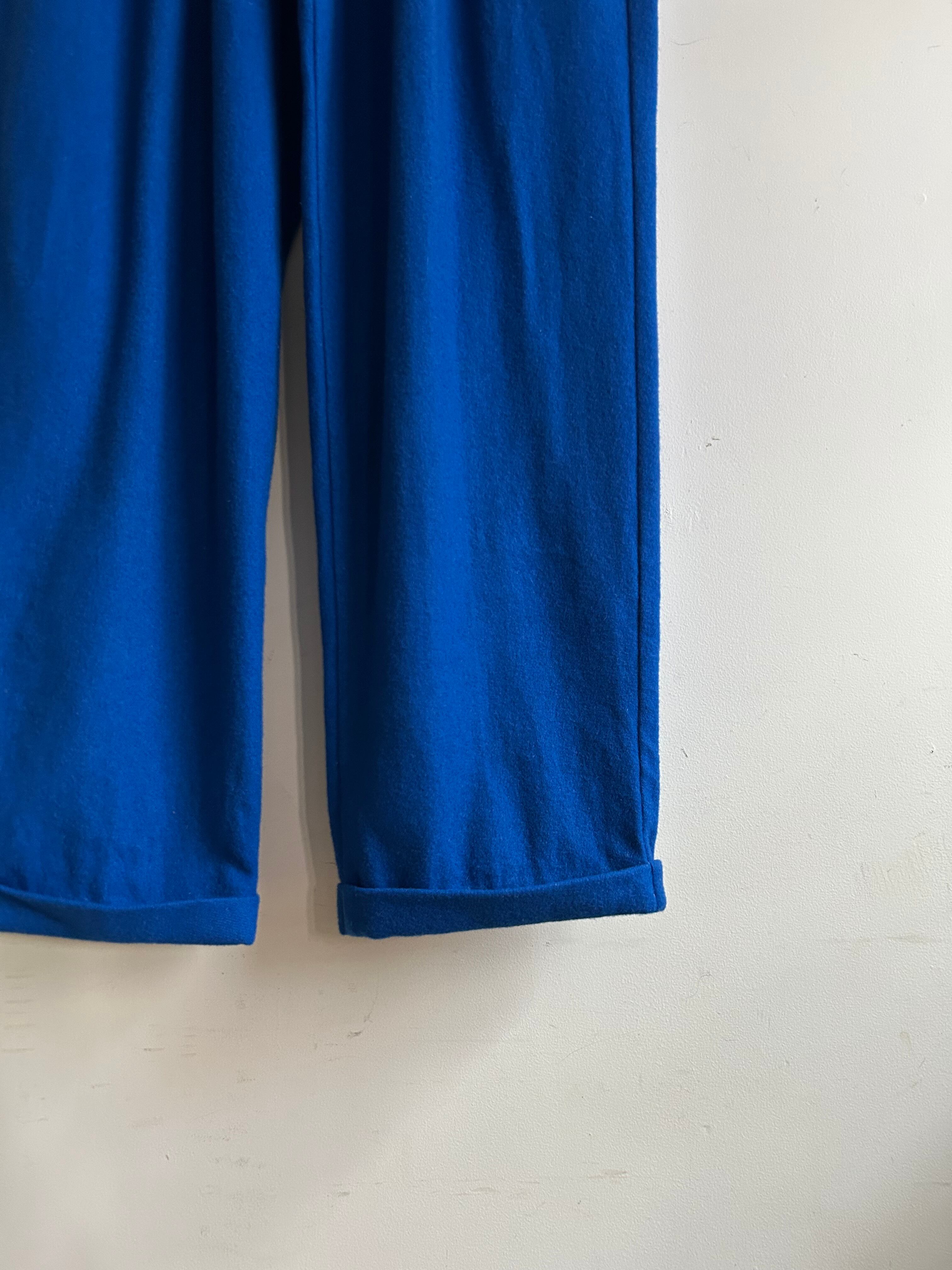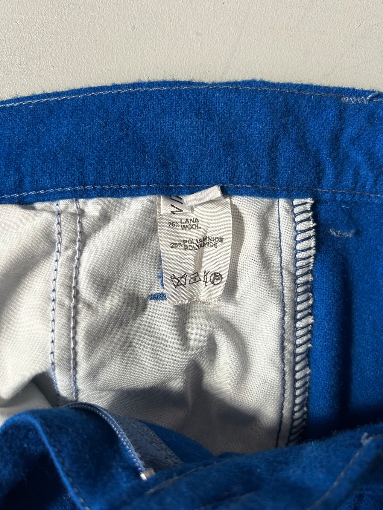 ウール75%、ポリエステル25%のふっくらとした生地。きれいなロイヤルブルーなので春先にぴったりです。