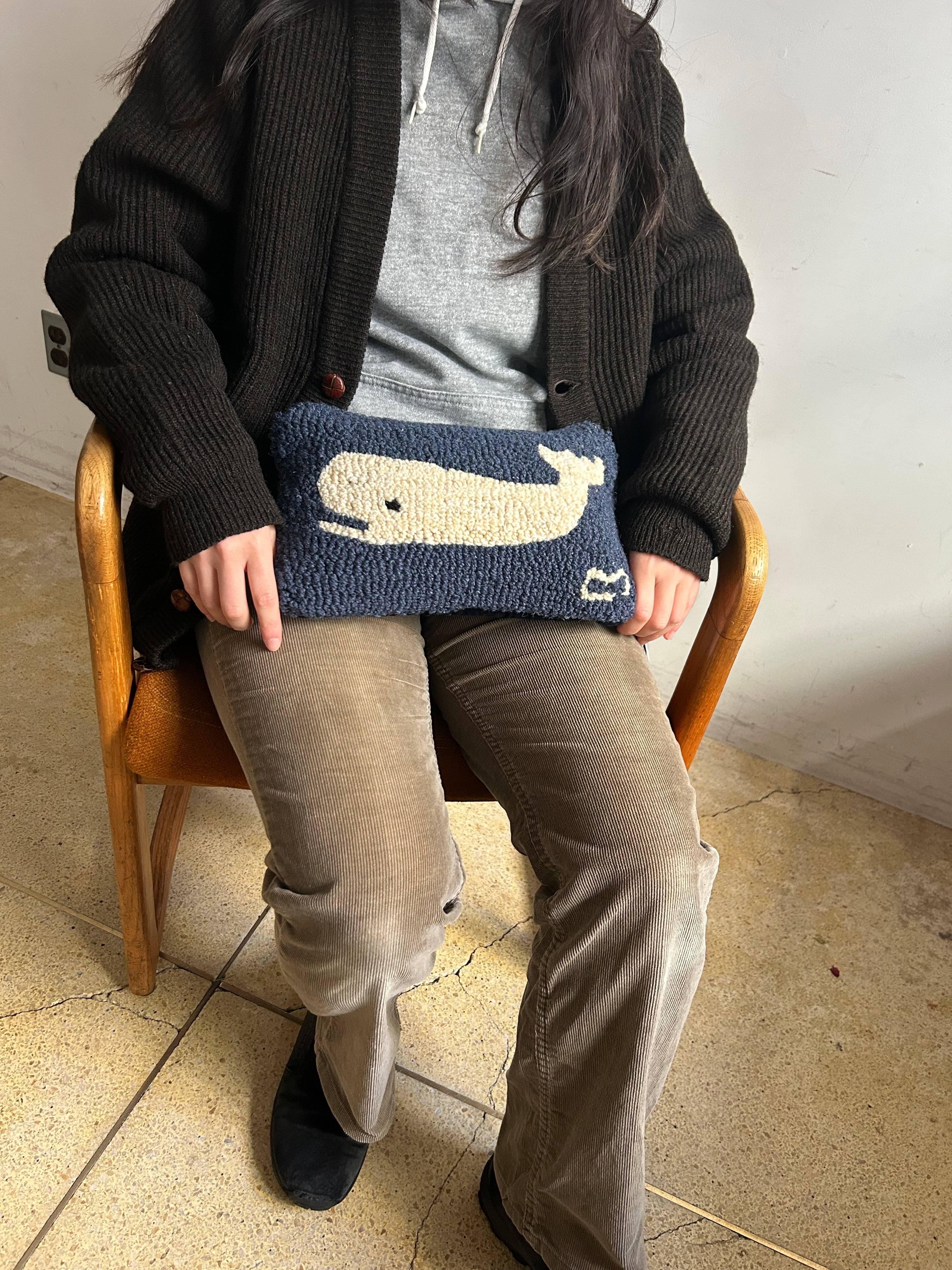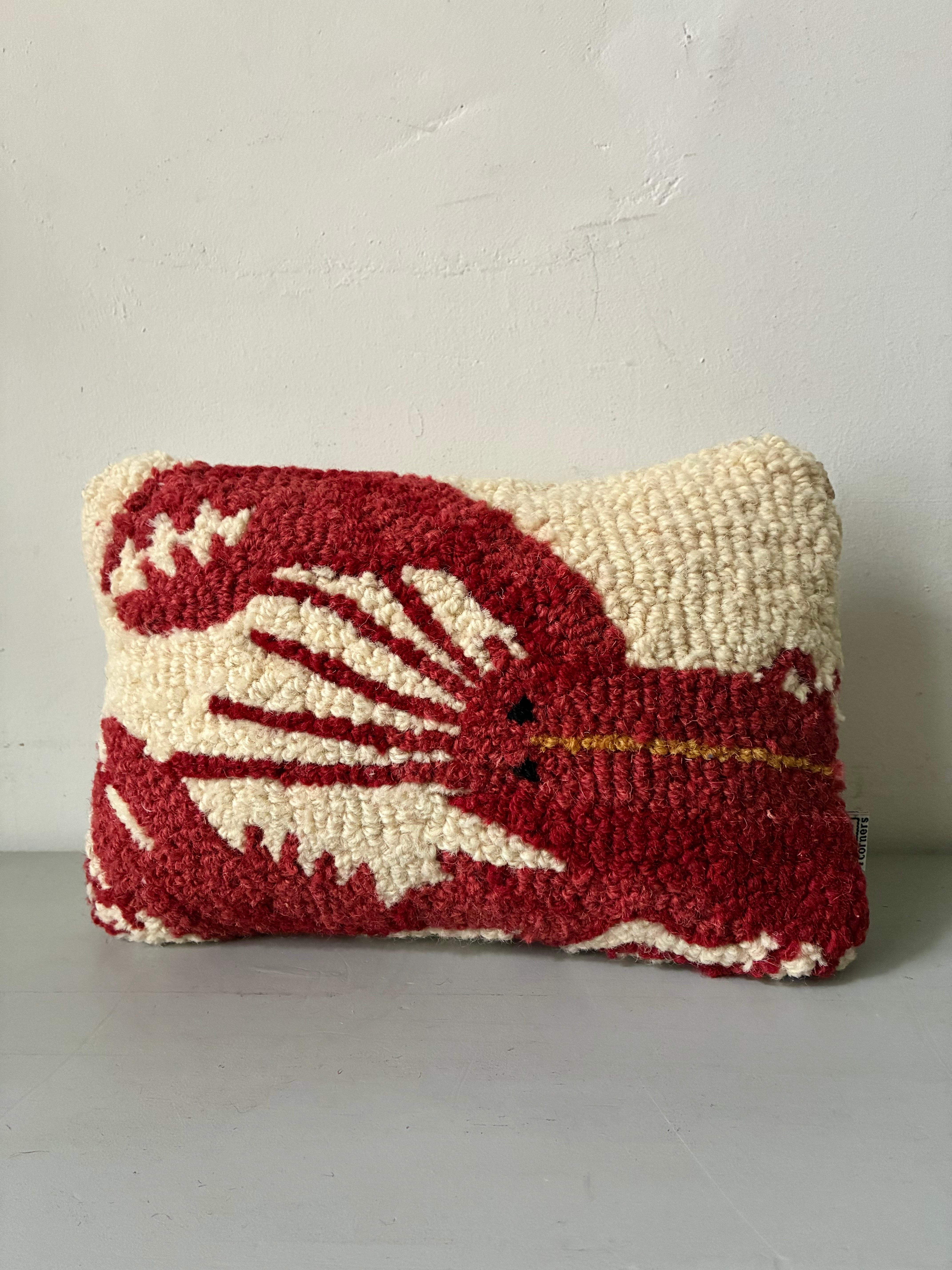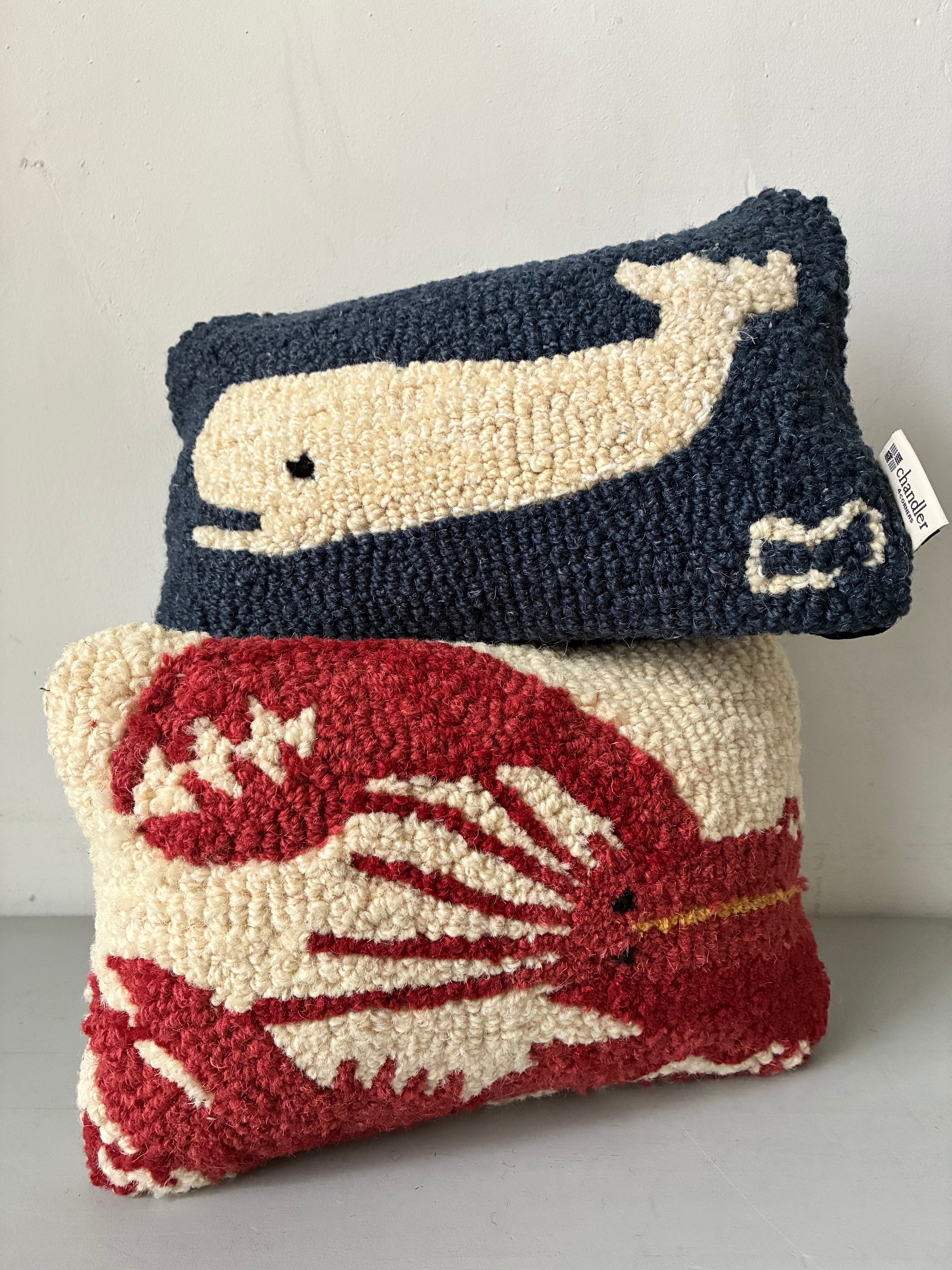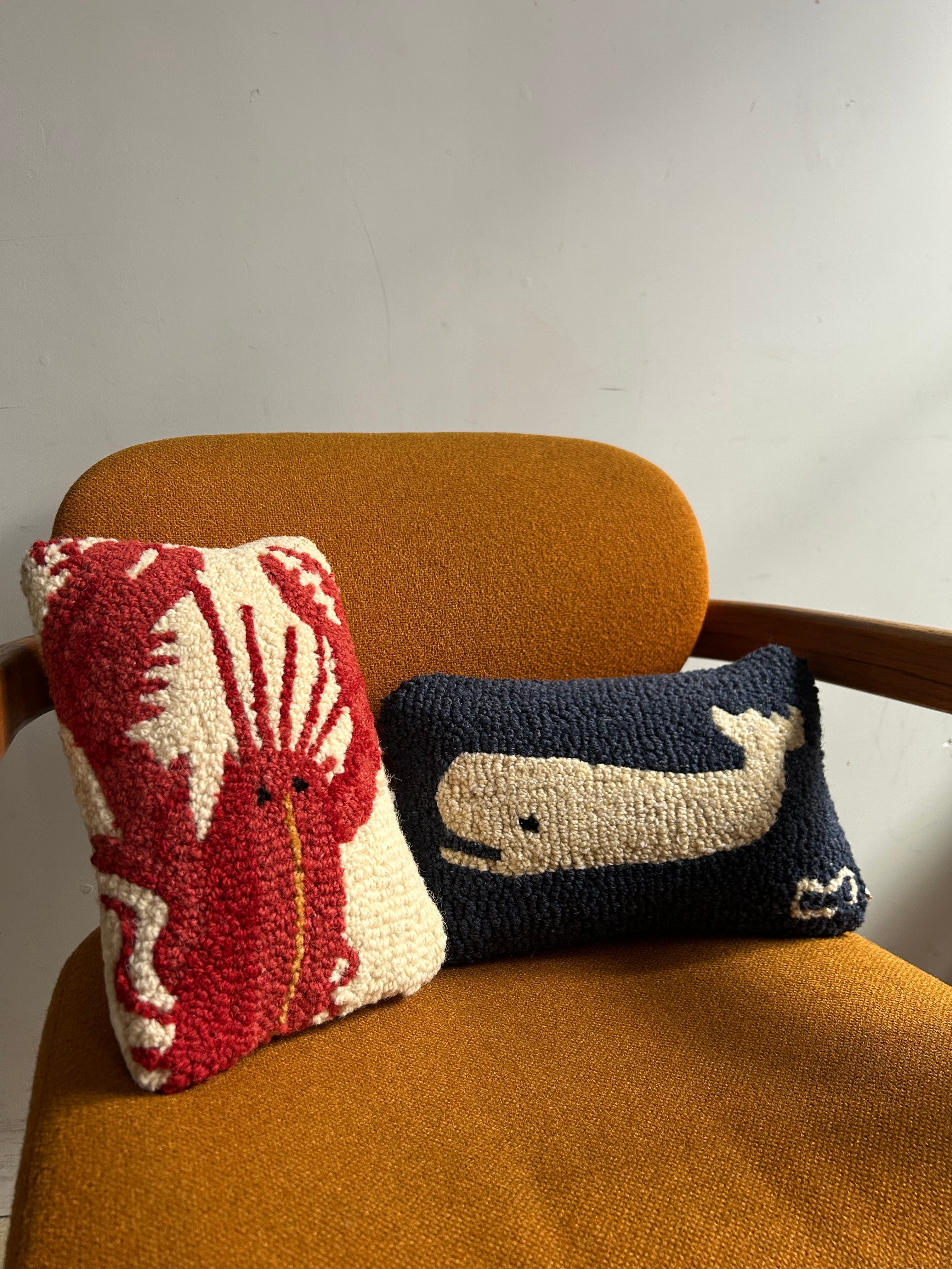 表面に、手作業で打ったパイルでユニークなロブスター柄とクジラ柄をデザインしたスロー・ピロー。
