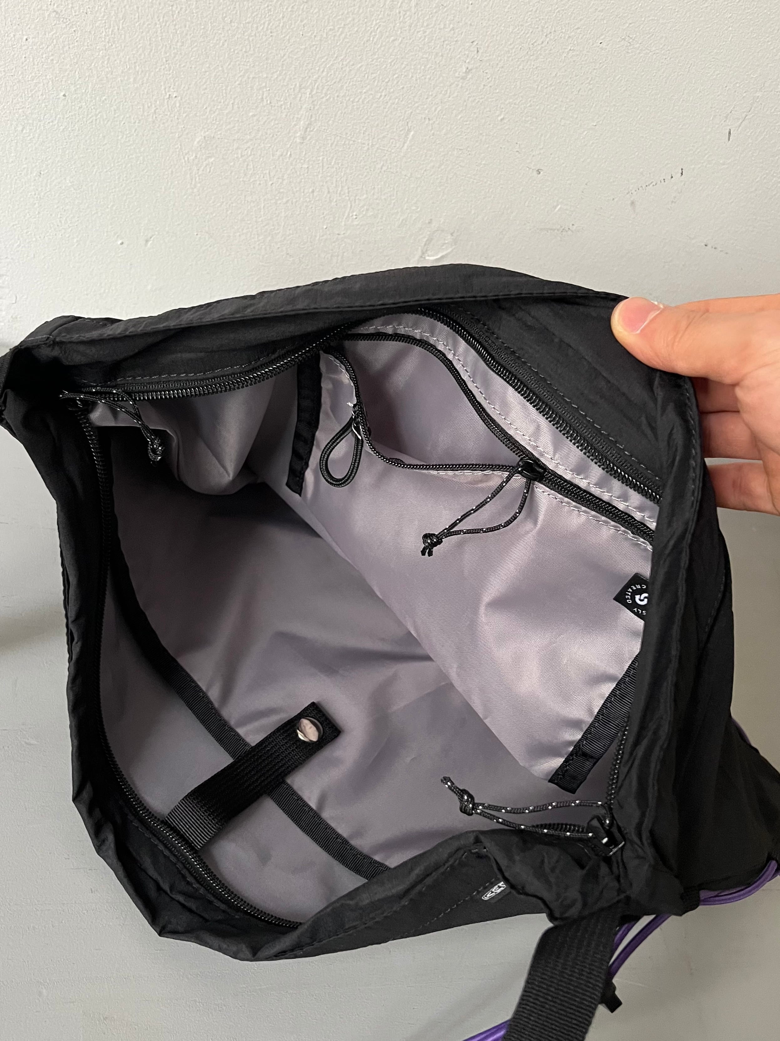 特徴的なマチ部分のバンジーコードは緩めることで最大10㎝の厚みまで調節可能。A4サイズがすっぽり収まるサイズ感で内装には2つの収納ポケット付きます。使いやすい大きさに軽やかな装着感が魅力の一品です。