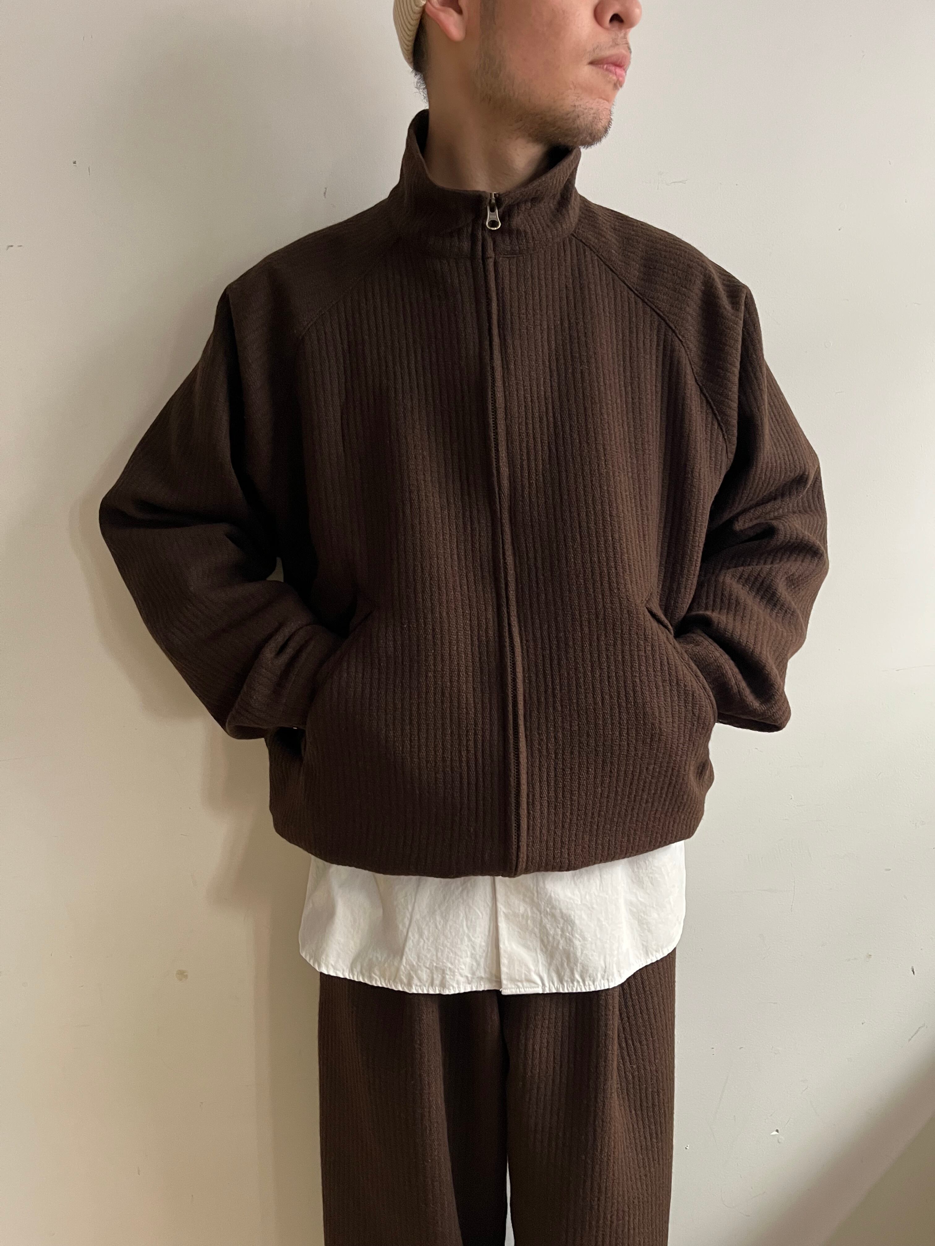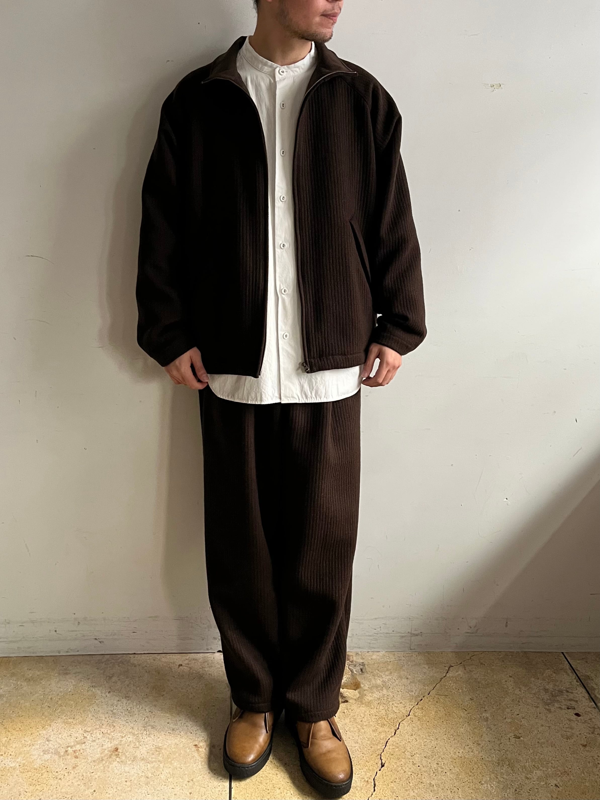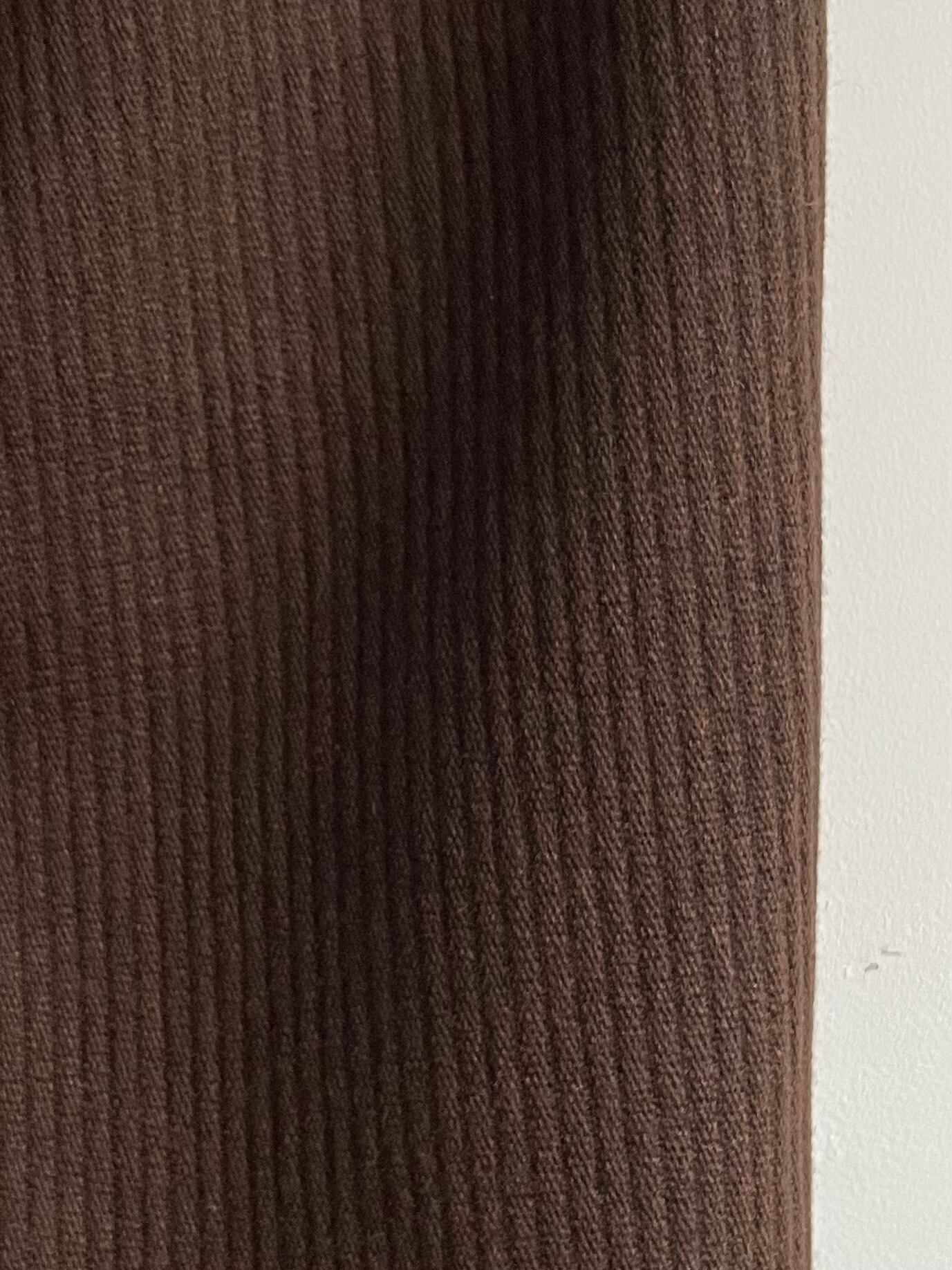 ふんわりとした触感、中肉程度の厚みの生地は暗めのブラウンカラーに太めの縦畝が珍しく、高級感を感じさせる一着。