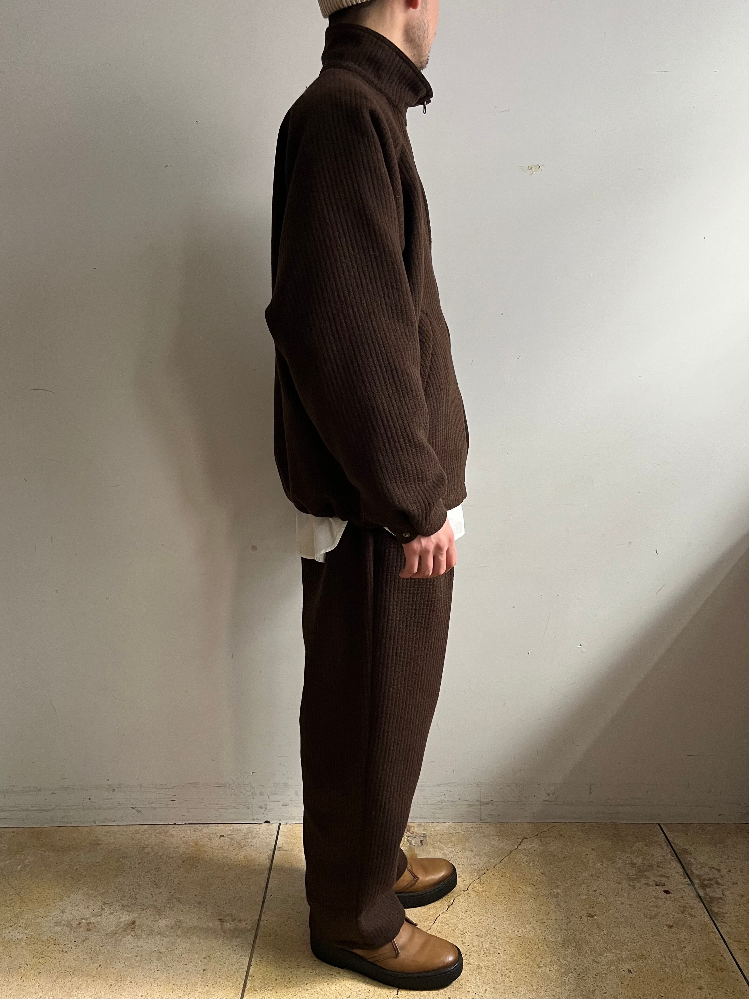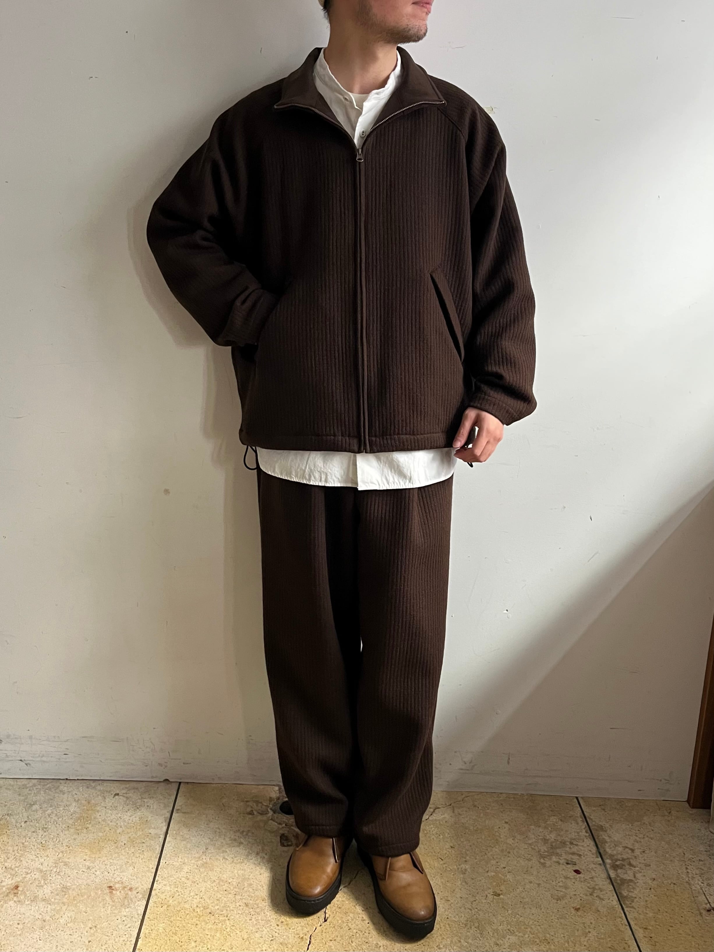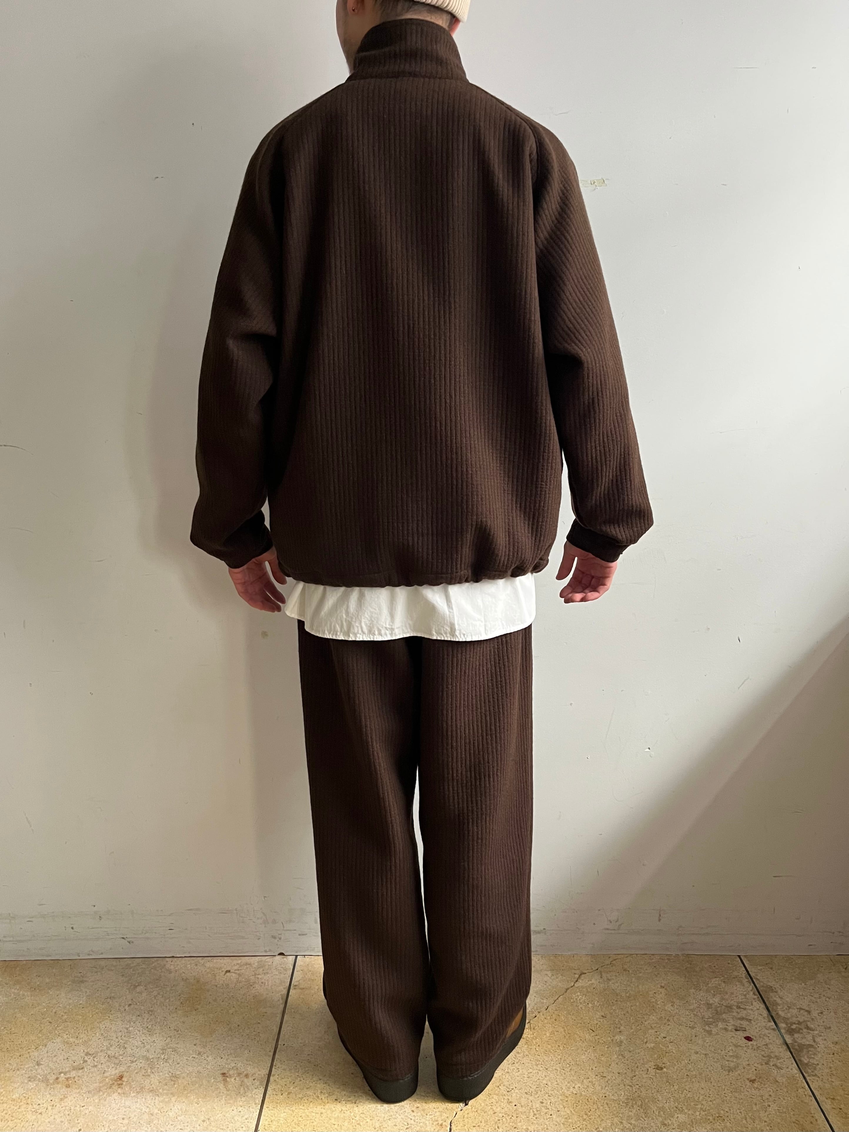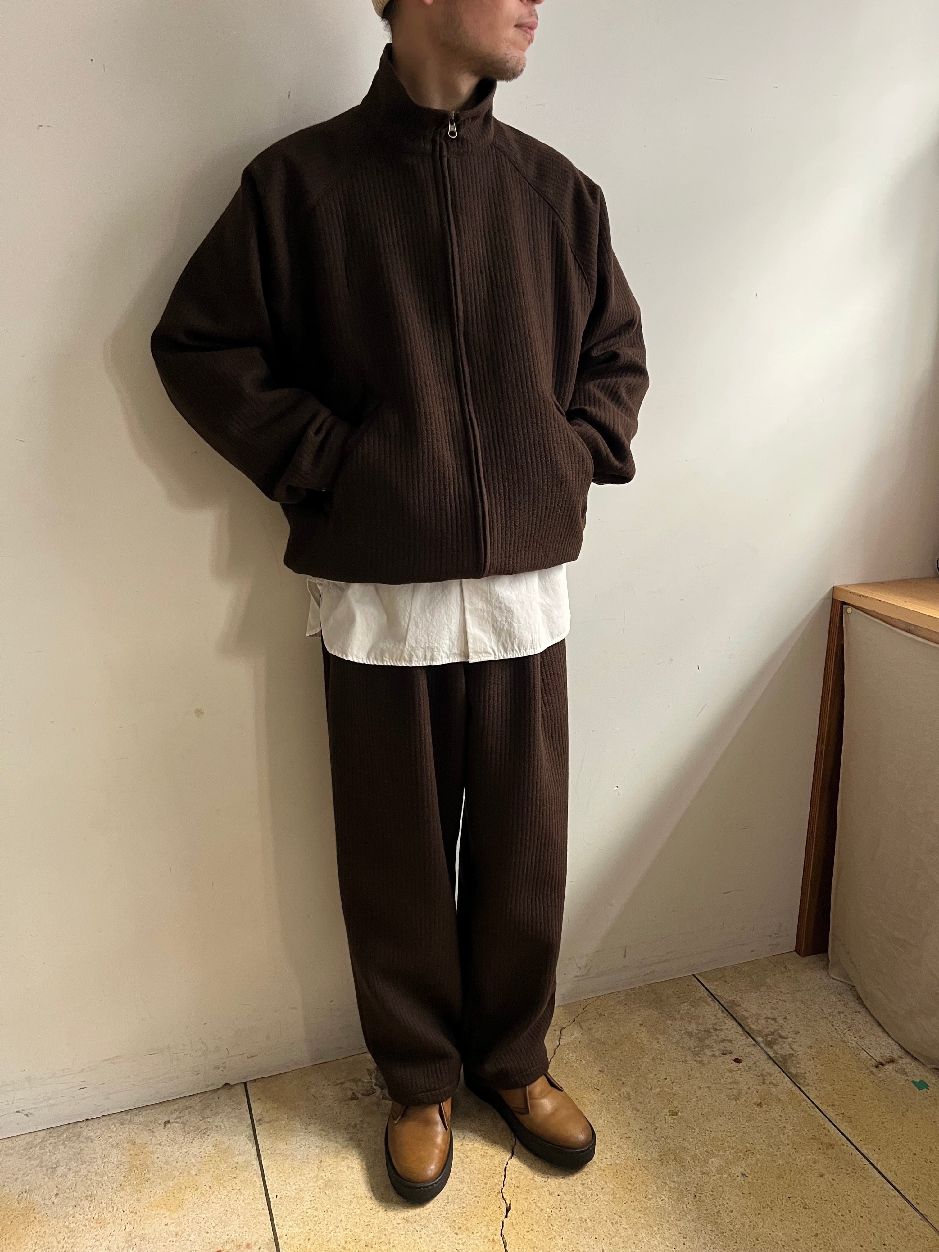 ふんわりとした触感、中肉程度の厚みの生地は暗めのブラウンカラーに太めの縦畝が珍しく、高級感を感じさせる一着。