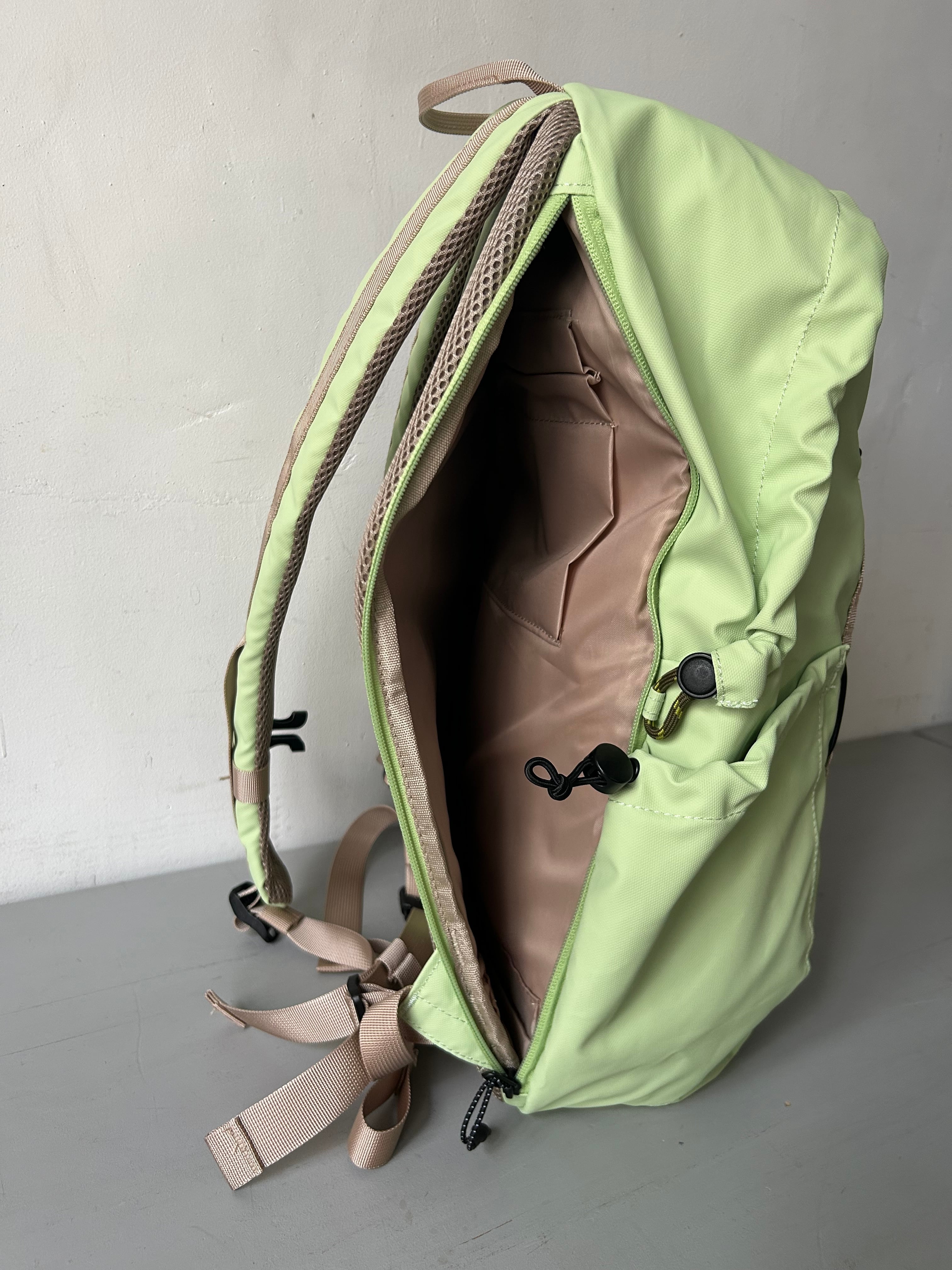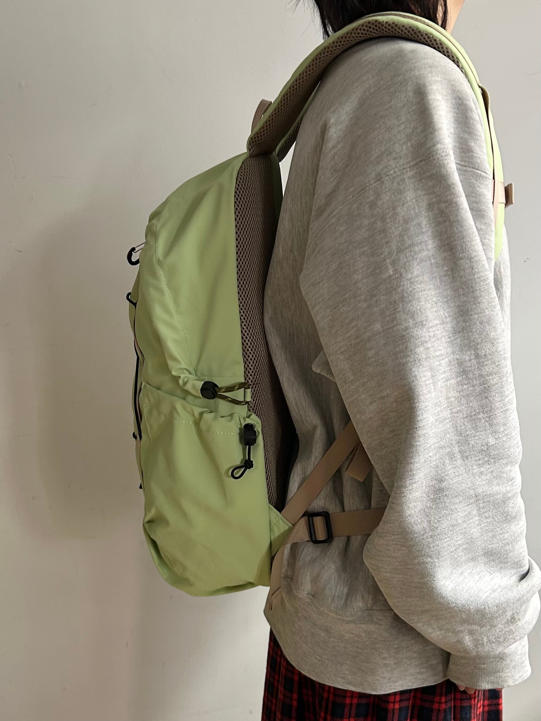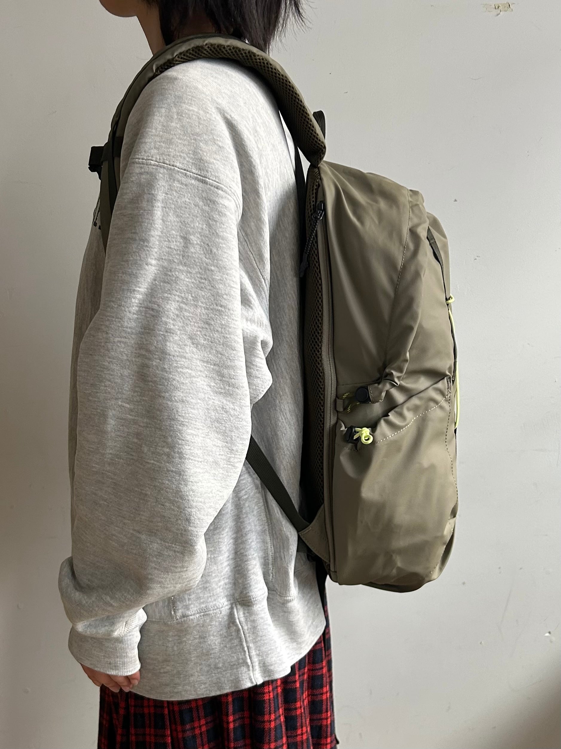 容量は22L。開口部が大きく開くダブルファスナー仕様で荷物の出し入れがしやすく、内側にはペンポケットやジッパーポケット付きで小物の整理に便利。