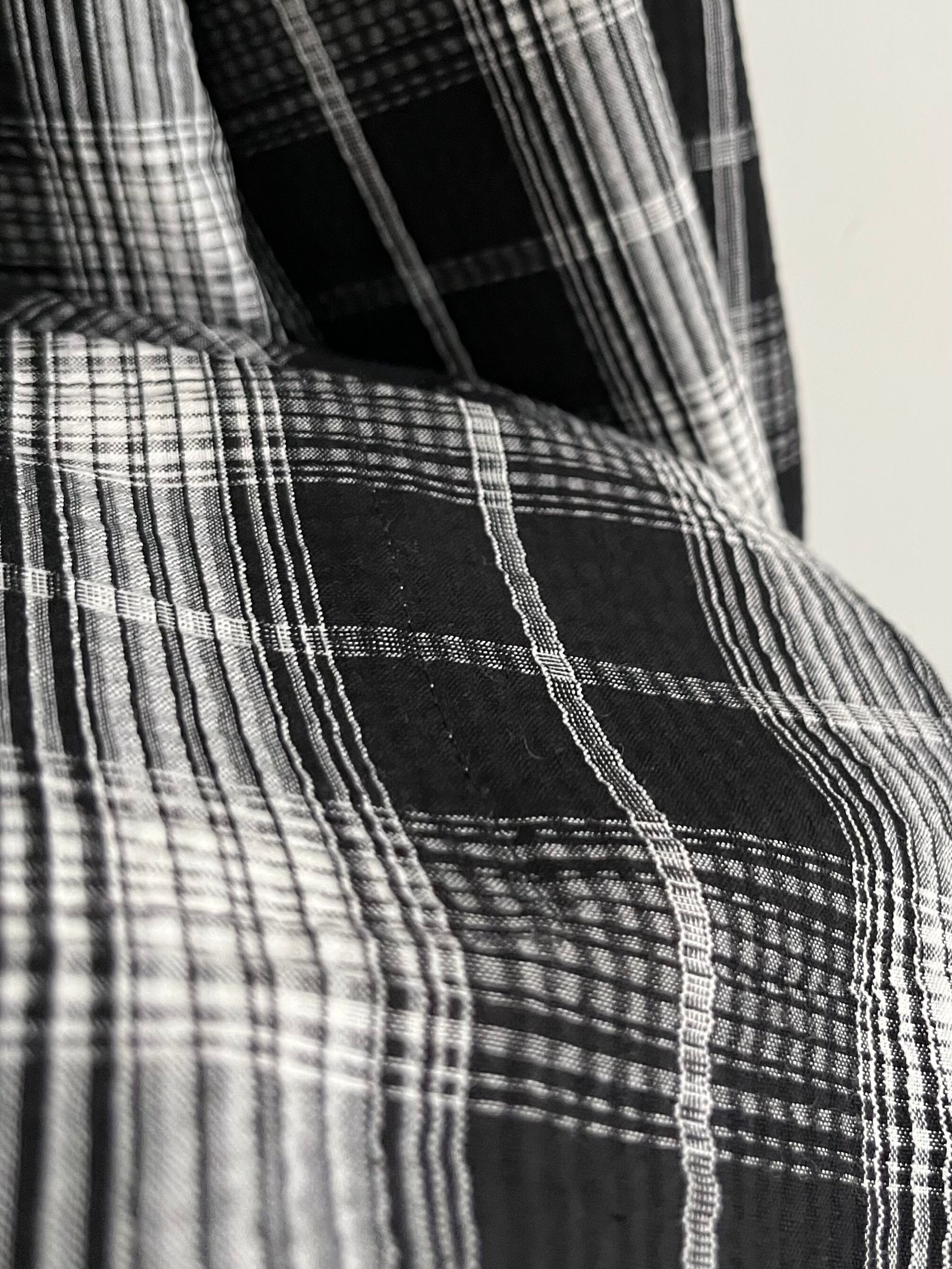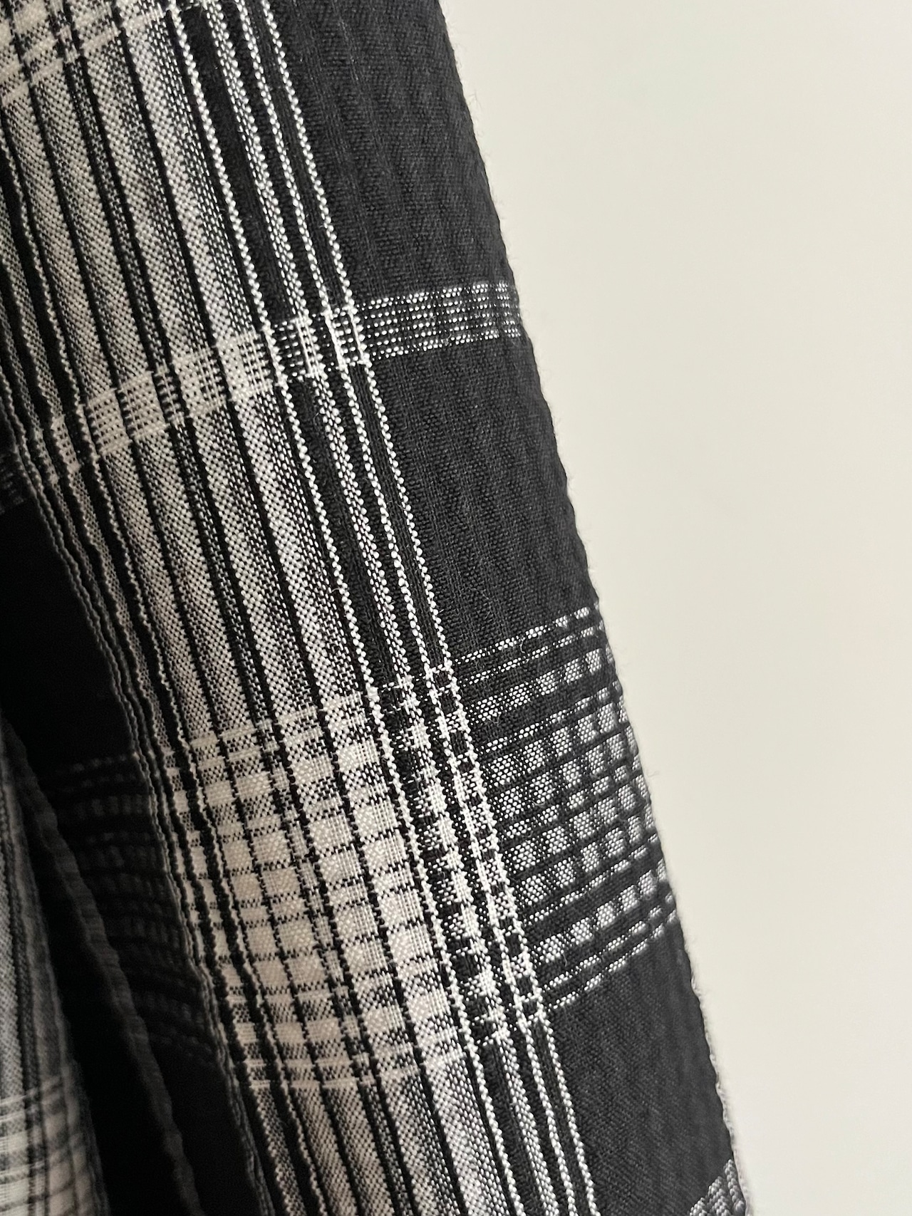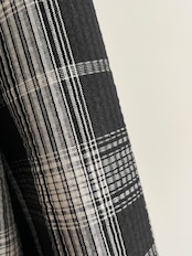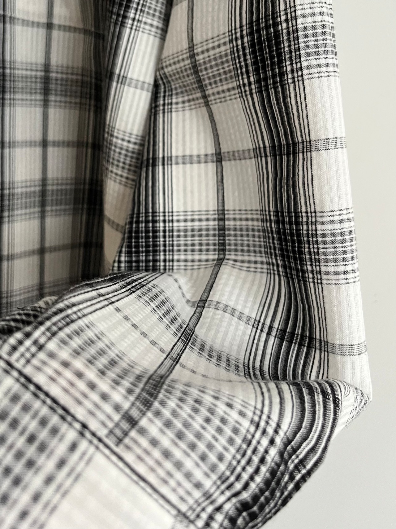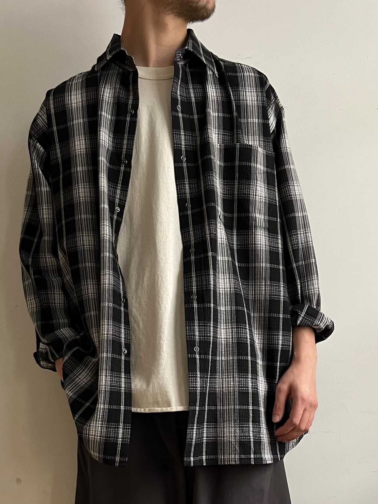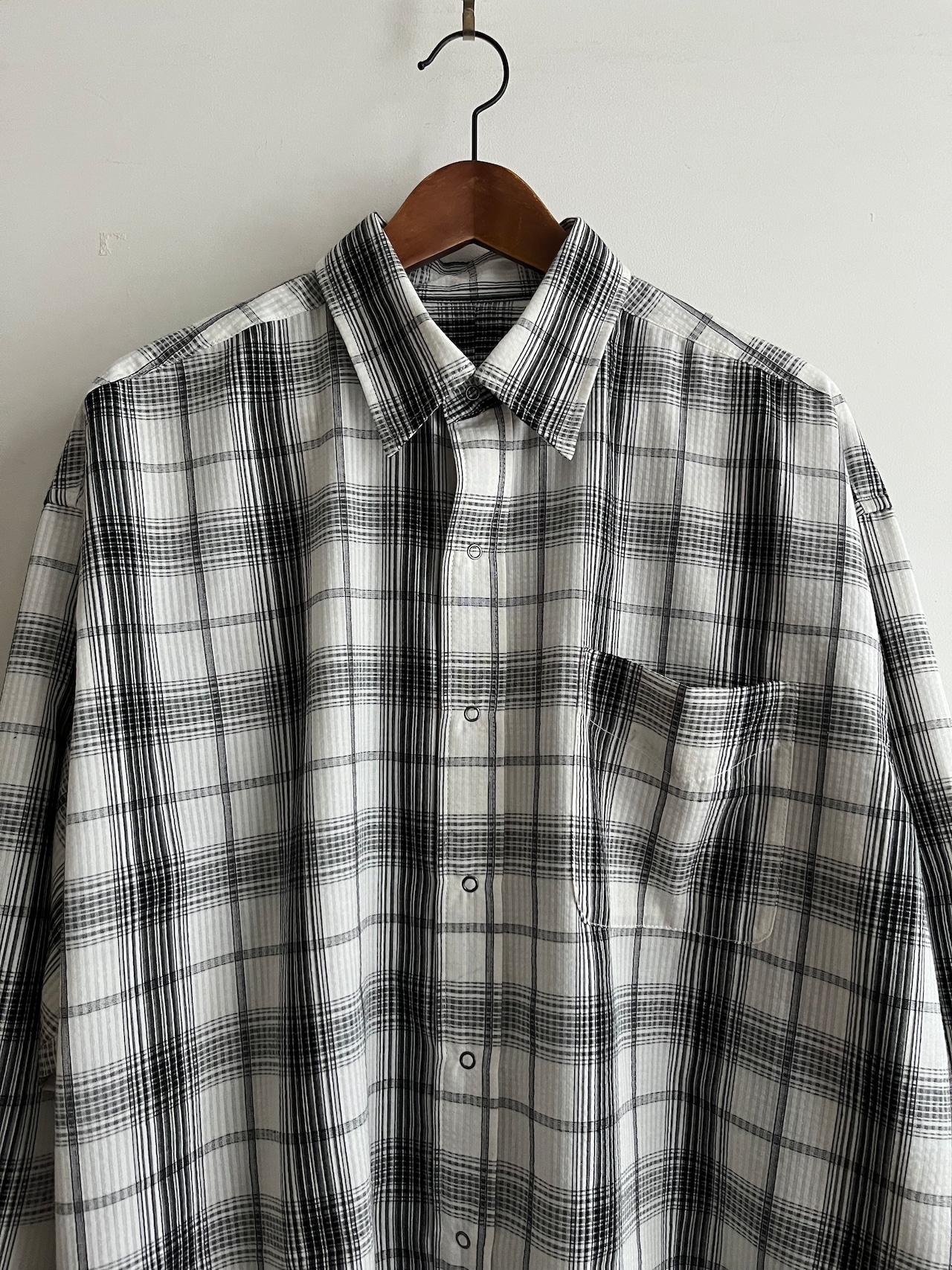 シアサッカーと呼ばれる表面の凹凸が特徴の生地を使用したチェック柄ビッグシャツ。コットン/ポリエステル混紡生地を加工することで出来るポコポコとした凹凸は肌離れが良く涼し気、暑い時期もおすすめの一着。チェック柄と凹凸が合わさることで表情のある生地感。ゆとり多めのオーバーサイズシルエットで袖をまくってのご着用、真夏の羽織りにもお勧めです。