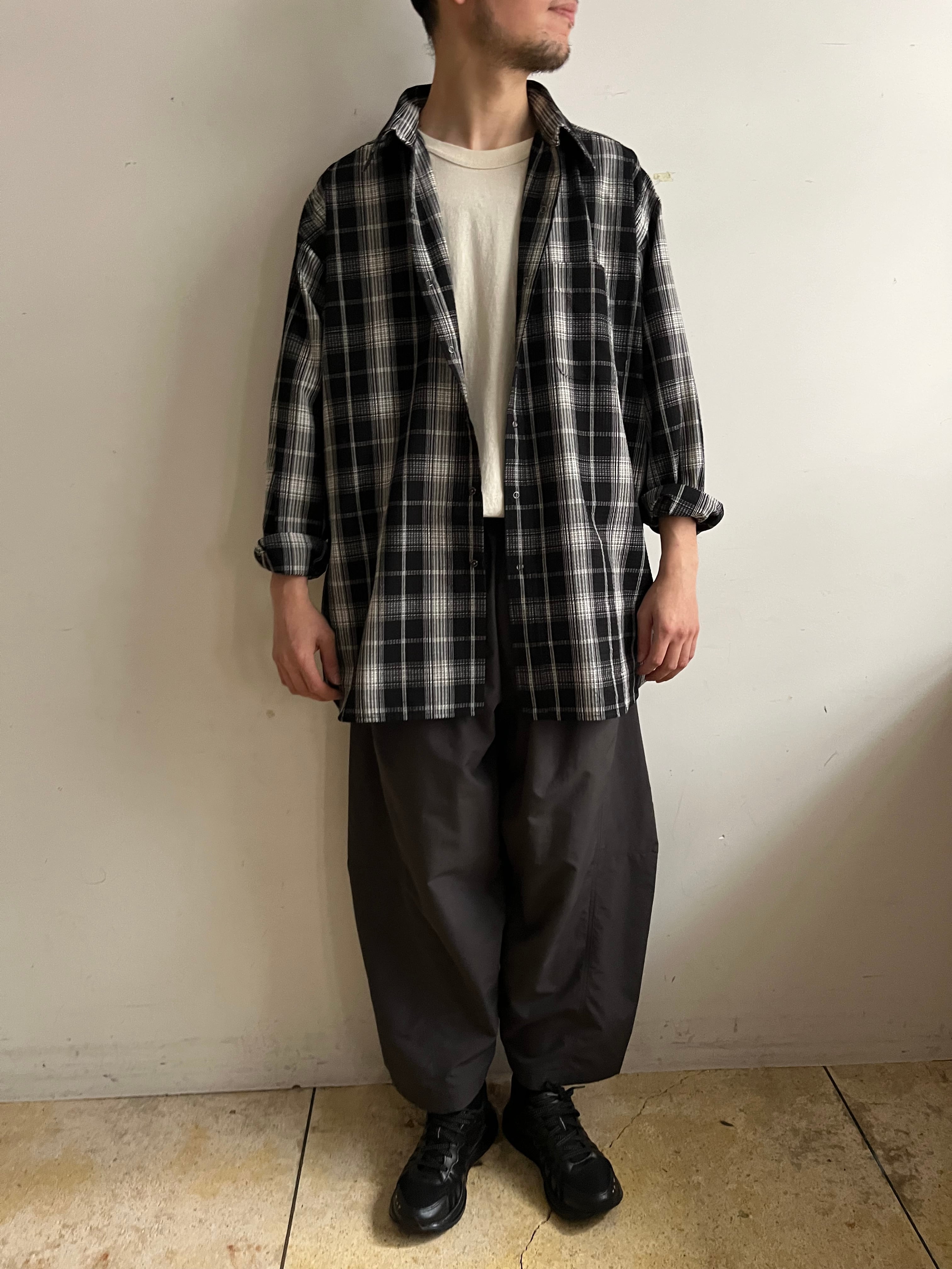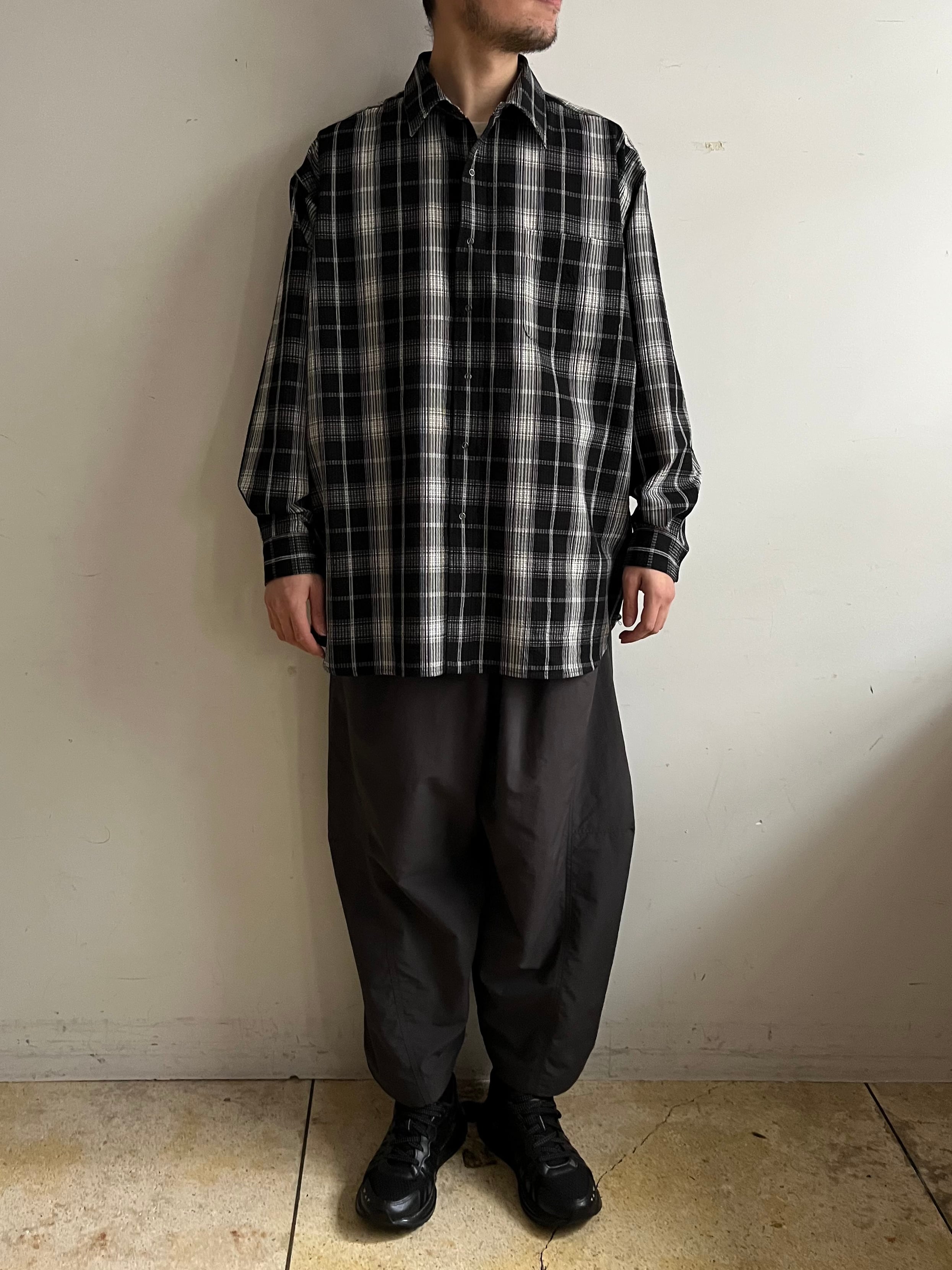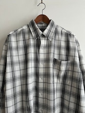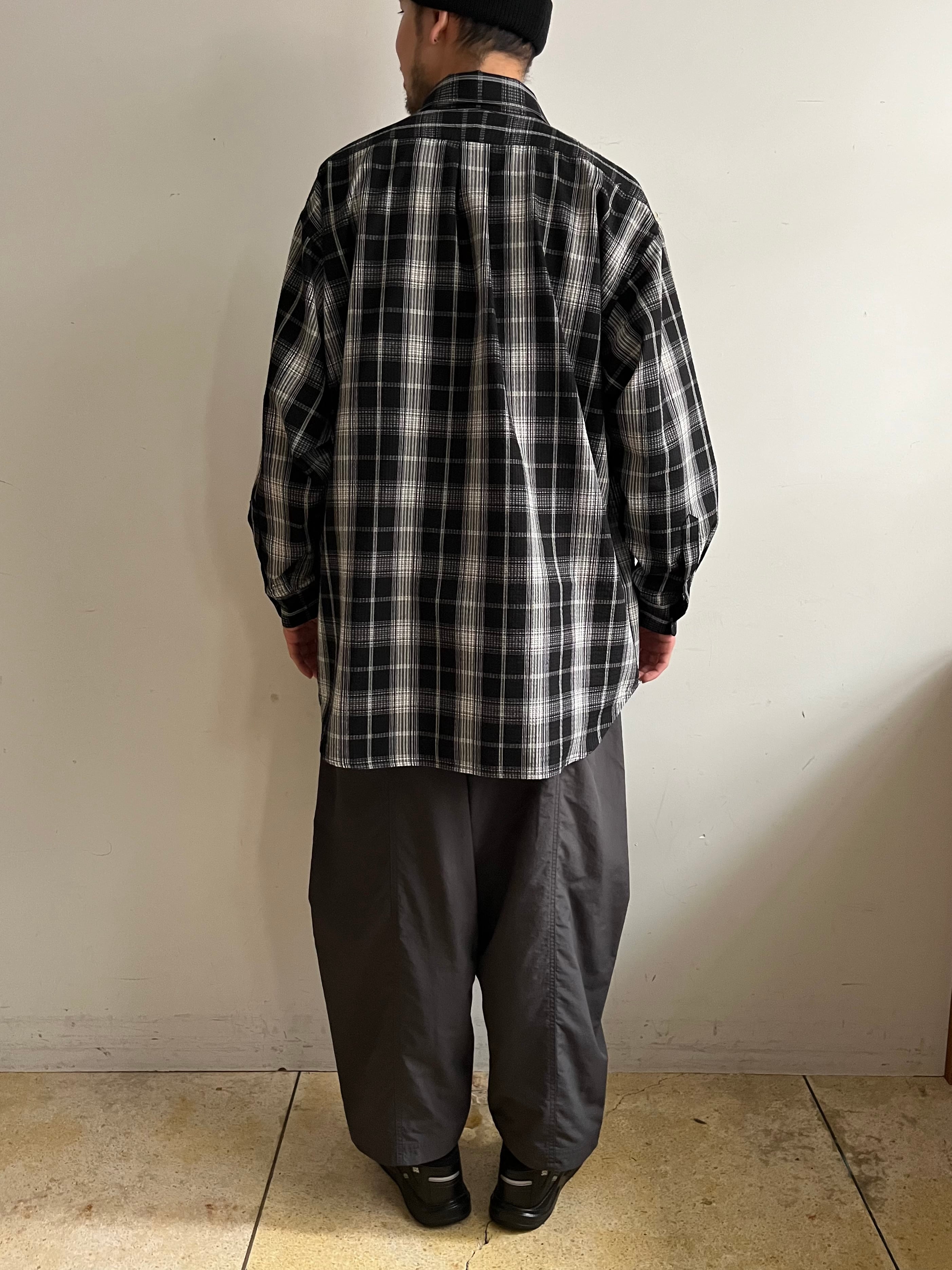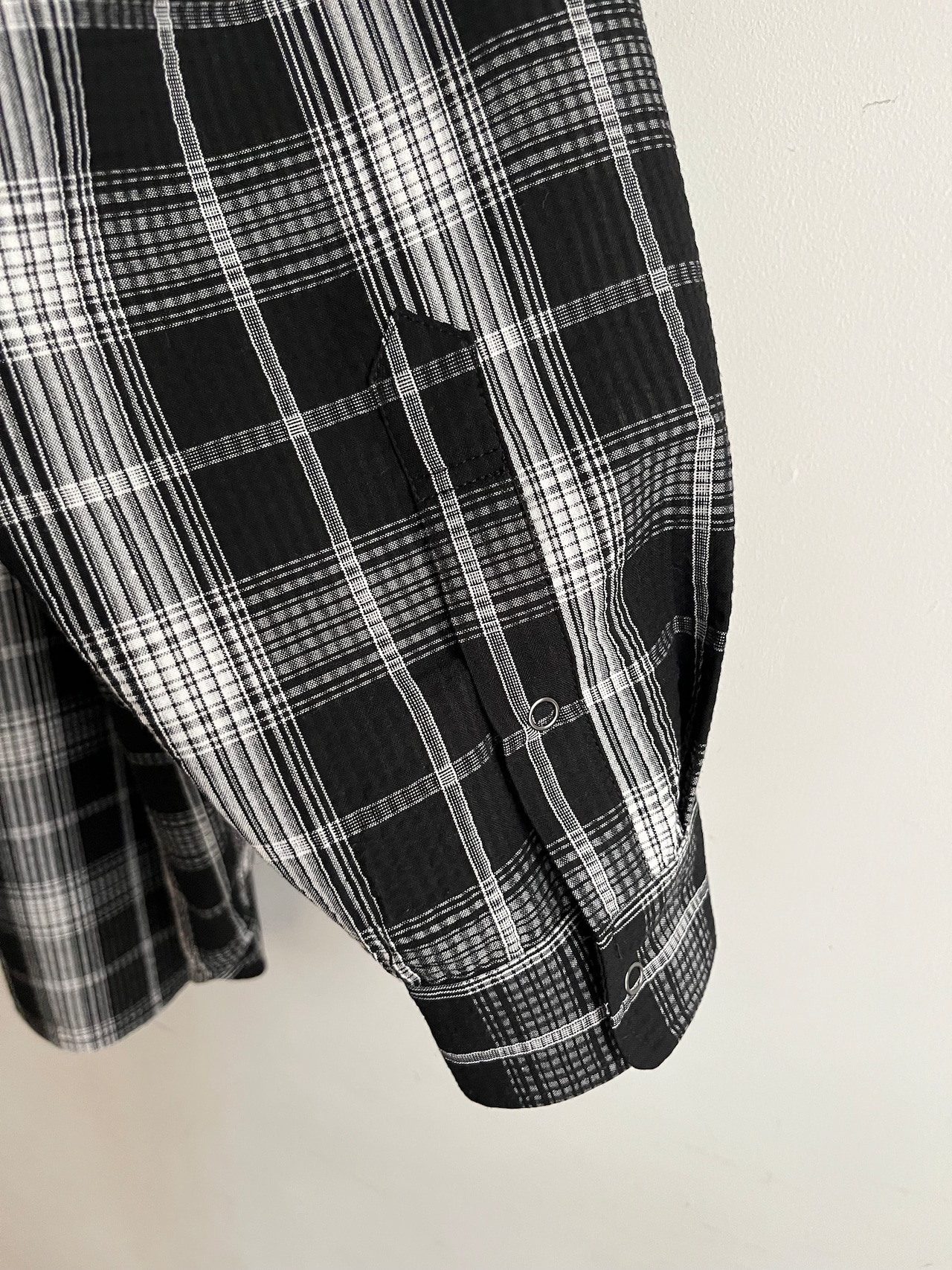 シアサッカーと呼ばれる表面の凹凸が特徴の生地を使用したチェック柄ビッグシャツ。コットン/ポリエステル混紡生地を加工することで出来るポコポコとした凹凸は肌離れが良く涼し気、暑い時期もおすすめの一着。チェック柄と凹凸が合わさることで表情のある生地感。ゆとり多めのオーバーサイズシルエットで袖をまくってのご着用、真夏の羽織りにもお勧めです。