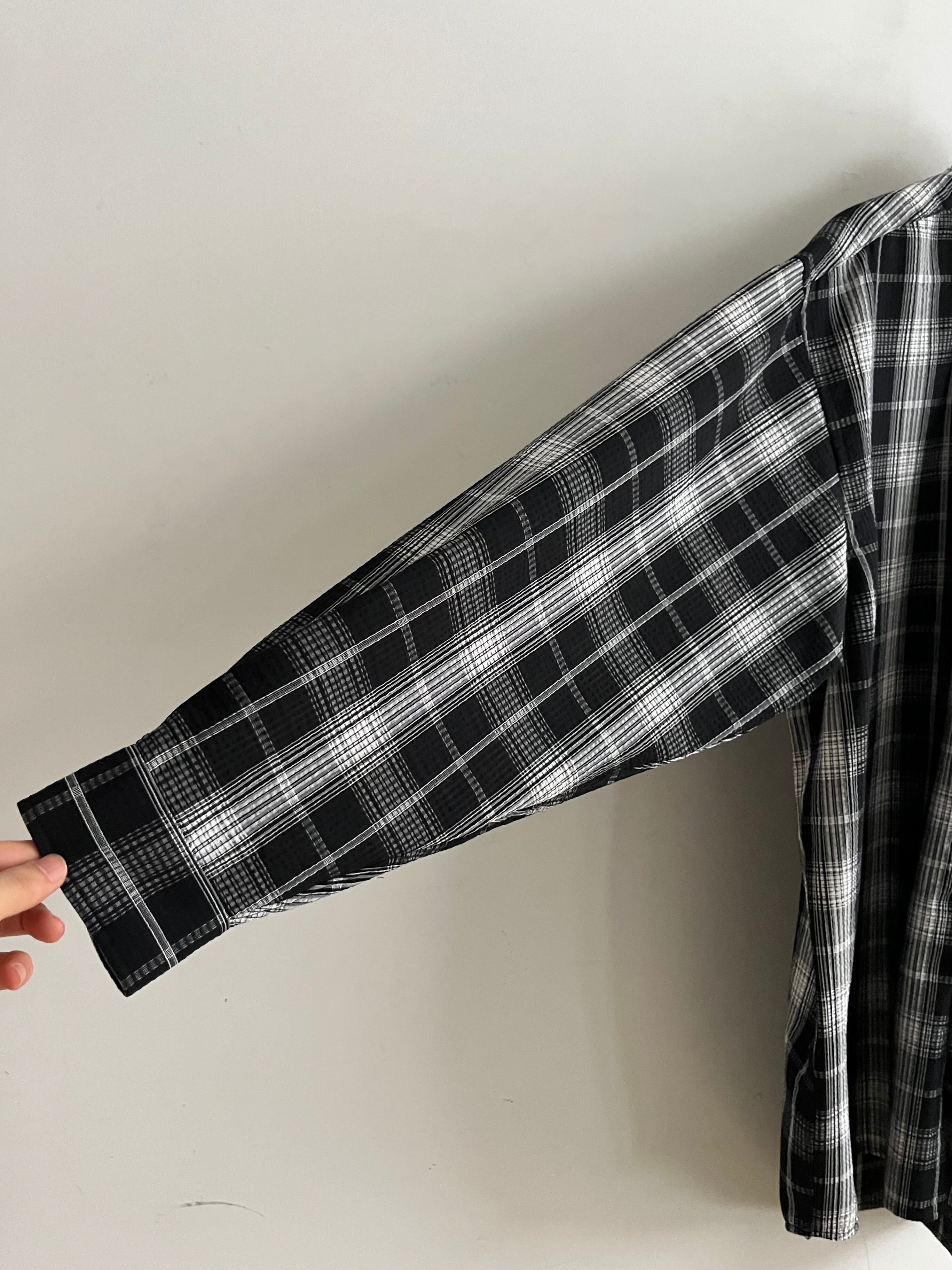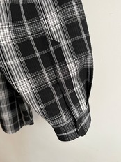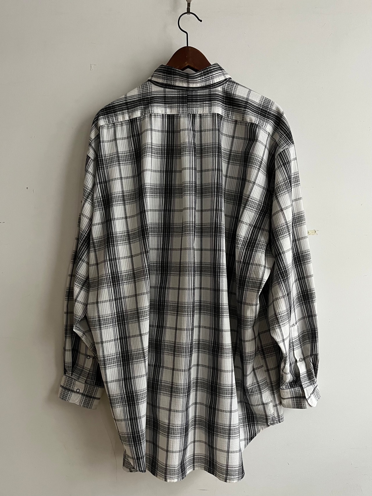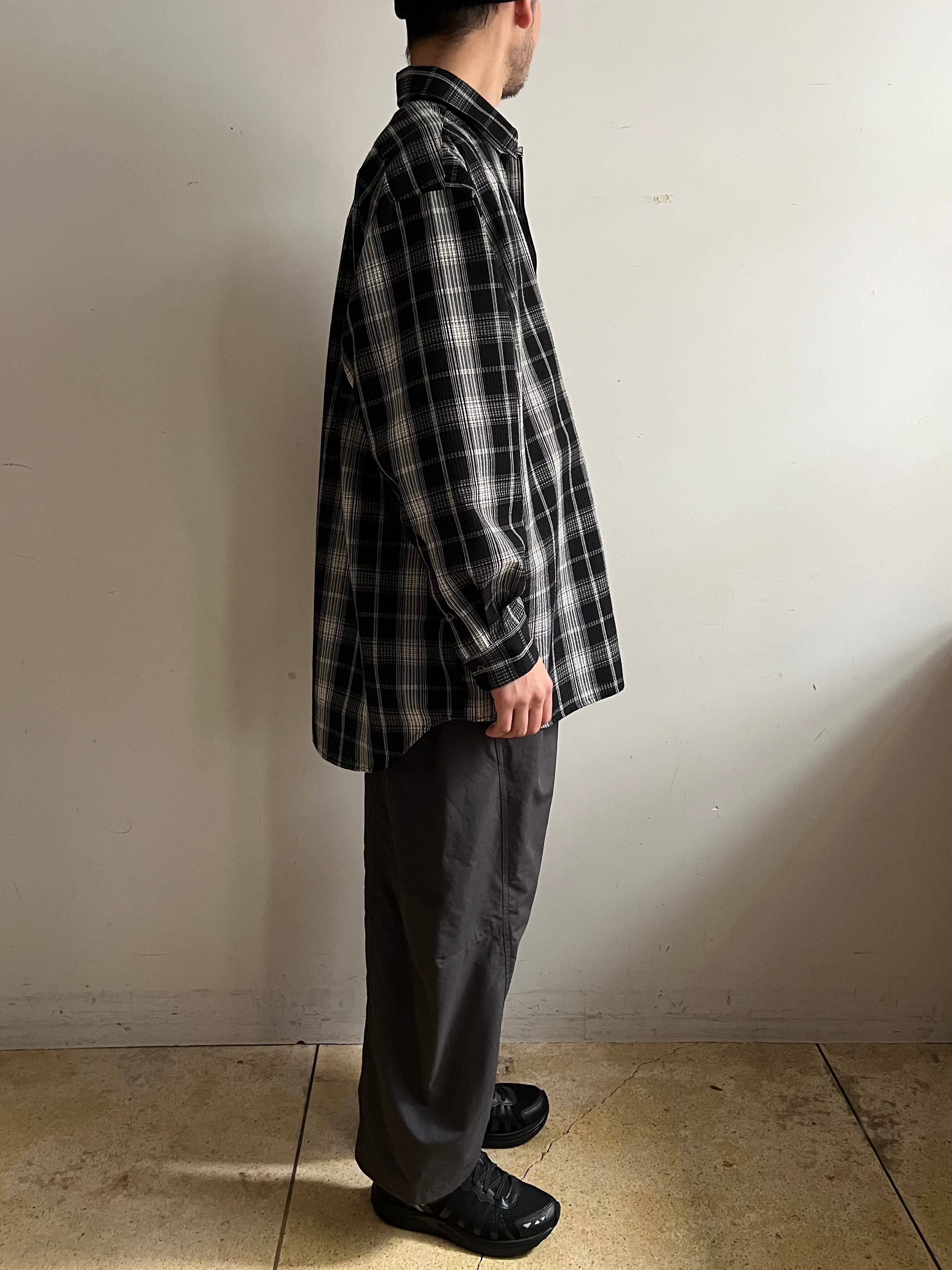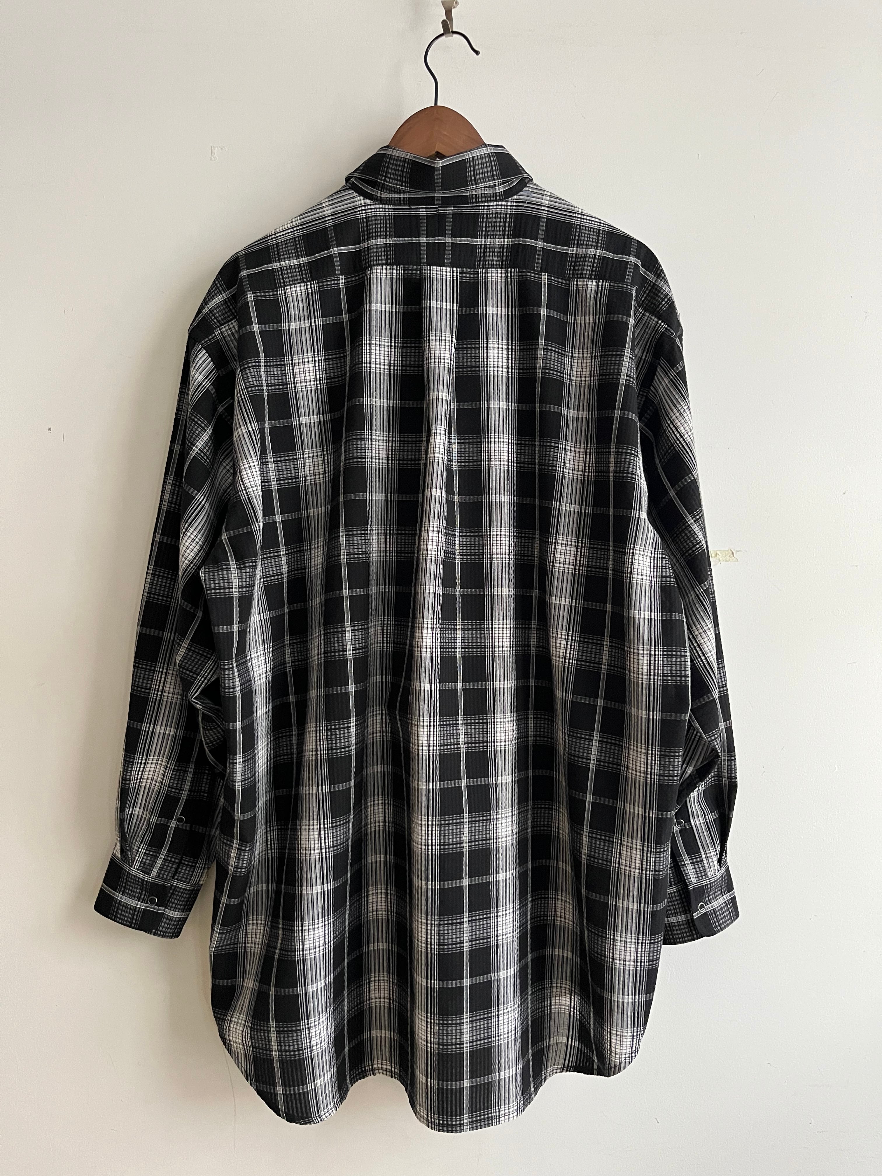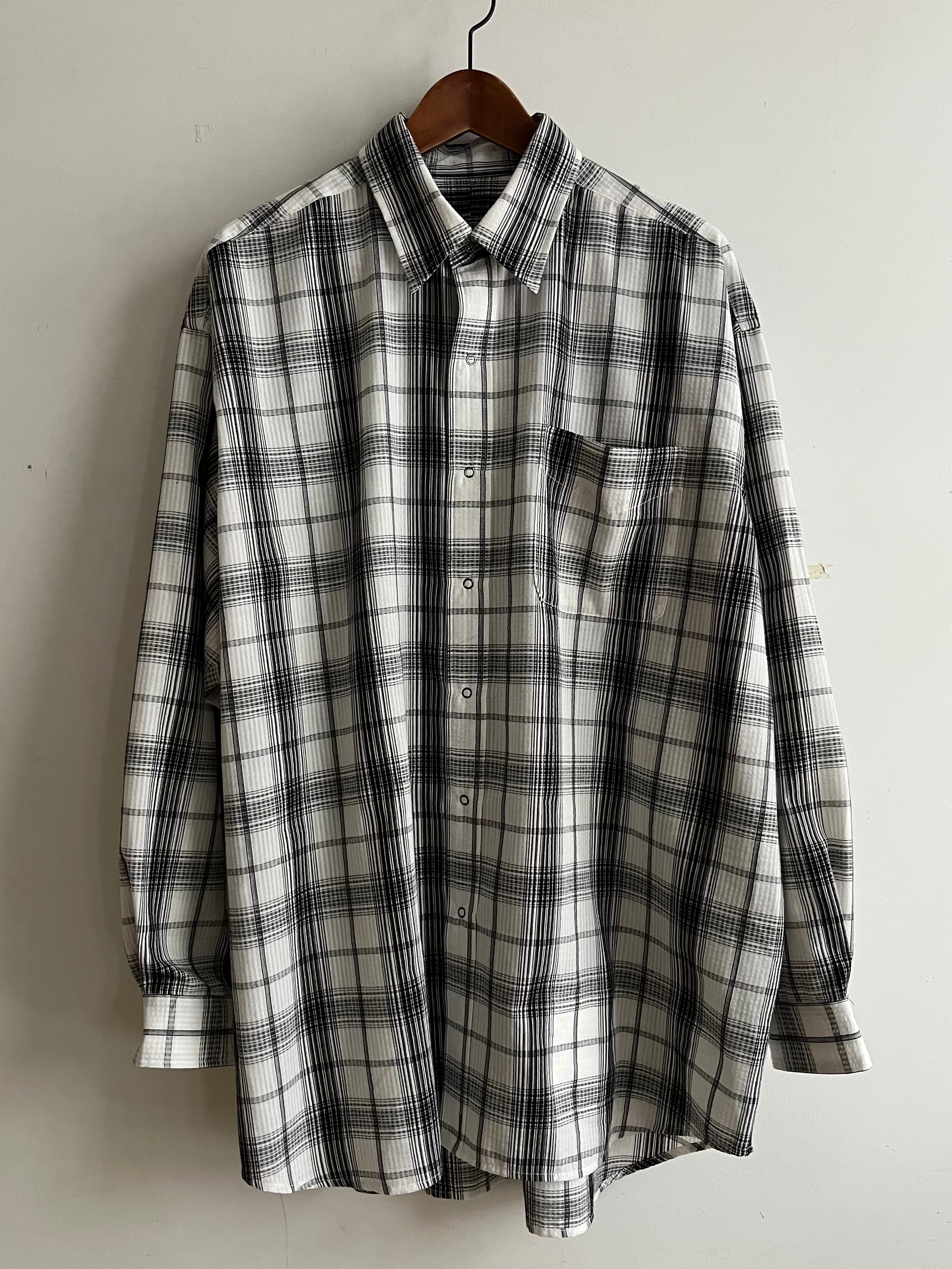 シアサッカーと呼ばれる表面の凹凸が特徴の生地を使用したチェック柄ビッグシャツ。コットン/ポリエステル混紡生地を加工することで出来るポコポコとした凹凸は肌離れが良く涼し気、暑い時期もおすすめの一着。チェック柄と凹凸が合わさることで表情のある生地感。ゆとり多めのオーバーサイズシルエットで袖をまくってのご着用、真夏の羽織りにもお勧めです。