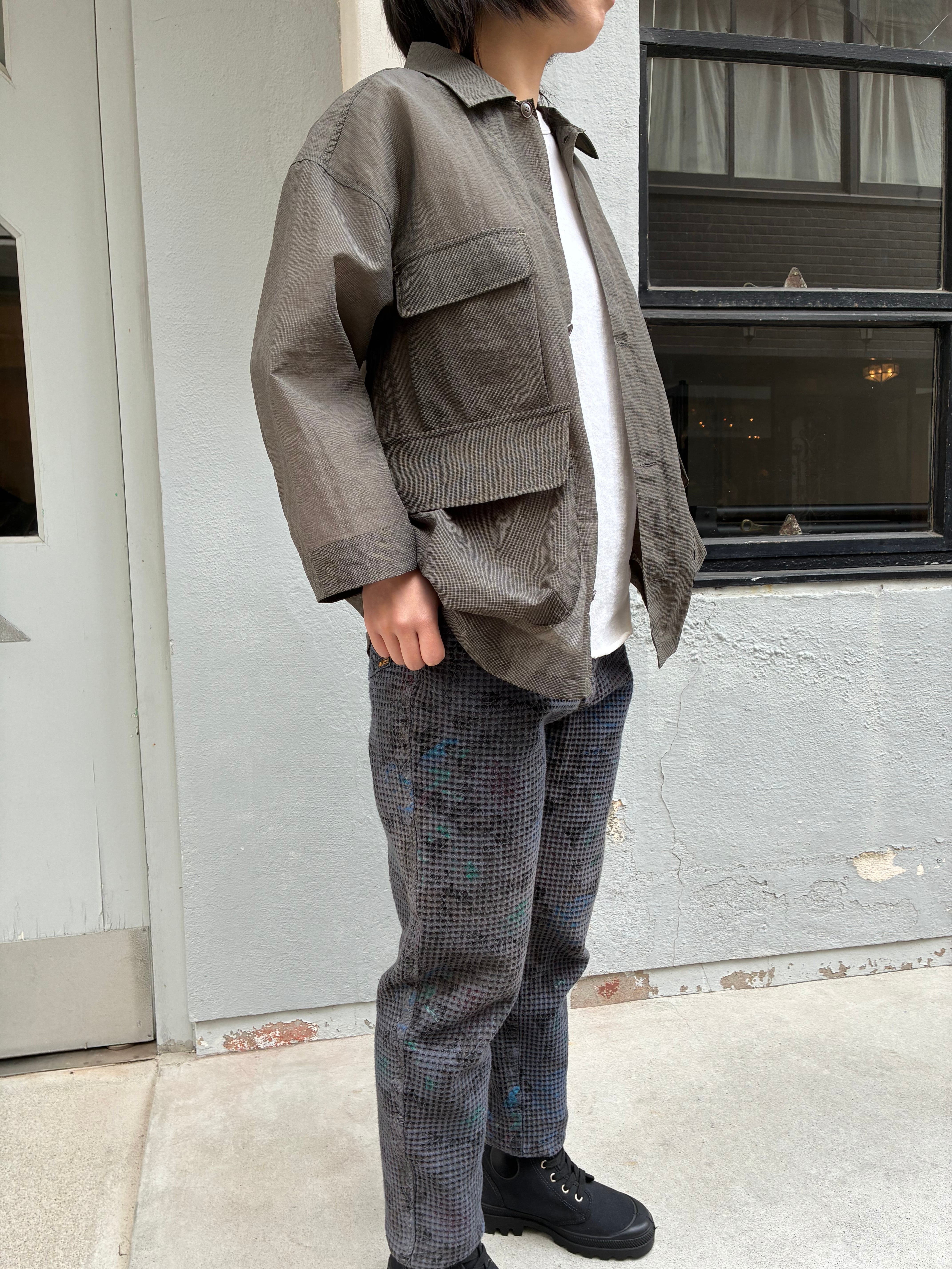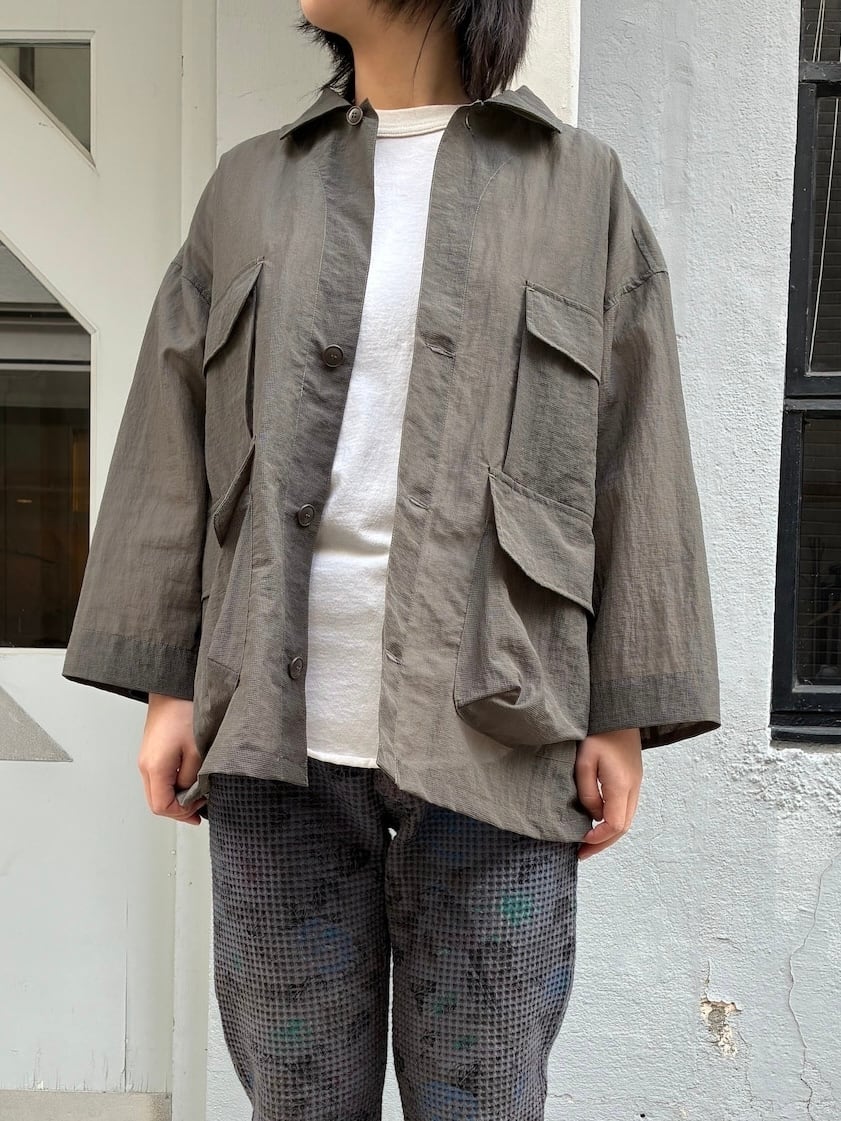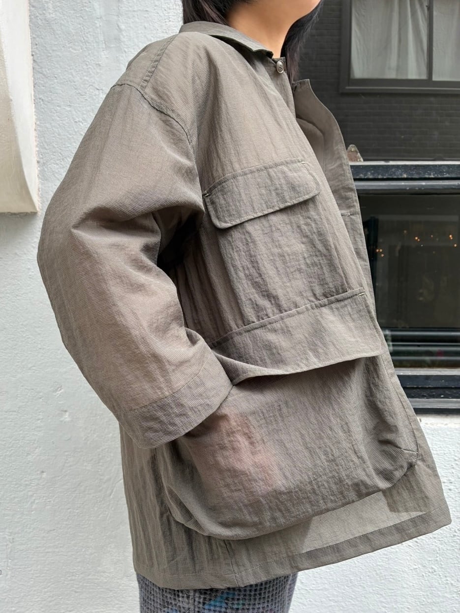 さらっとした肌触りのリップストップ素材を使用しており、軽く、ゆとりがあるので重ね着しやすいアイテムです。春先から夏場は羽織りとして、長い季節活躍します。